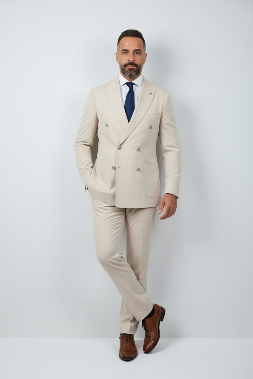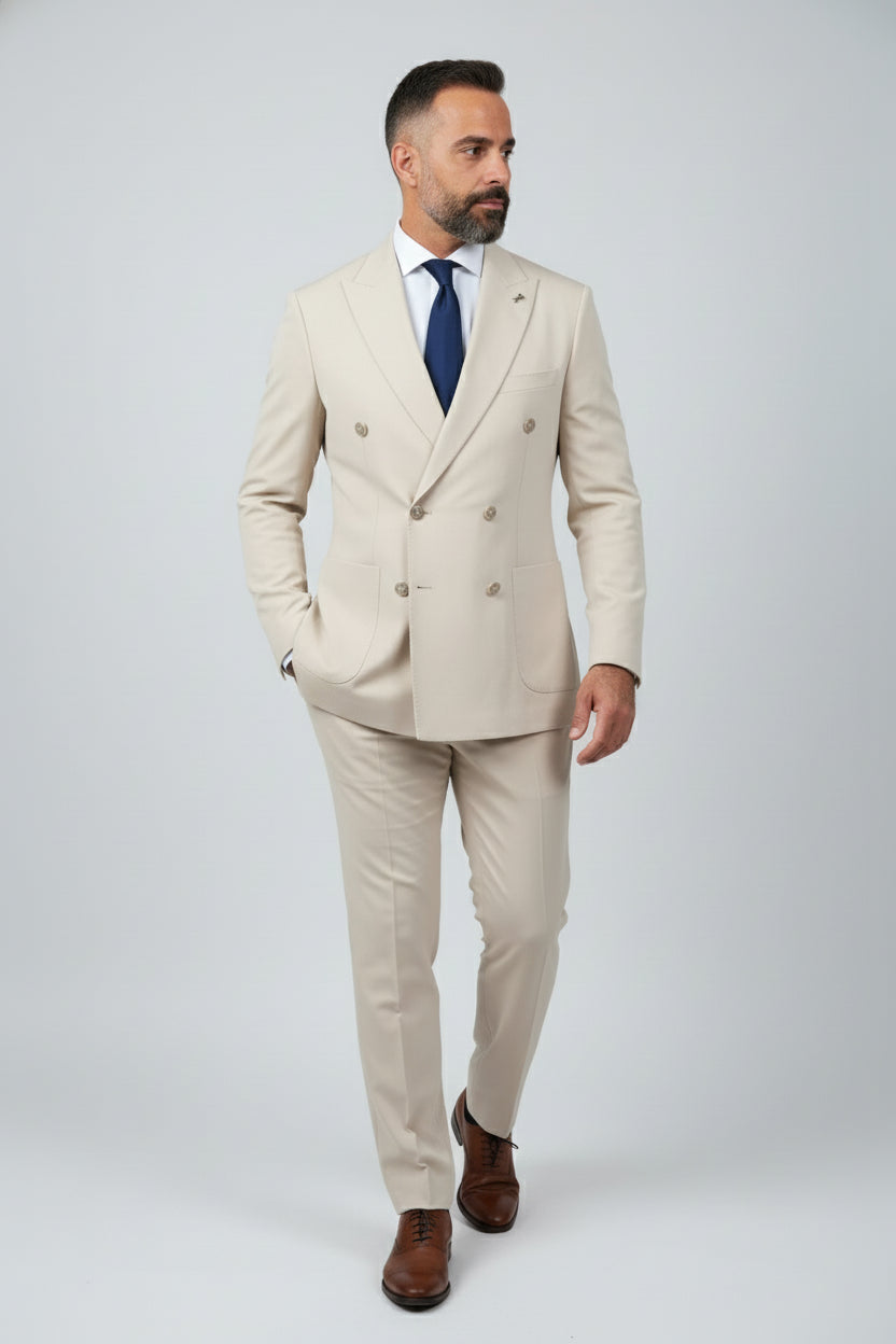 Command attention with this exquisite beige double-breasted tailored suit, perfect for upscale events and sophisticated gatherings. Crafted from premium materials, it embodies elegance and modernity.