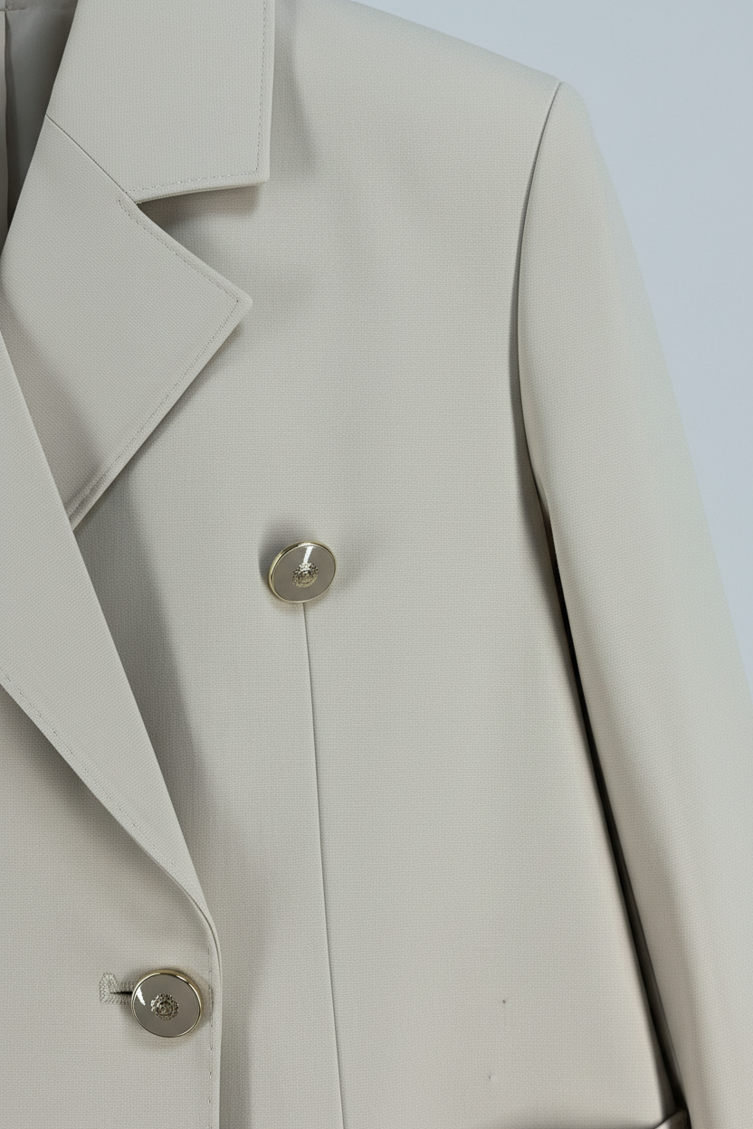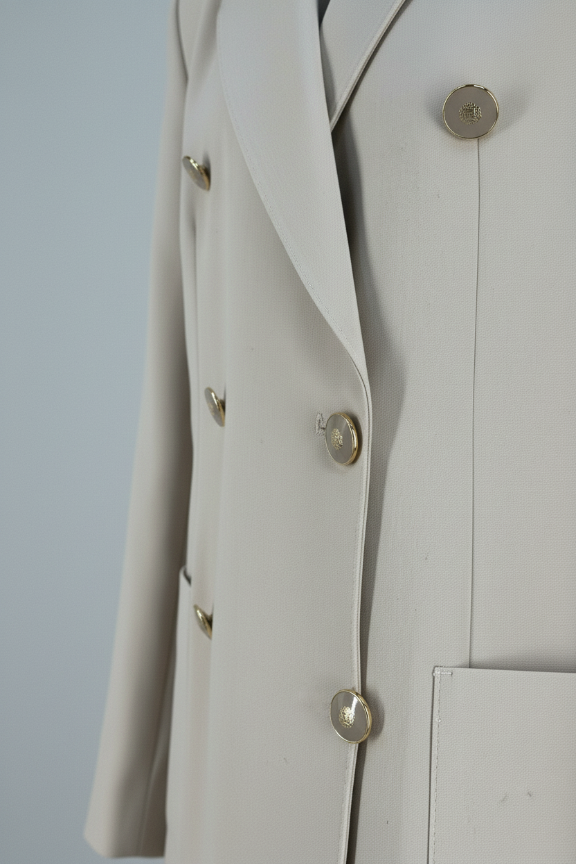 Details: double-breasted, gold buttons, unique pockets