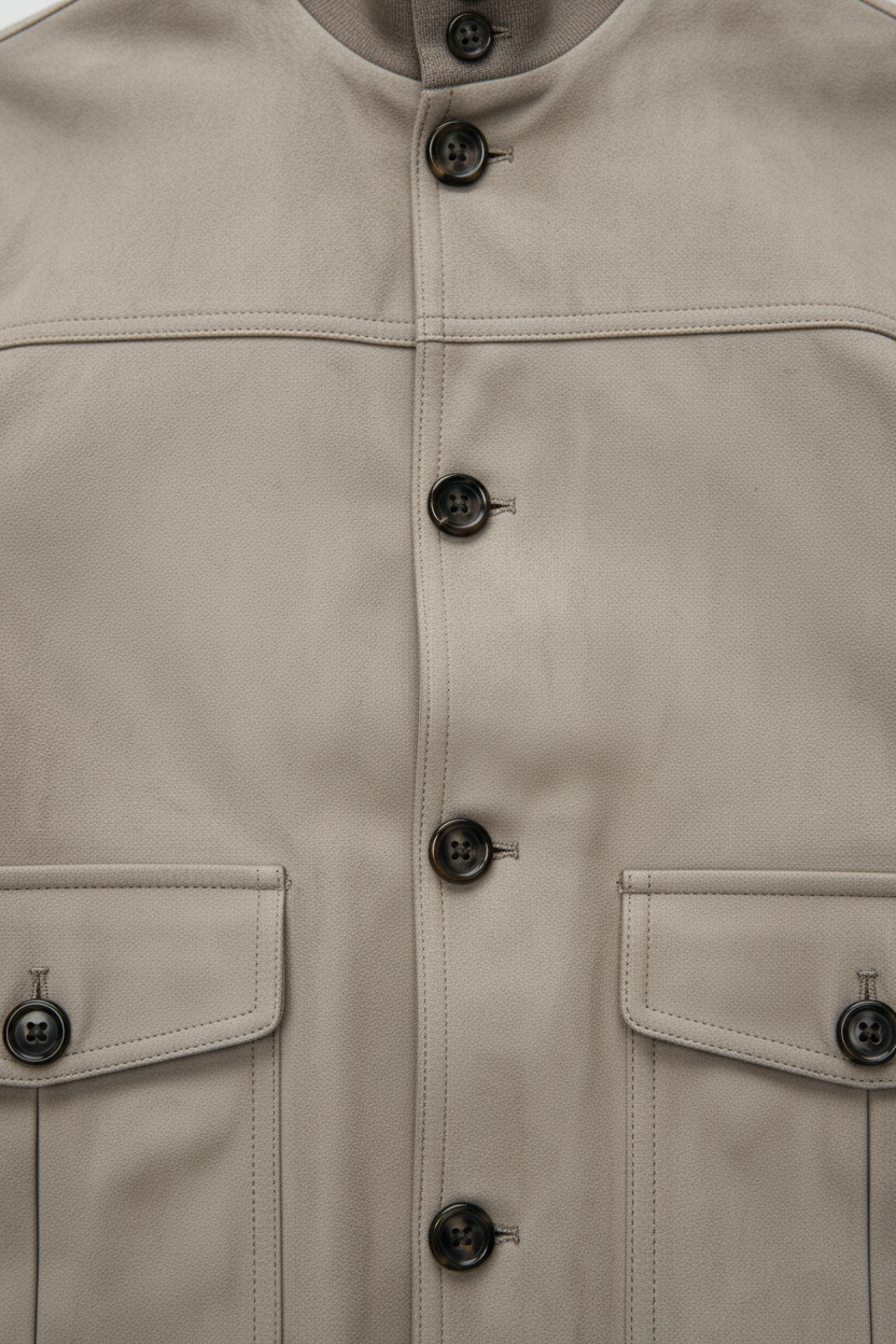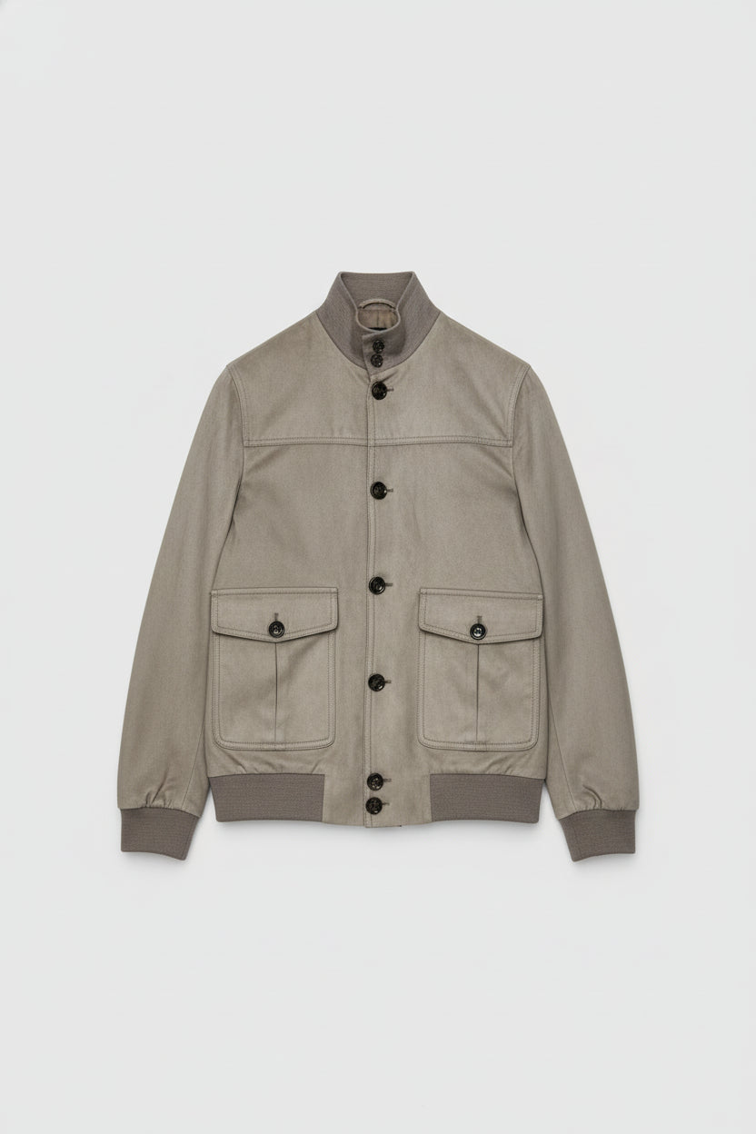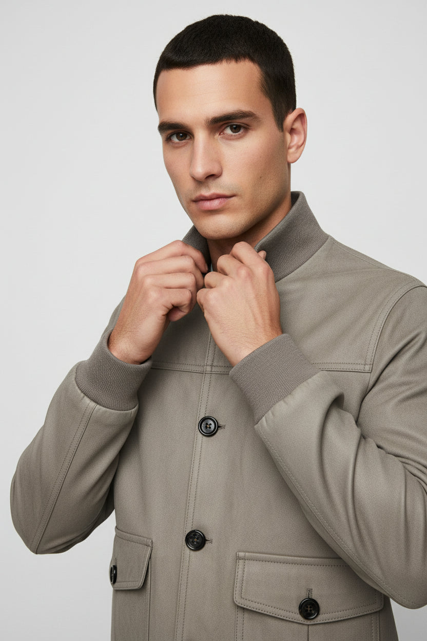 The minimalist design features a front zip closure, ribbed cuffs, collar, and hem, and angled side pockets that add practicality without compromising on aesthetics. The neutral beige tone gives it remarkable versatility — easy to pair with trousers, chinos, or denim for any occasion.