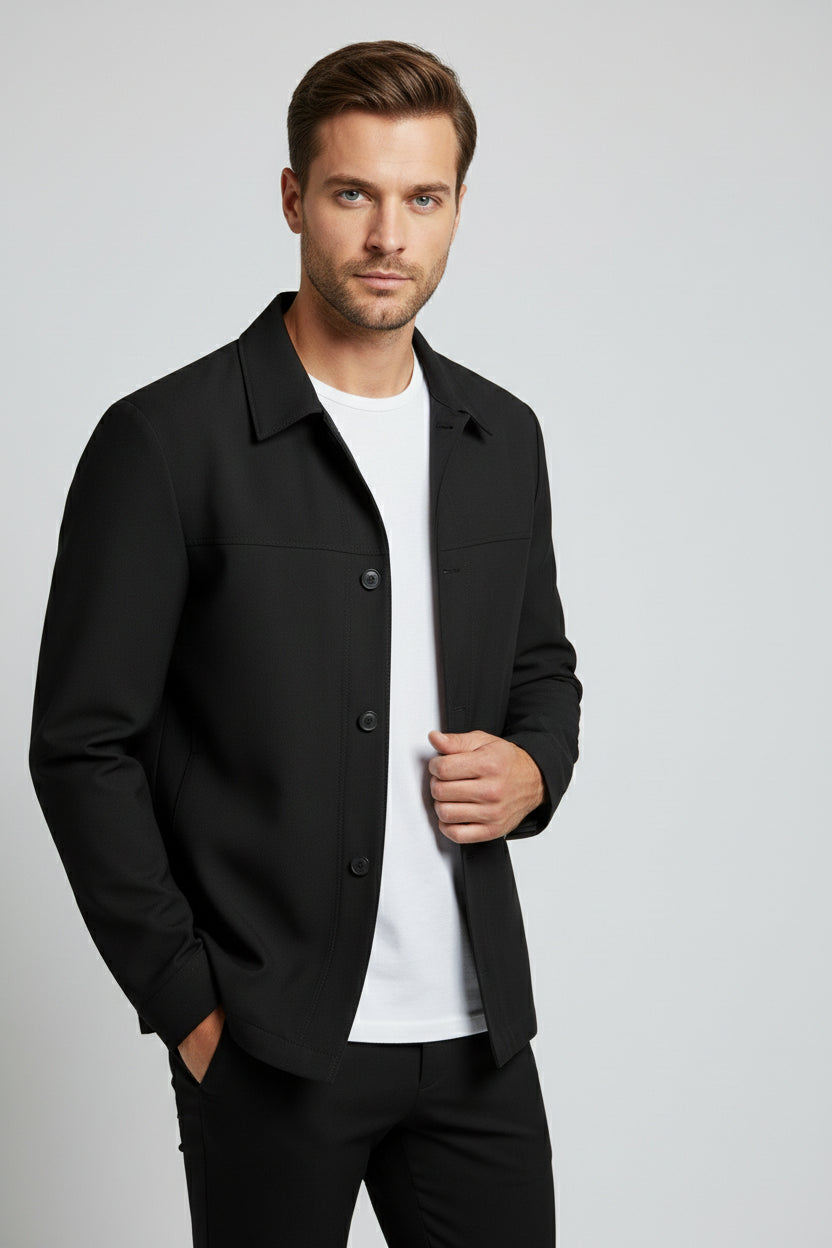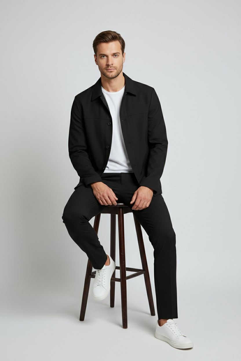 This Black Safari Suit presents a bold, modern interpretation of relaxed tailoring. Designed with a clean safari-style jacket, it features a structured yet effortless silhouette that delivers confidence without excess formality. The straight collar design and clean button closure create a sharp, contemporary look that stands apart from traditional lapel tailoring. Paired with tailored trousers, the suit maintains a streamlined profile while remaining versatile and understated. Crafted from premium fabric, this piece is ideal for evening settings, smart casual occasions, and modern urban styling where sophistication meets ease.