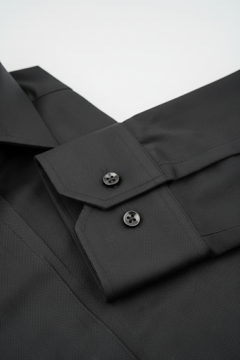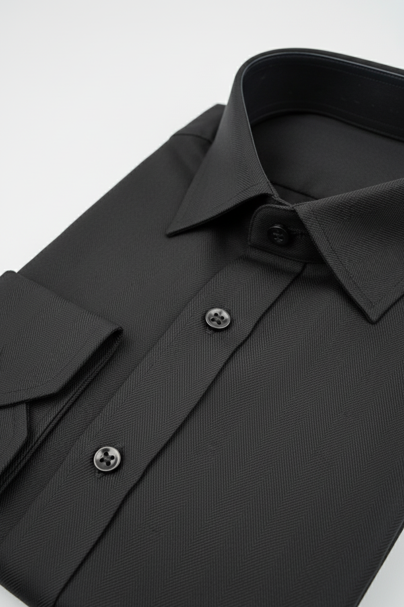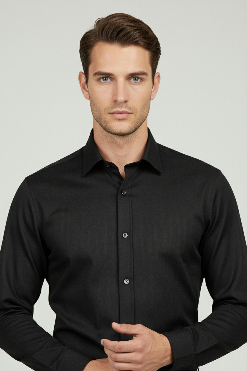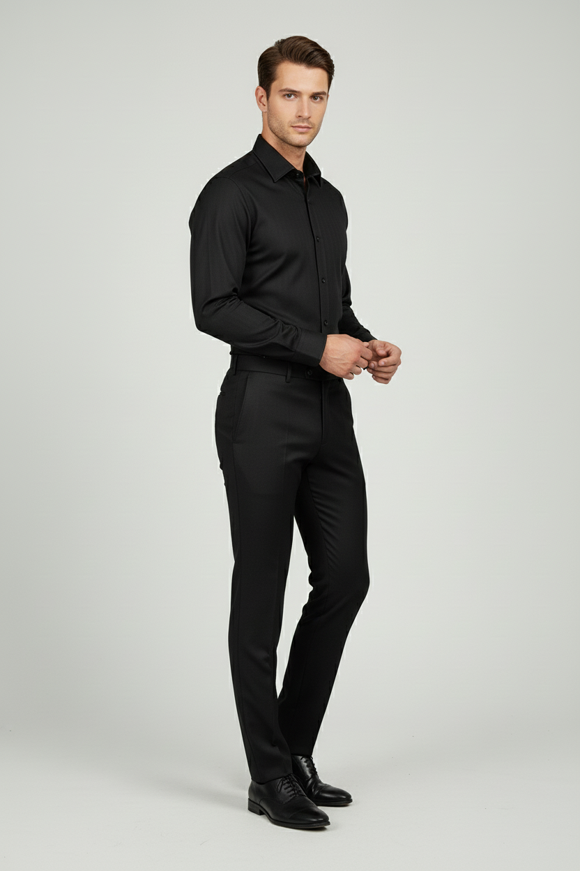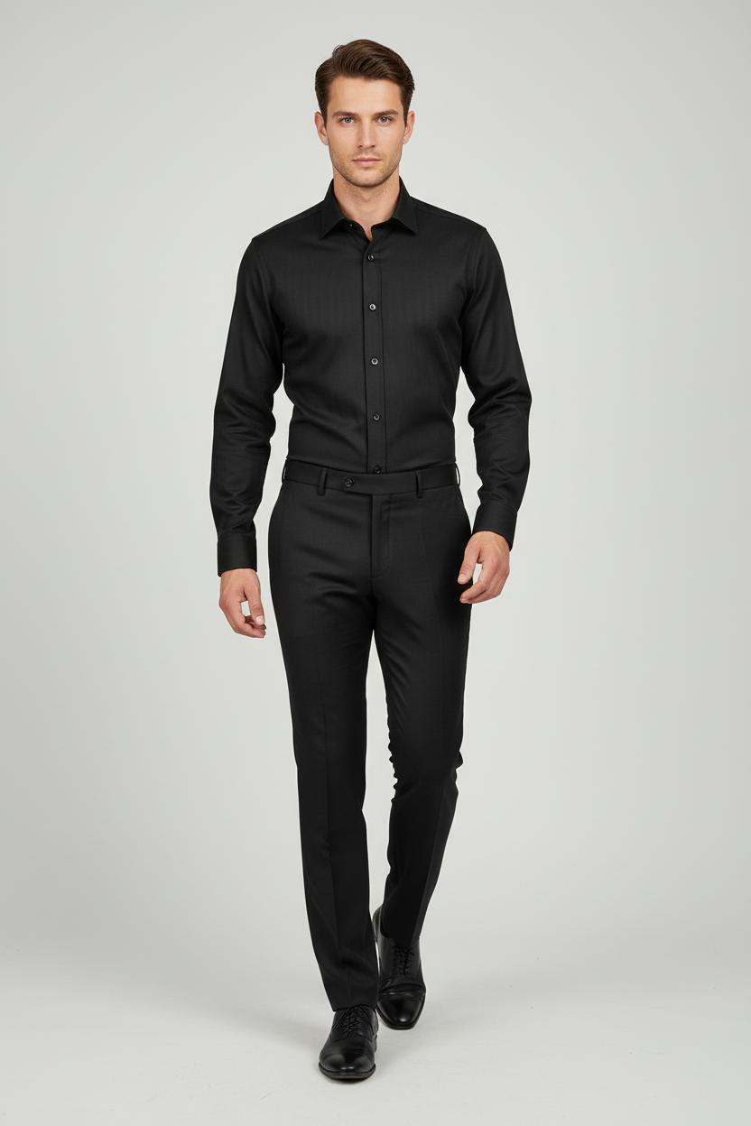 Elegant and timeless, the Black Dress Shirt delivers a perfect balance of sophistication and modern edge. Designed with a sharp collar and clean tailoring, it complements any suit or can be worn solo for a sleek, confident look. The deep black tone adds depth and refinement, making it a go-to choice for both formal and evening occasions.