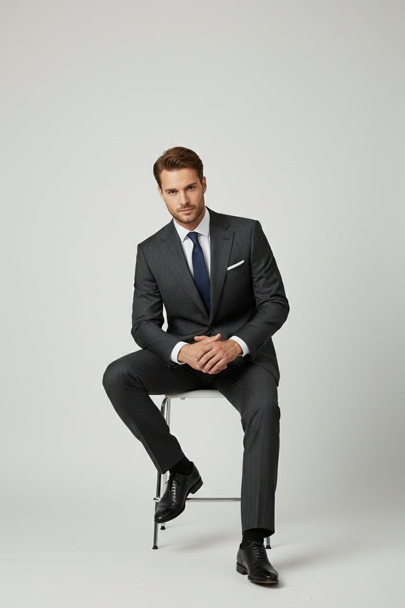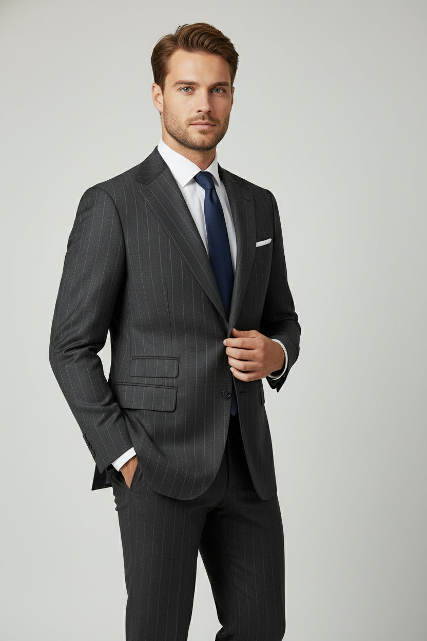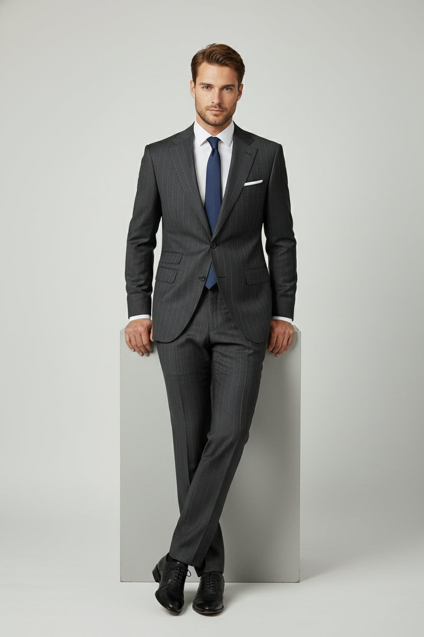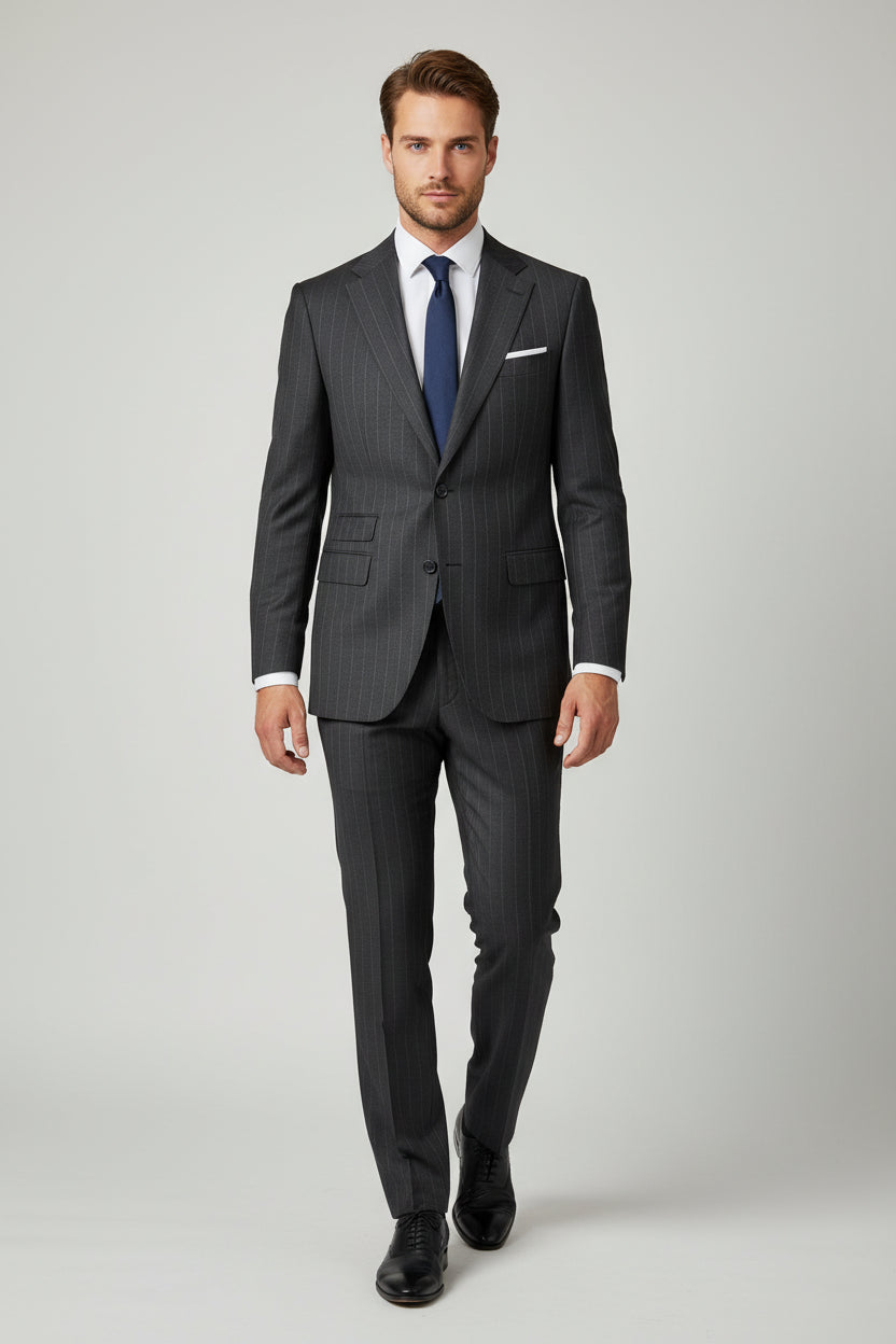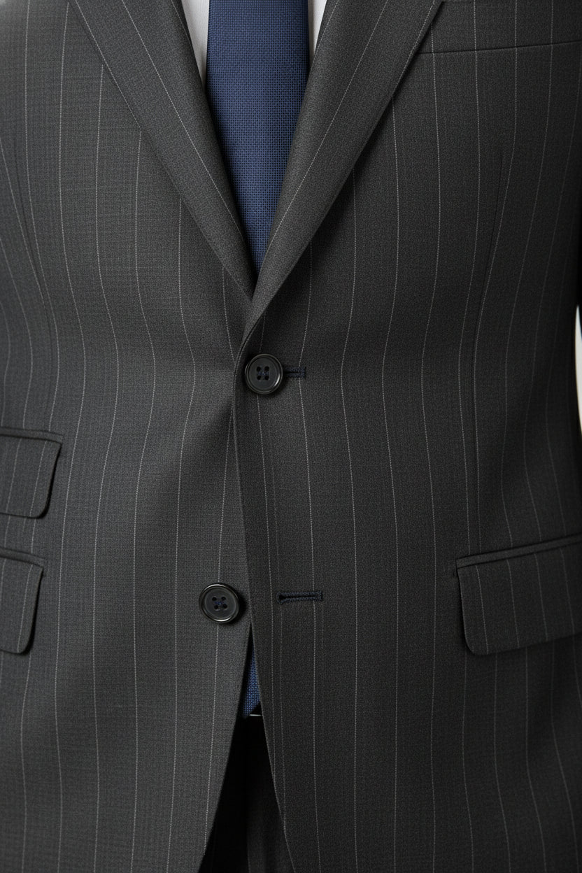 A refined black two-piece suit featuring subtle vertical pinstripes that enhance structure and create a sharp, elongated silhouette. Designed with a classic single-breasted jacket, notch lapels, and a clean two-button closure, this suit delivers timeless elegance with a modern tailored fit. Ideal for business wear, formal occasions, and professional settings where precision and confidence matter.