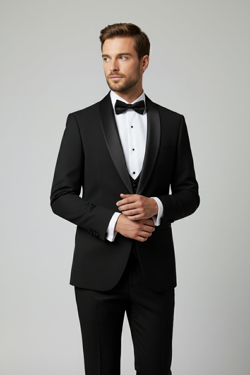 A timeless black tuxedo designed for refined evening elegance. Tailored with a single-breasted silhouette, this piece features sleek satin shawl lapels that create a smooth, uninterrupted line across the chest. The jacket is structured through the shoulders with a clean, sculpted fit, paired with matching tailored trousers for a sharp, formal finish. Styled traditionally with a crisp white dress shirt and black bow tie, this tuxedo is crafted for black-tie events, weddings, and formal occasions where classic sophistication is essential.