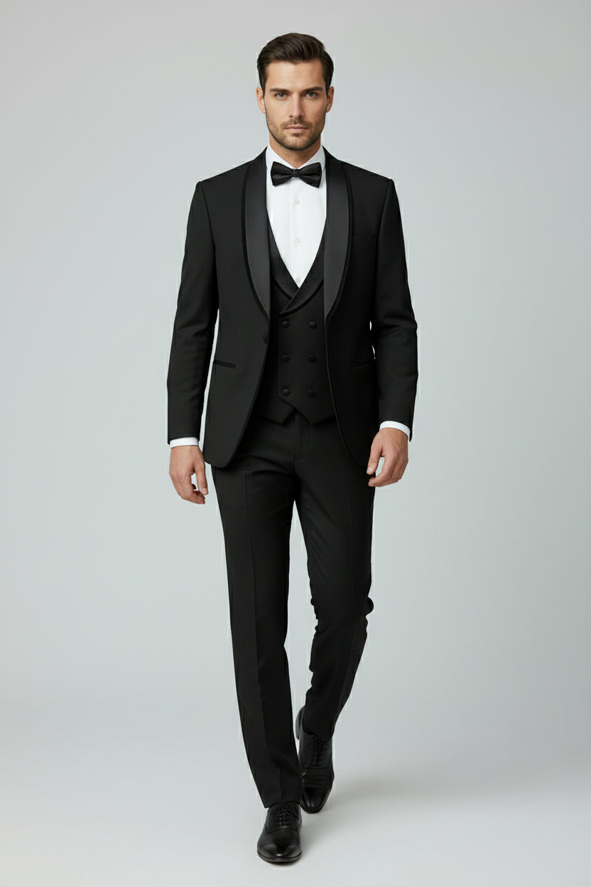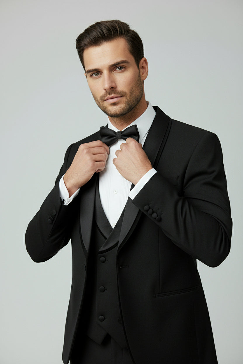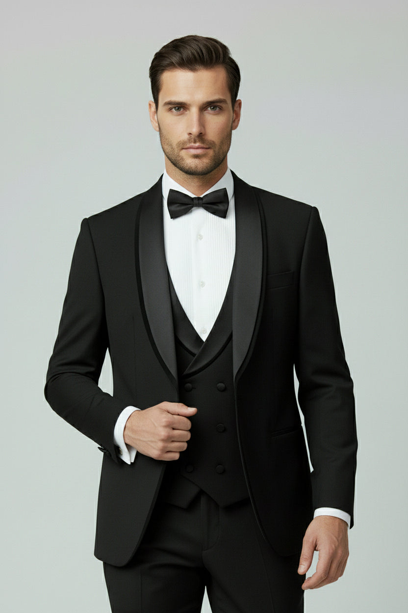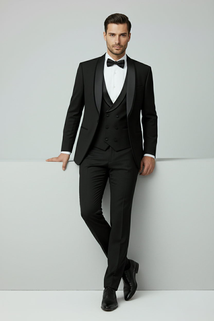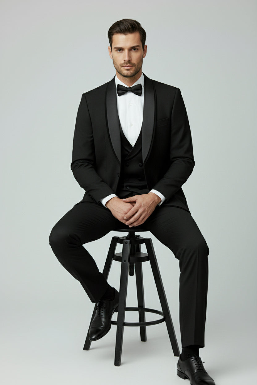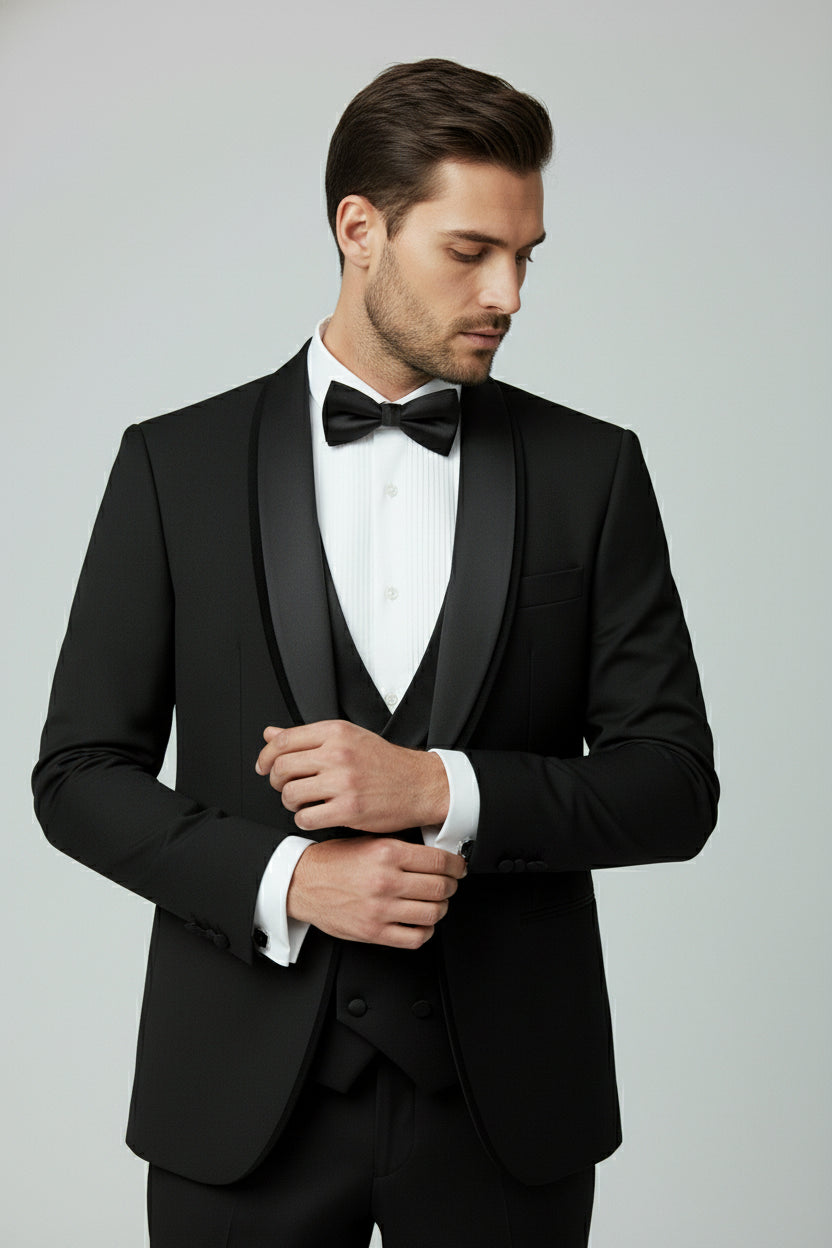 The Black Satin Lapel Tuxedo with Velvet Detail embodies the pinnacle of refined eveningwear — where craftsmanship meets understated luxury. Designed for the modern gentleman who values both sophistication and presence, this tuxedo stands out with its lustrous satin shawl lapel and subtle velvet-trimmed pockets and cuffs that add depth and texture to its classic black silhouette.