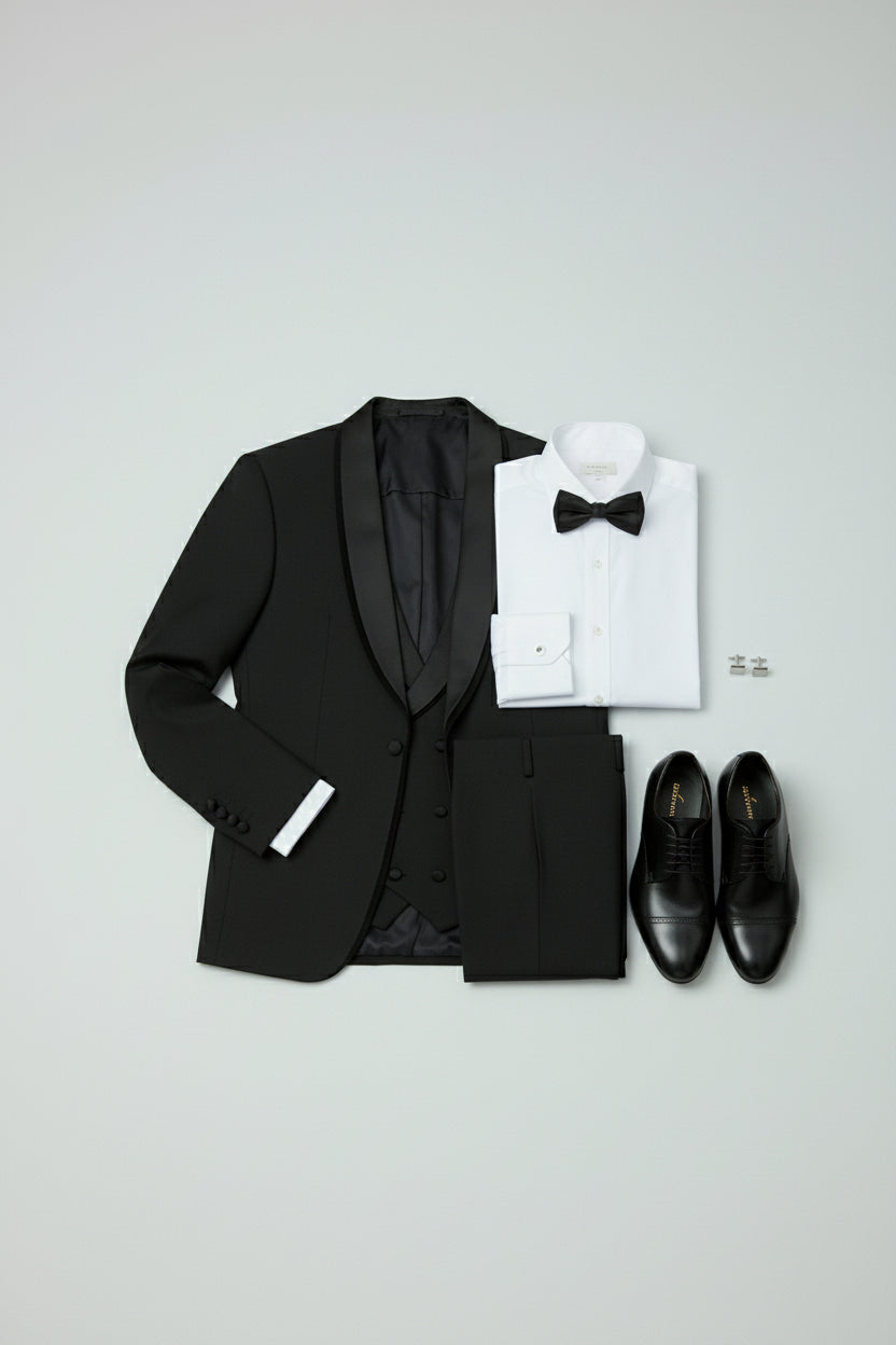 Crafted from premium performance suiting fabric, it ensures an impeccable drape and all-night comfort. The single-button closure maintains a clean, streamlined shape, while the matching double-breasted vest with satin detailing adds an extra layer of elegance and formality.