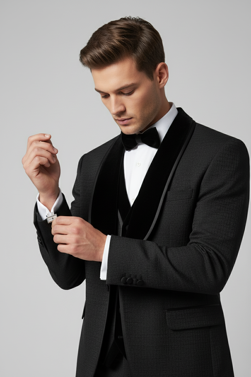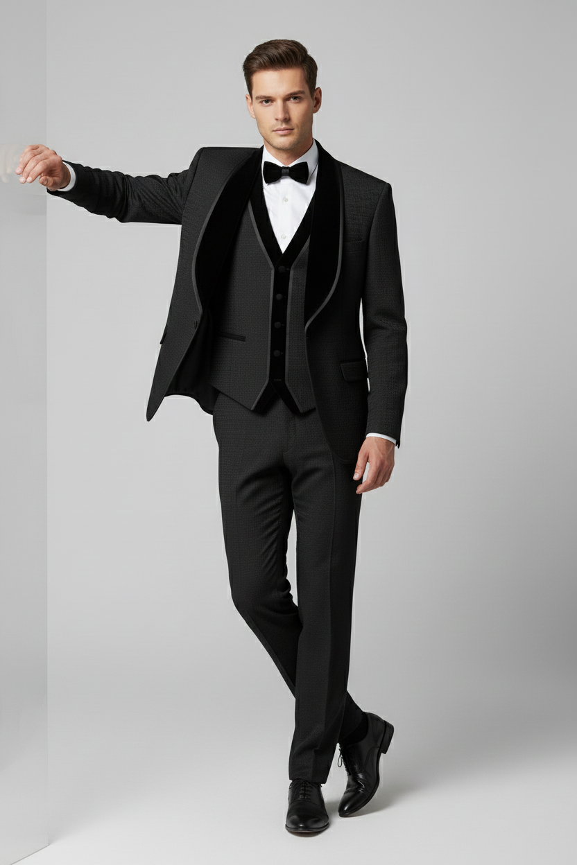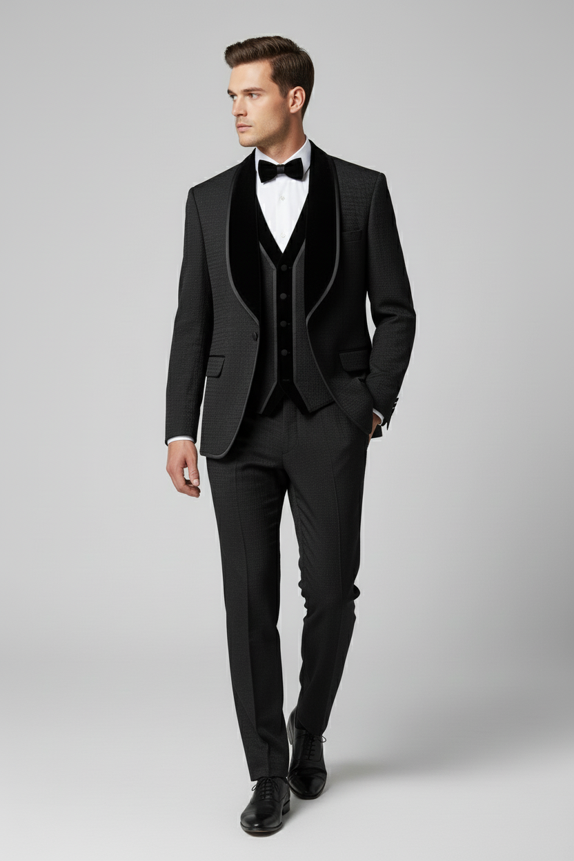 Command attention in our exquisite Black Shawl Collar Velvet Tuxedo, designed for those who appreciate sophistication. Perfect for formal occasions, this tuxedo combines luxury with timeless elegance.