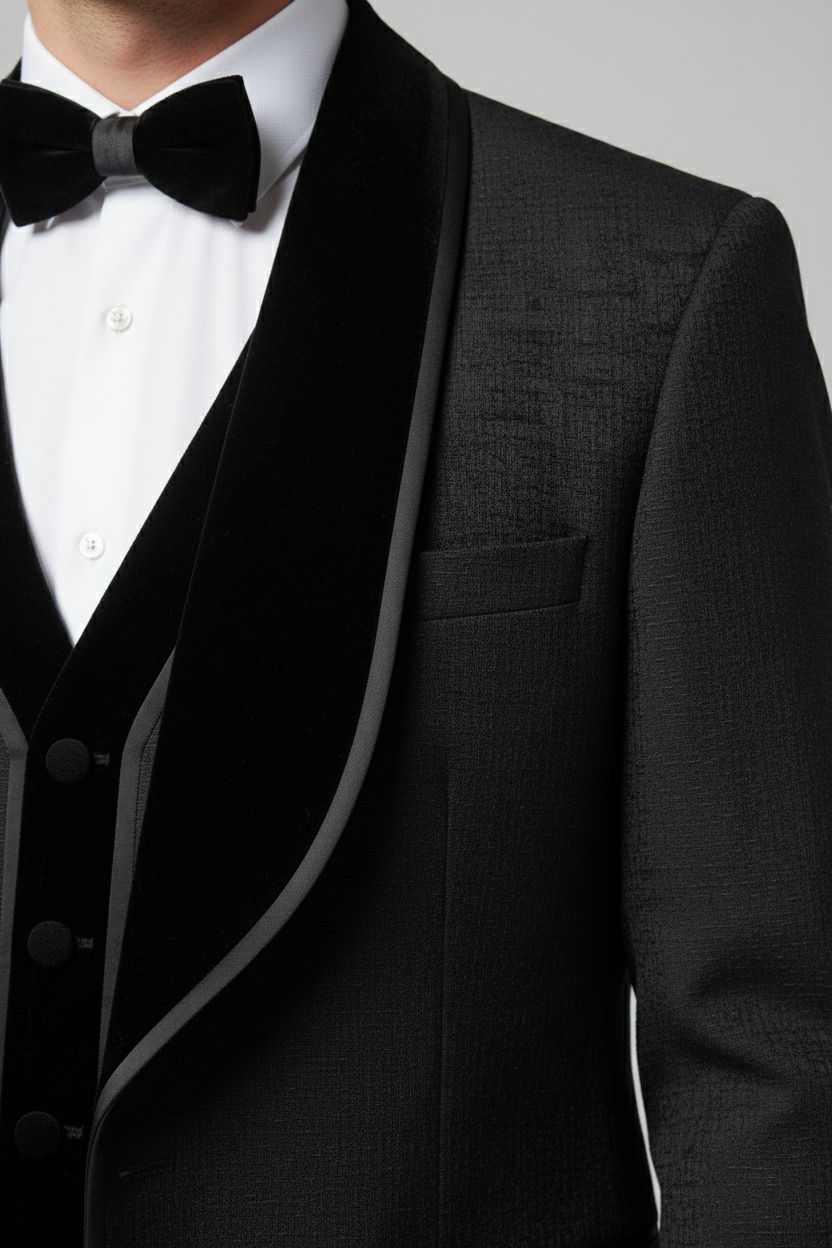 Details: Shawl collar, velvet fabric, tailored fit, textured finish