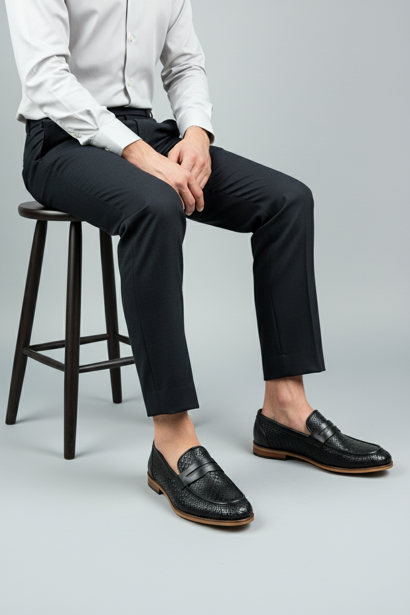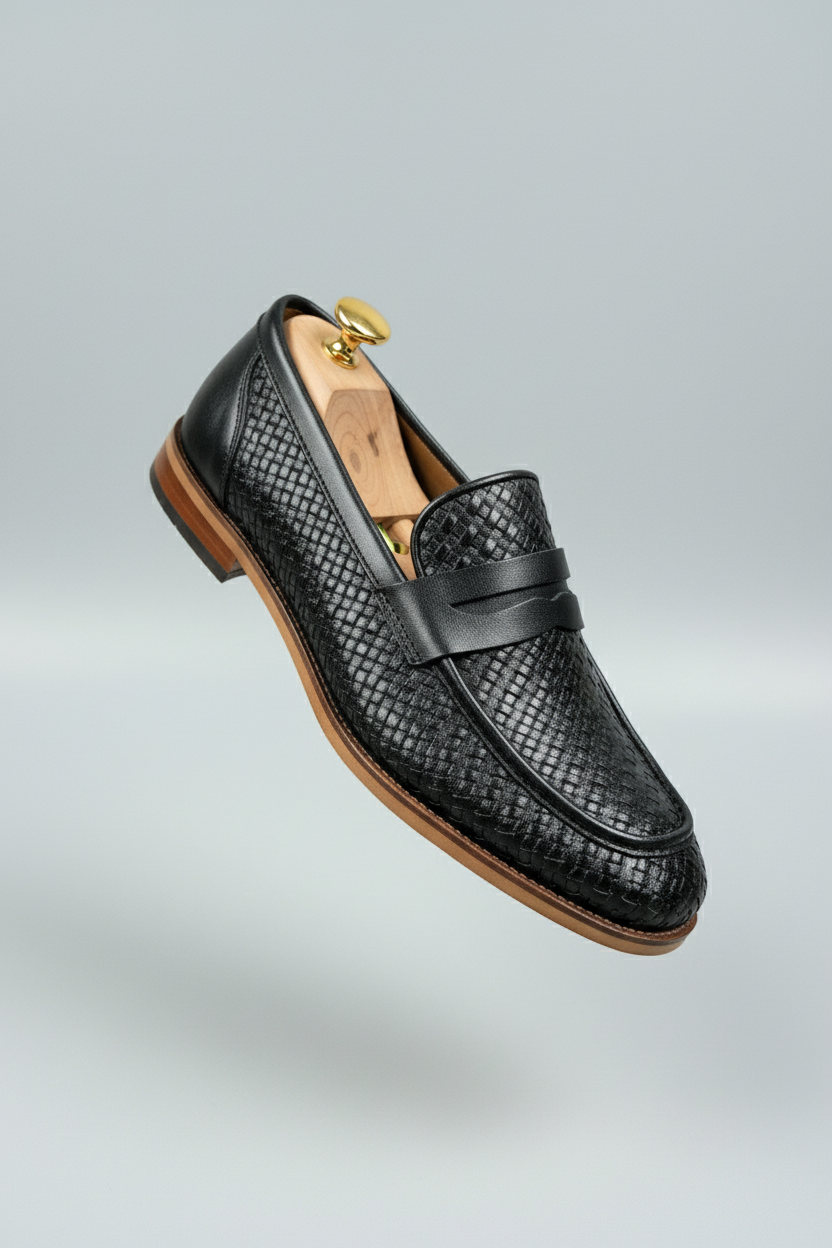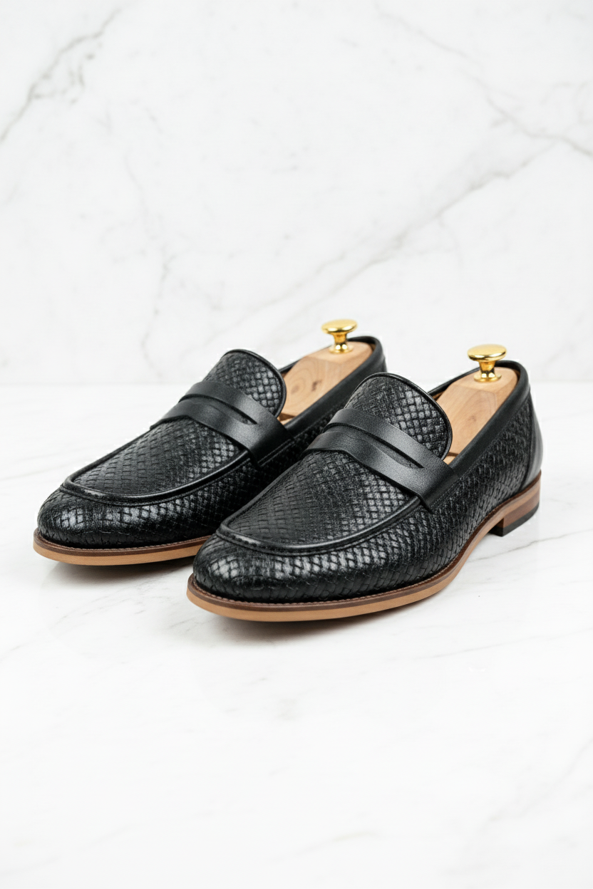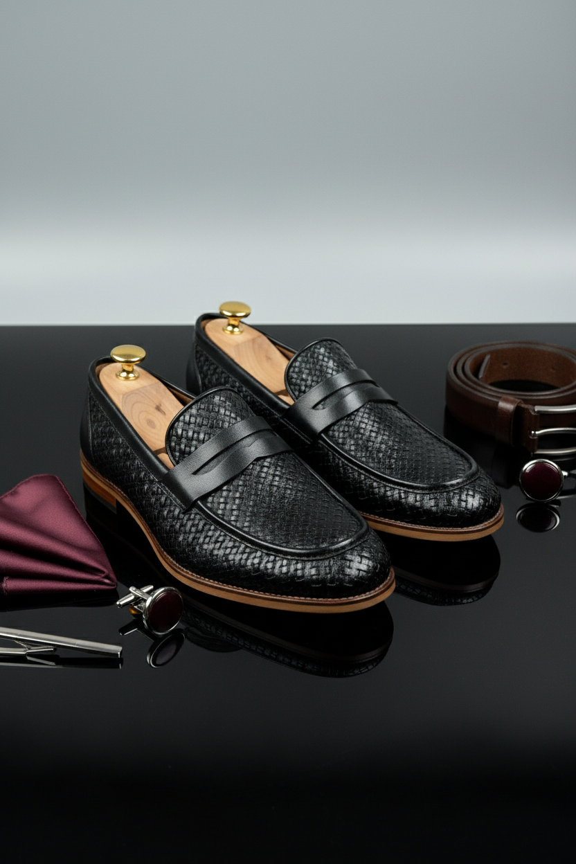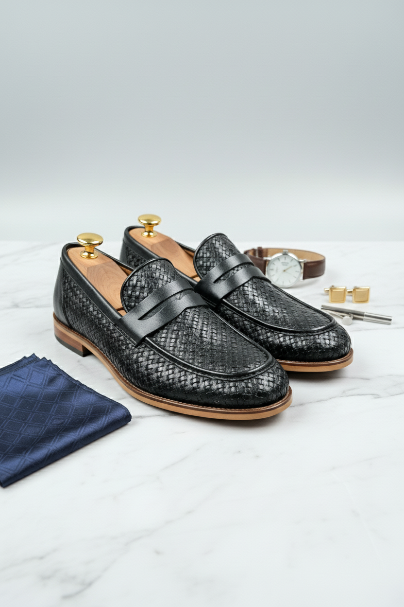 Embrace unparalleled sophistication with our Black Woven Leather Loafers, expertly crafted to elevate your casual and semi-formal ensembles.