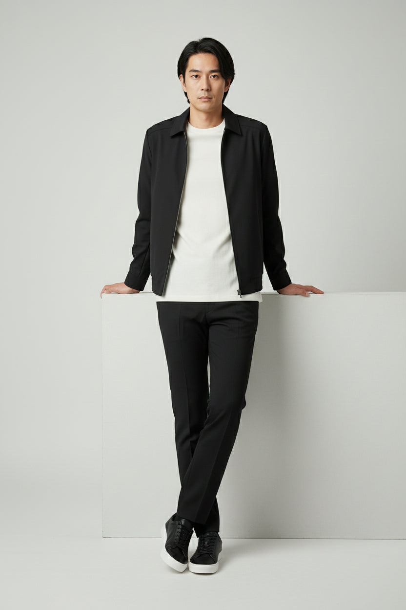 This Black Zip-Up Safari Suit delivers a clean and contemporary interpretation of relaxed tailoring. Designed with a minimalist safari-style jacket, it features a straight collar and sleek front zip closure that create a sharp, streamlined profile. The silhouette is balanced and modern, offering ease without sacrificing structure. Tailored trousers complete the look with a refined, tapered finish. Crafted from polyamid fabric, this suit is lightweight, flexible, and well suited for smart casual environments, travel, and elevated everyday wear with a modern edge.