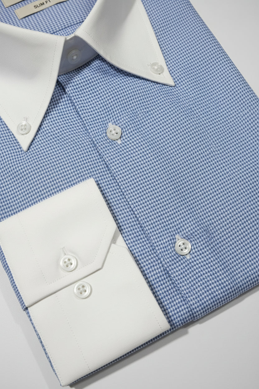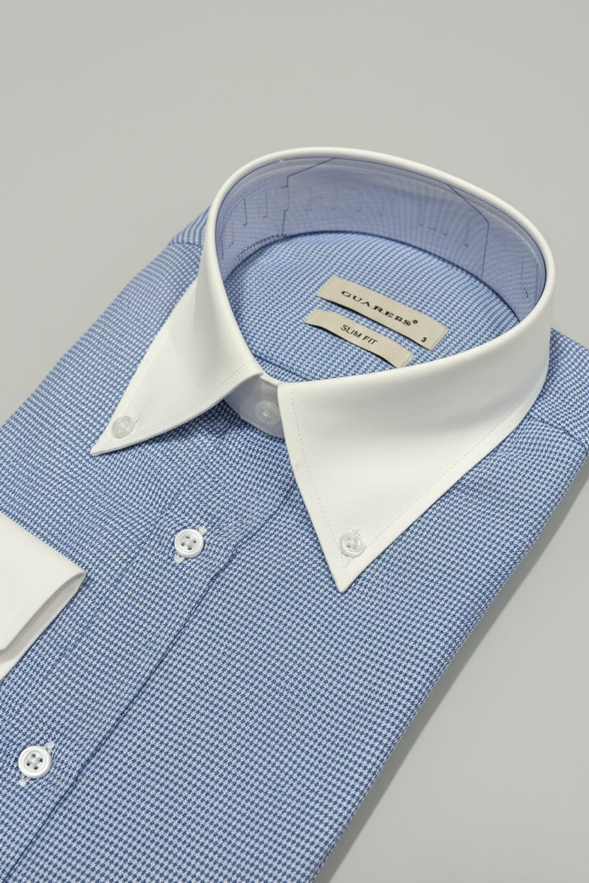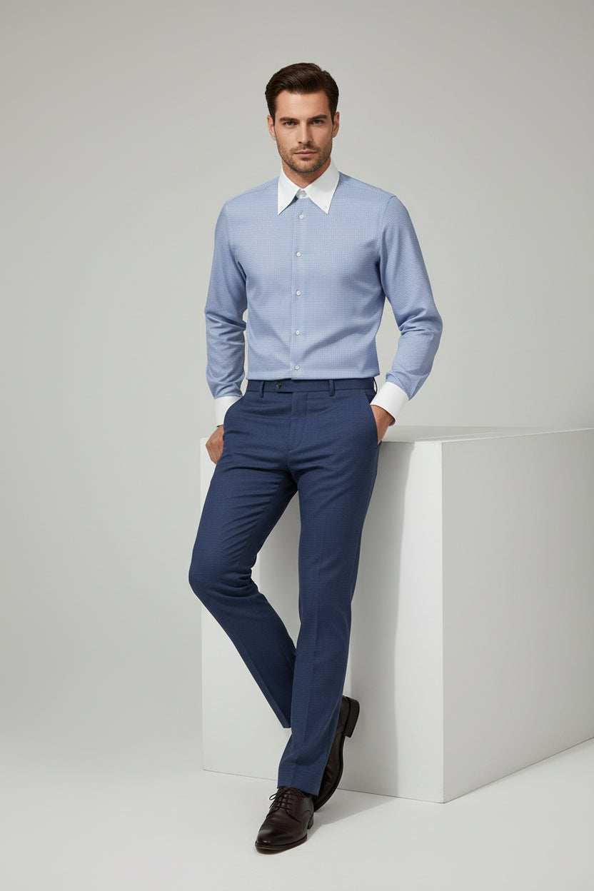 This Blue Micro-Pattern Contrast Collar Shirt delivers sharp contrast and refined detail in one clean design. Featuring a fine textured micro pattern across the body, it is elevated by a crisp white contrast collar and matching cuffs for a distinctive, tailored finish. The classic pointed collar and clean button closure maintain a structured, polished silhouette suitable for formal and professional environments. Crafted from premium fabric, this shirt is ideal for business settings, formal occasions, and elevated daily dressing where subtle contrast defines sophistication.