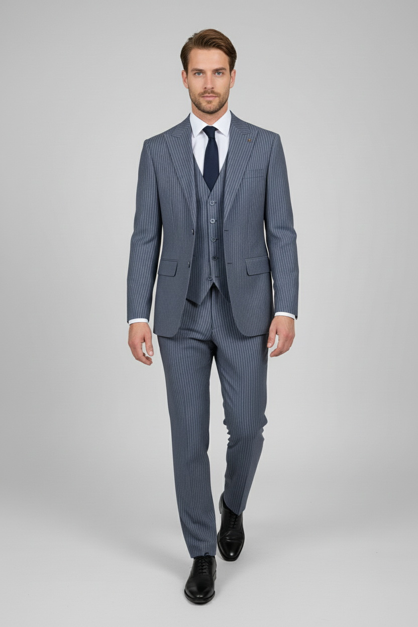 The Blue Pinstripe Two-Piece Suit captures the essence of classic tailoring with a refined modern cut. Tailored in a sophisticated deep blue tone accented with slim vertical pinstripes, it creates a confident, elongated silhouette that exudes timeless professionalism.