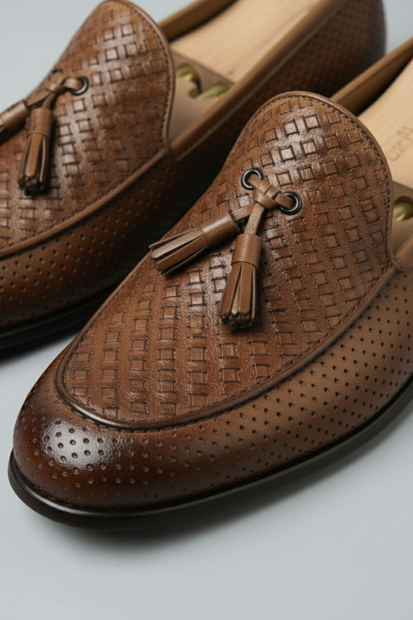 Brown woven leather loafers with tassels, ideal for casual and formal wear.