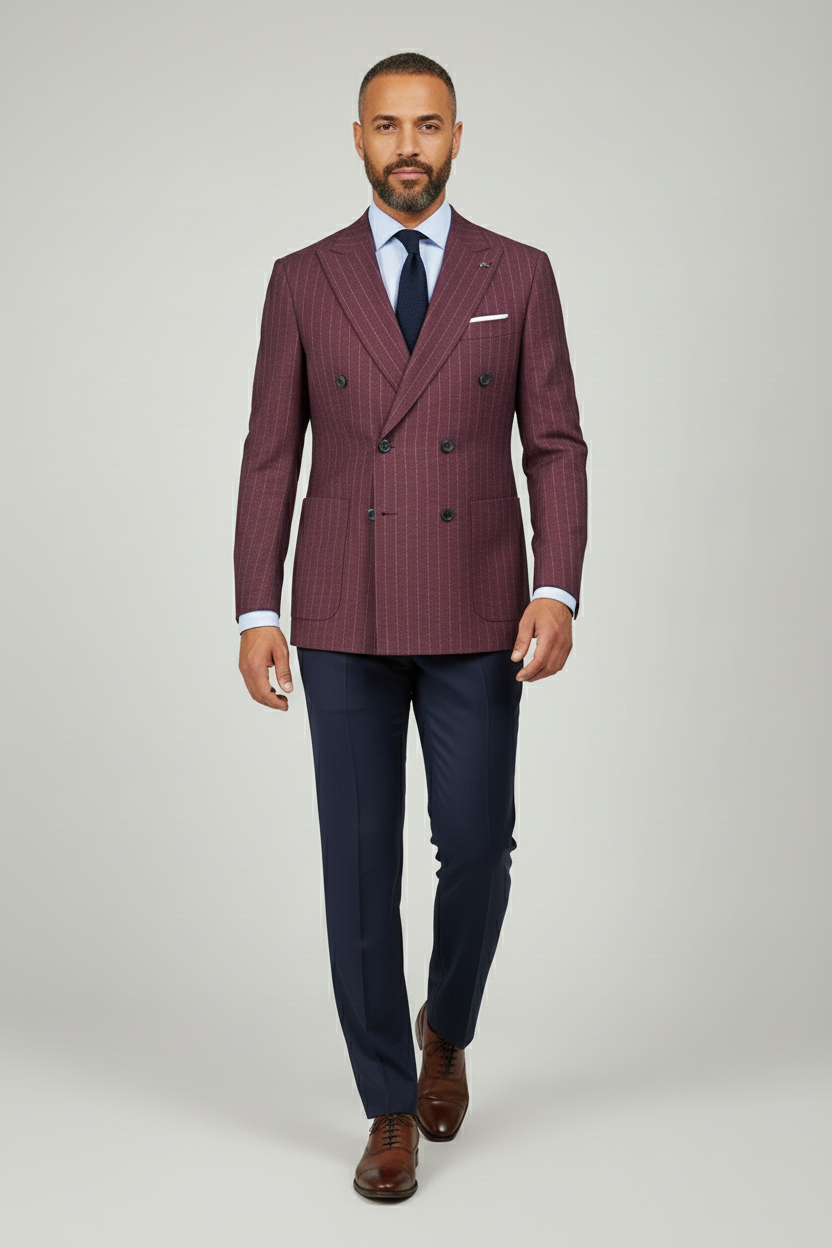 A refined expression of modern elegance, the Claret and Navy Combination Suit blends rich tones and confident tailoring for the contemporary gentleman. The deep claret jacket, featuring a subtle pinstripe texture and double-breasted closure, contrasts perfectly with sleek navy trousers, creating a balanced look that’s both striking and sophisticated.
