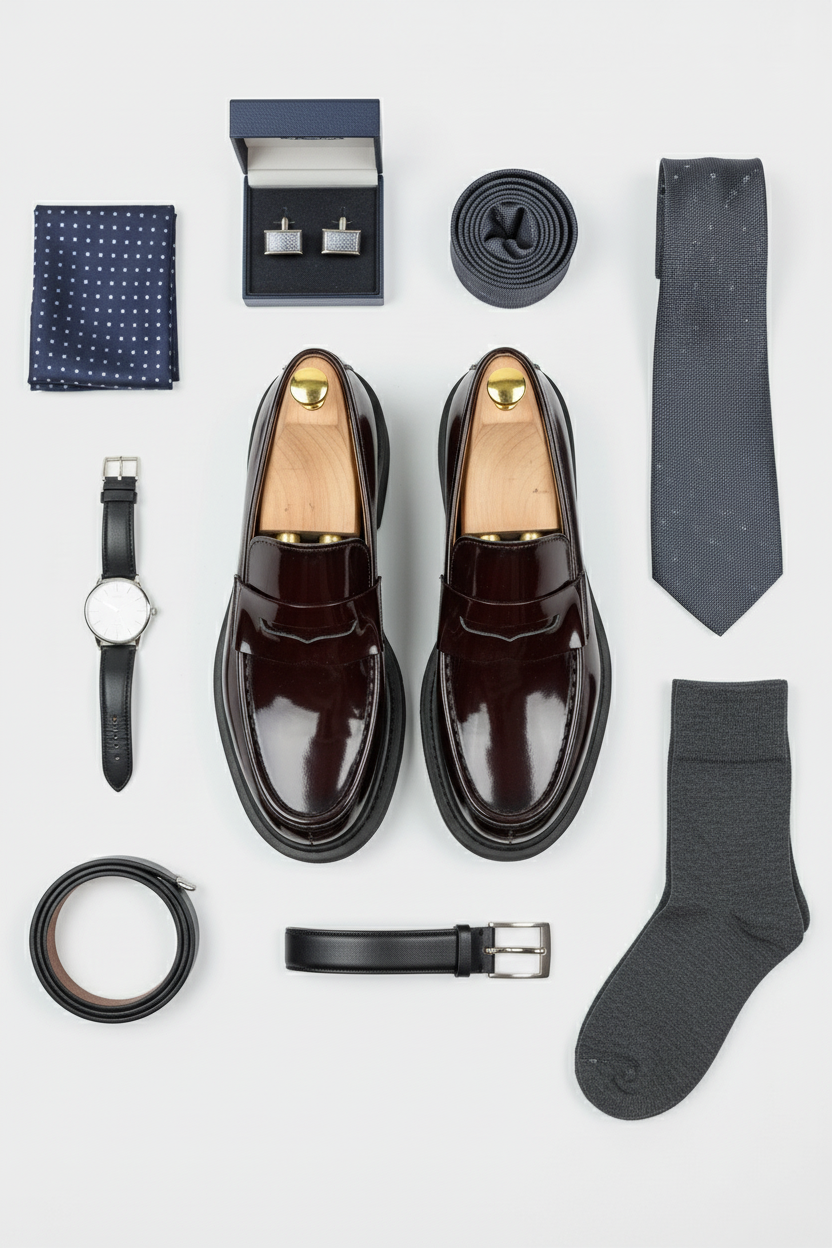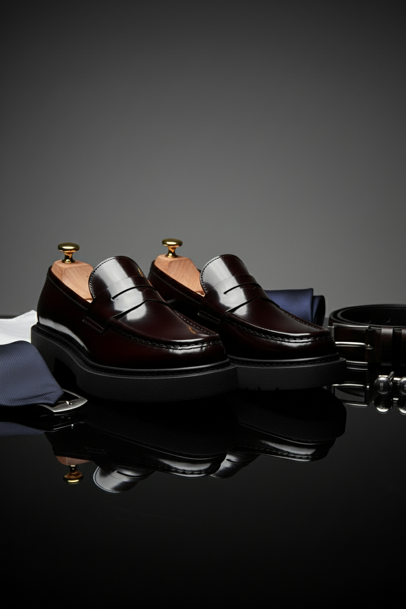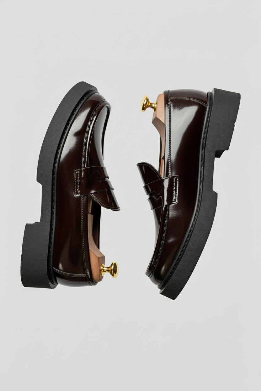 The **Burgundy Glossy Penny Loafers** combine bold design with classic refinement. Crafted in a rich burgundy high-shine leather, these loafers feature a deep, mirror-like finish that exudes contemporary luxury. The sleek penny strap and minimalist stitching highlight the clean silhouette, while the chunky, solid rubber sole adds a modern edge and superior comfort.
