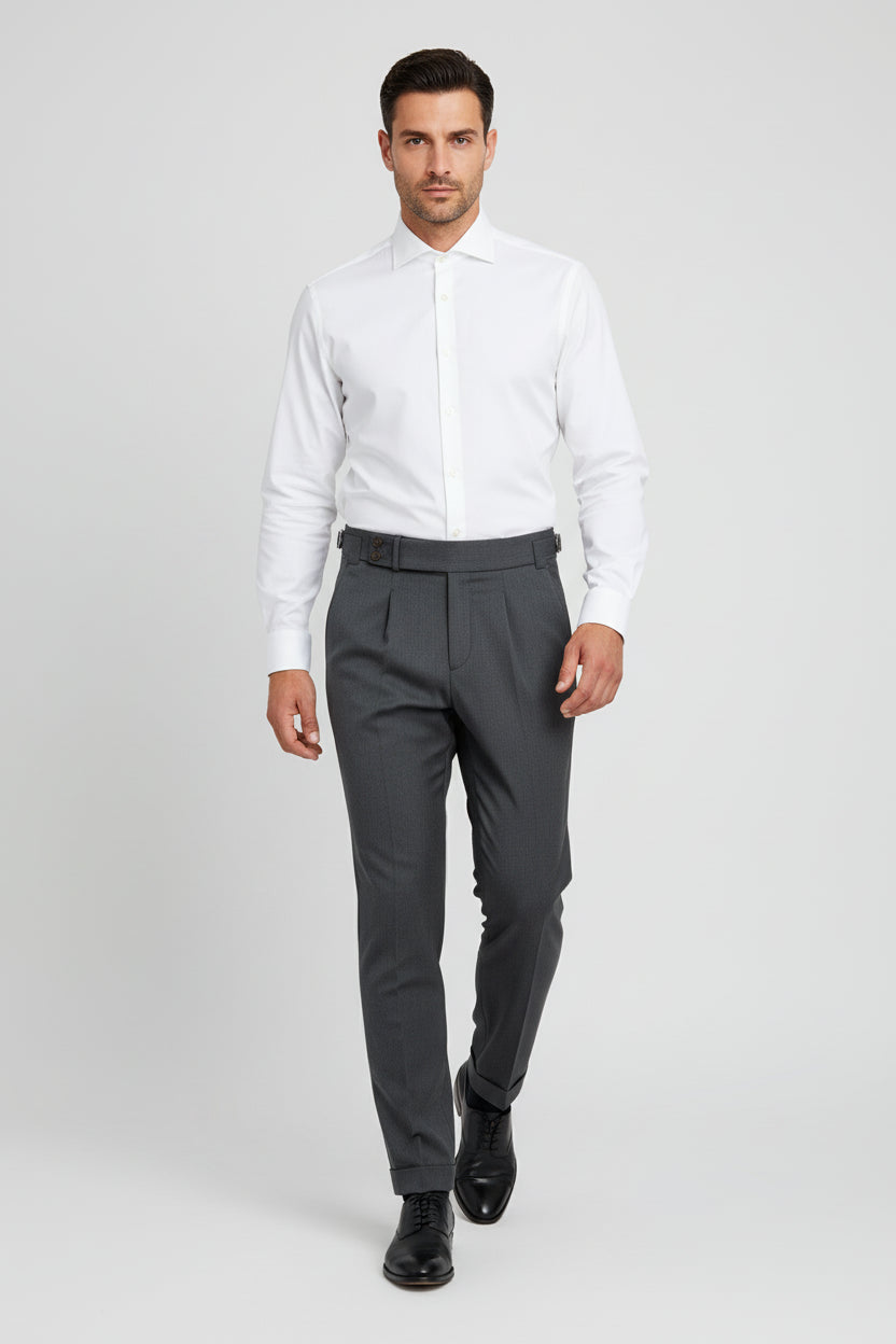 Finished with double pleats, an extended waistband closure, and cuffed hems, these pants embody Suit Sartoria’s signature attention to fine detail and tailored precision. Perfect for formal occasions, business settings, or elevated everyday looks.