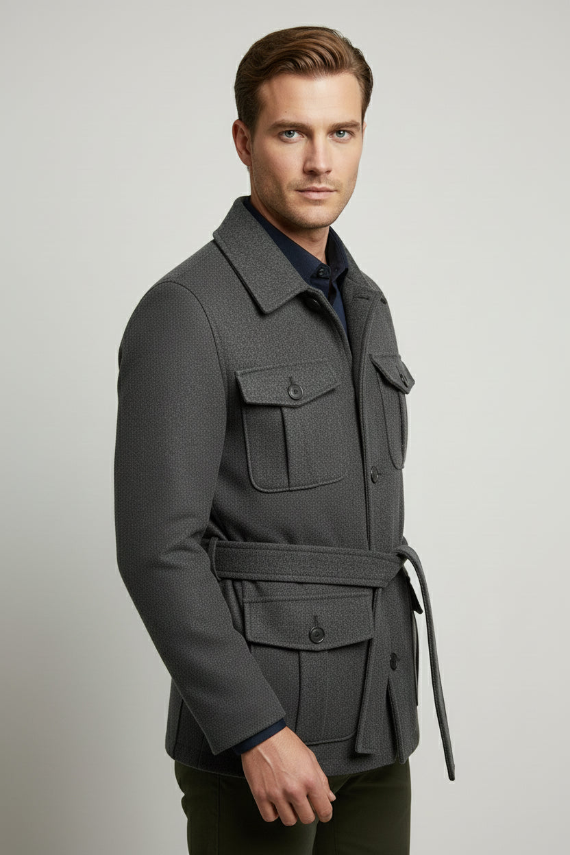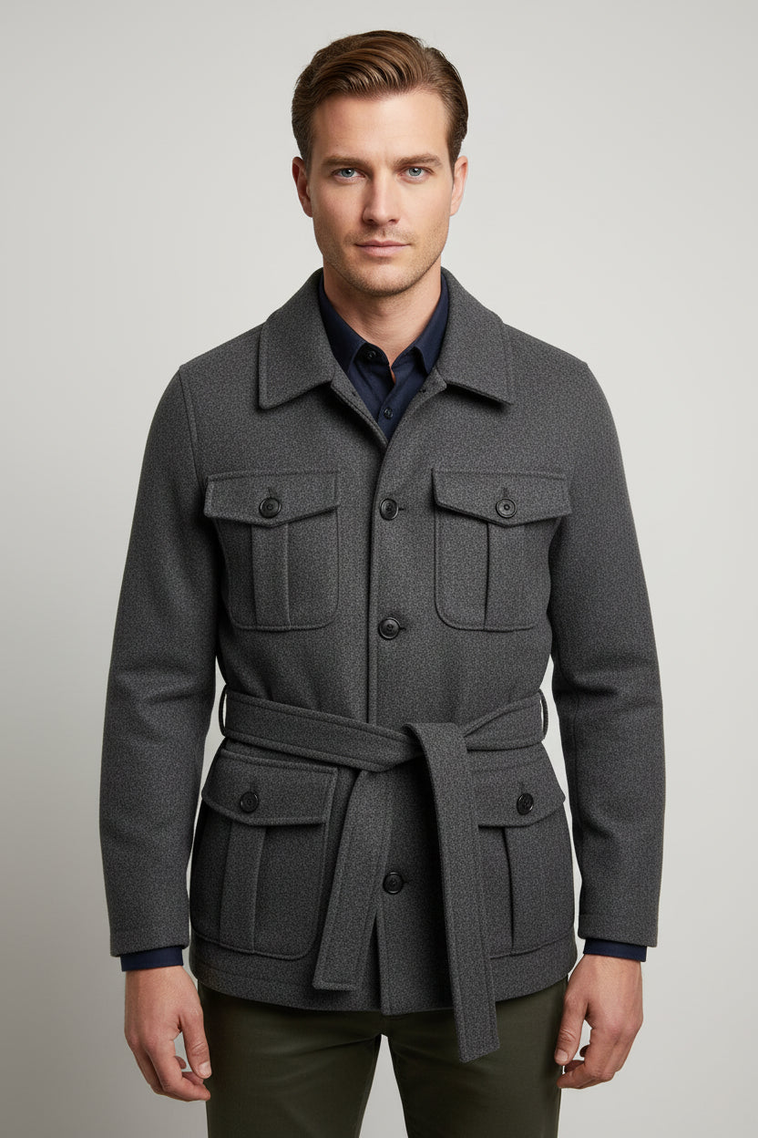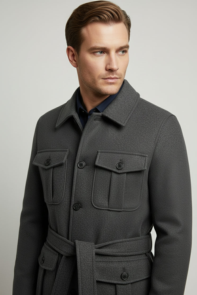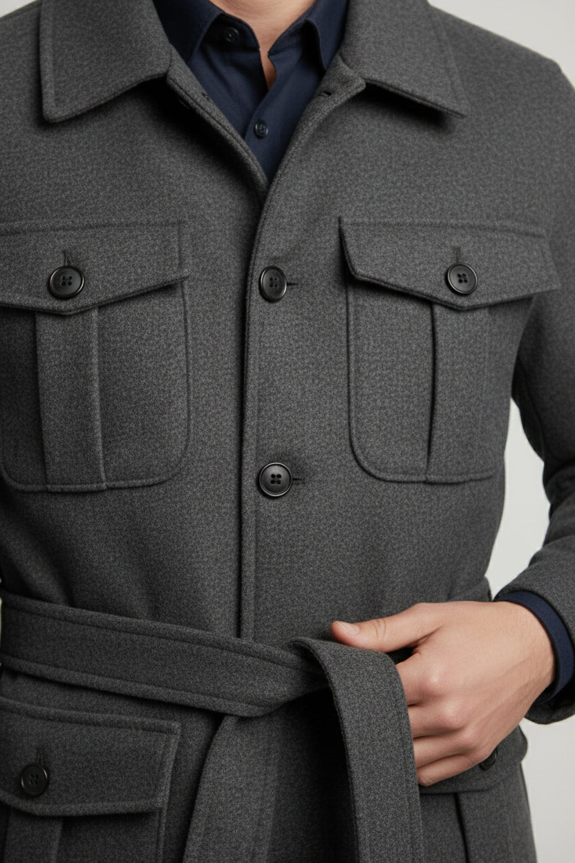 The Charcoal Grey Safari Jacket blends utilitarian functionality with refined tailoring — a perfect outerwear piece for the modern wardrobe. Designed in a deep charcoal tone, this jacket features four front flap pockets and a waist belt, delivering both structure and versatility for everyday wear.