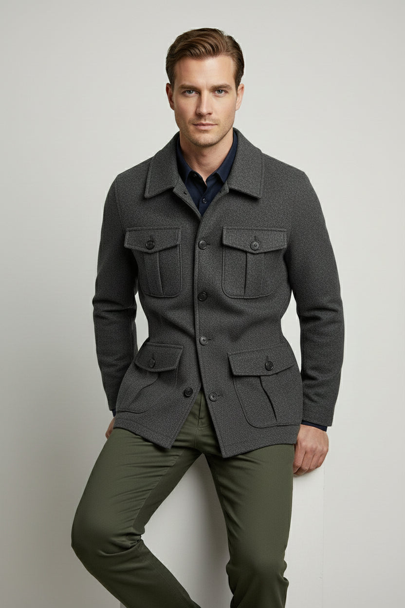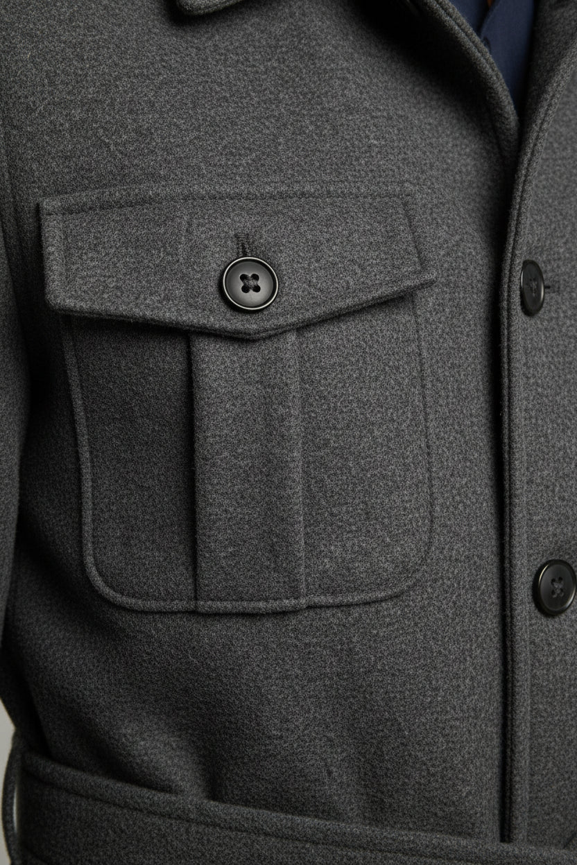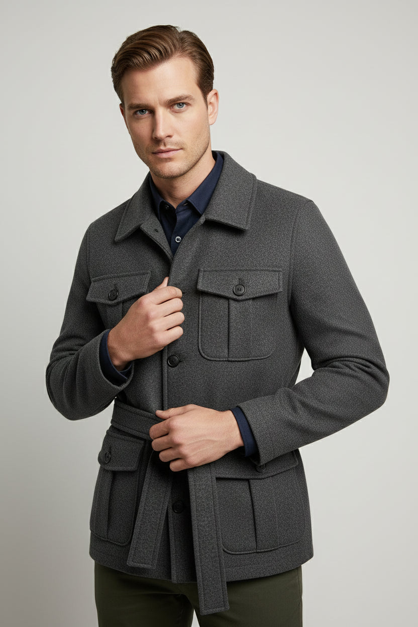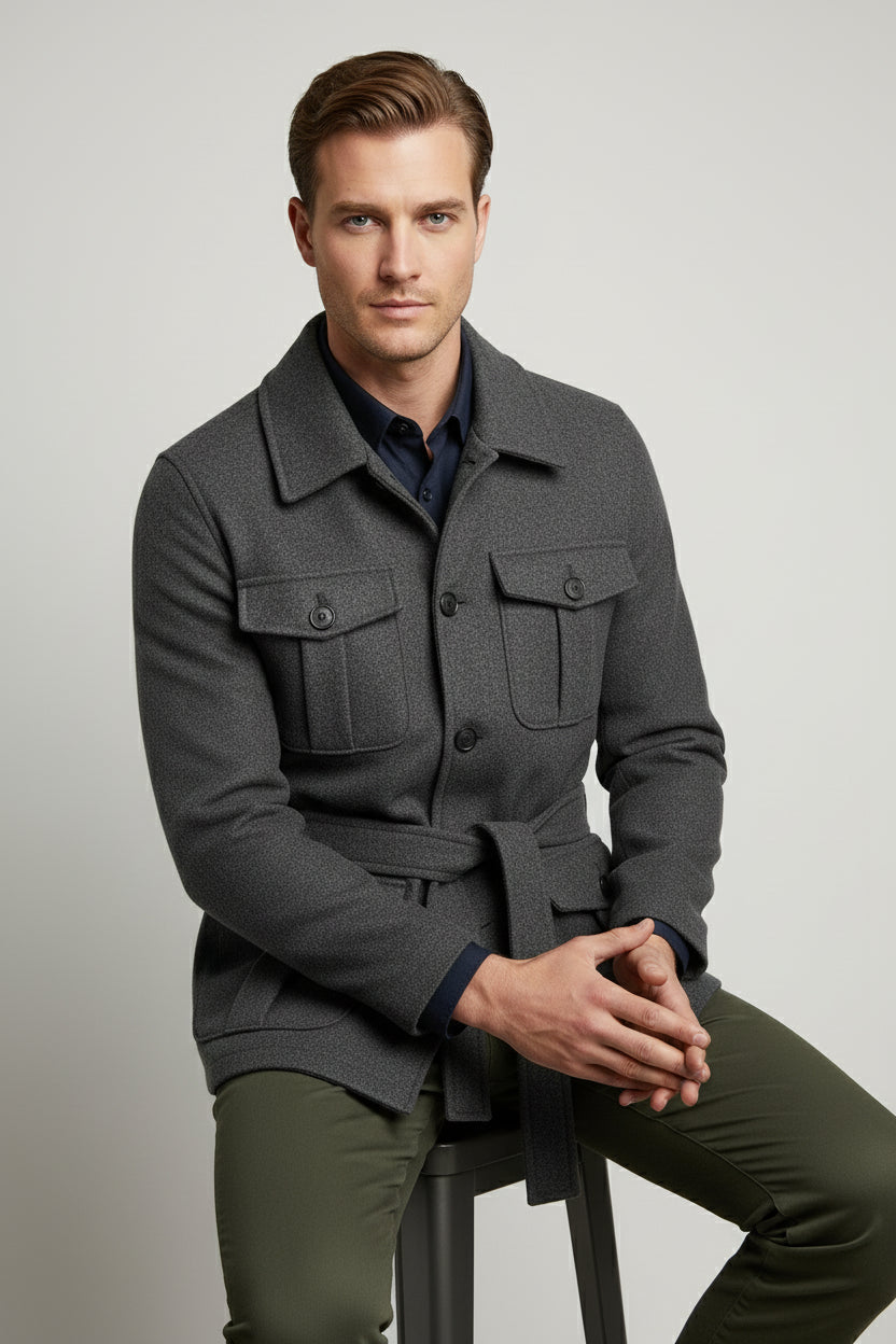 The Charcoal Grey Safari Jacket blends utilitarian functionality with refined tailoring — a perfect outerwear piece for the modern wardrobe. Designed in a deep charcoal tone, this jacket features four front flap pockets and a waist belt, delivering both structure and versatility for everyday wear.
