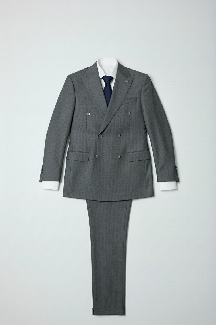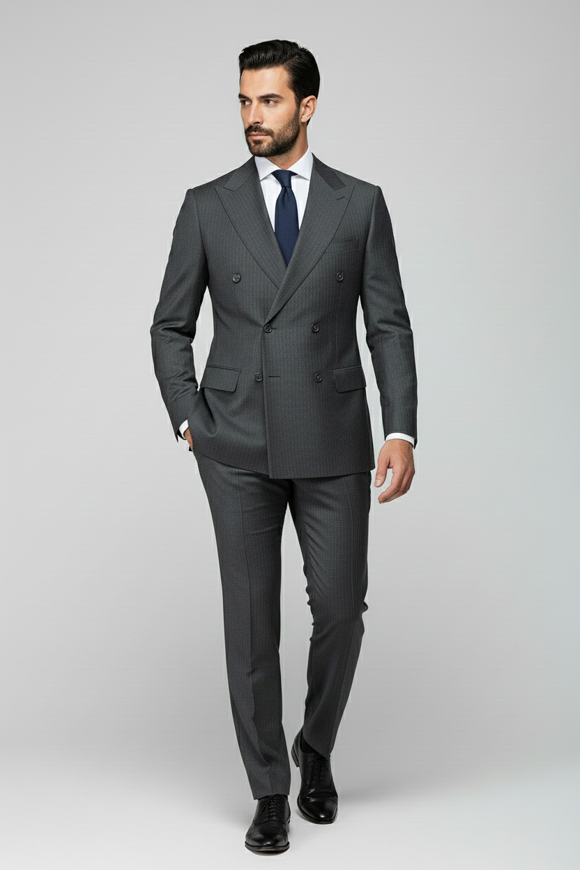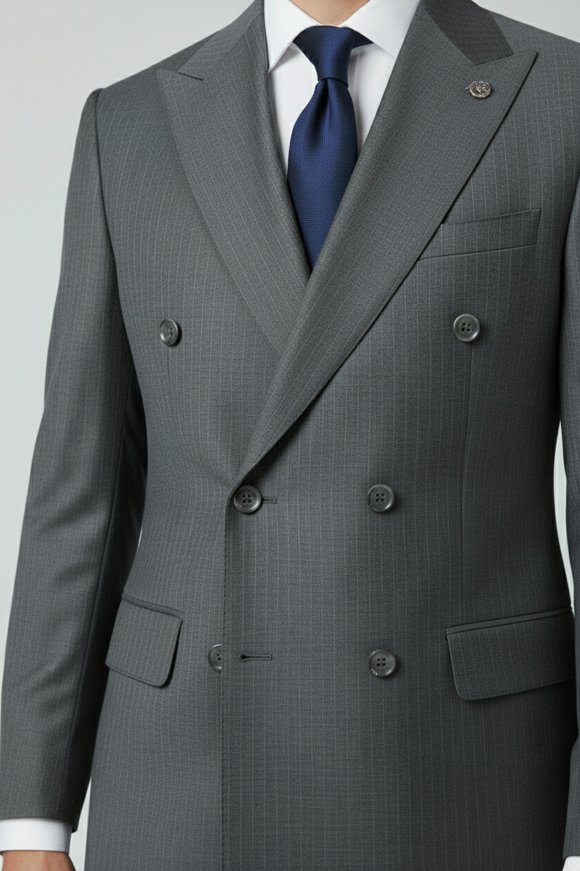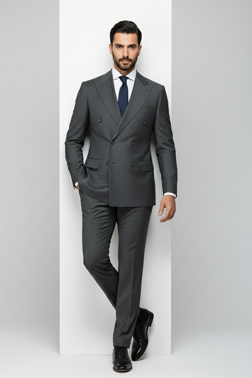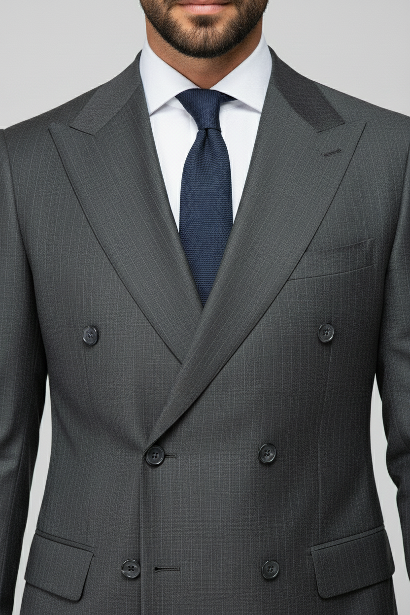 Command attention with this elegant charcoal pinstripe double-breasted suit, designed for the modern gentleman. Perfect for formal occasions, this suit exudes sophistication.