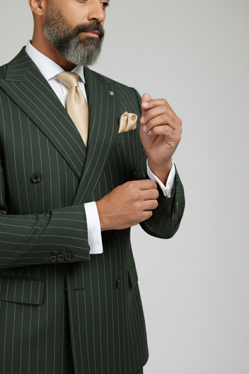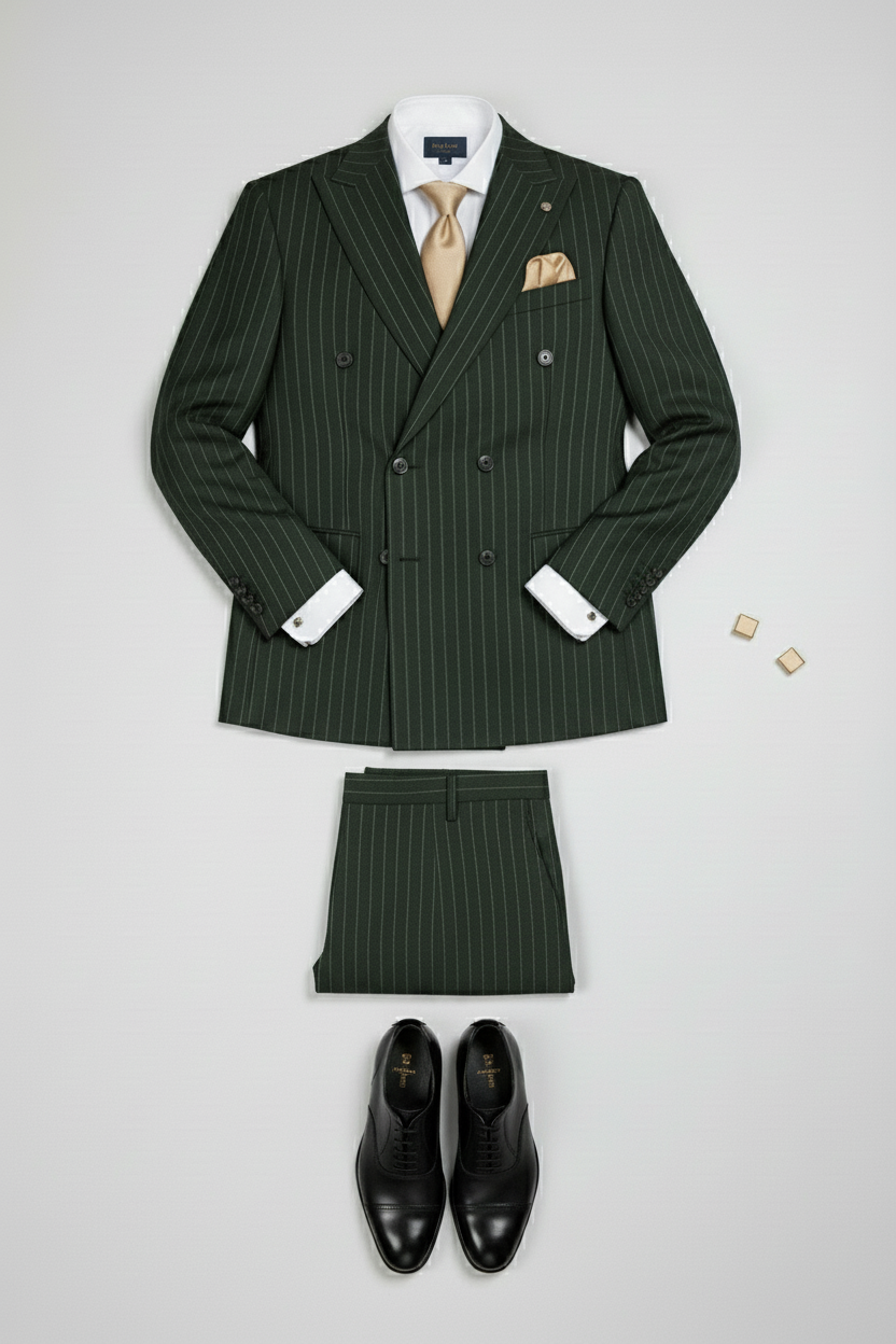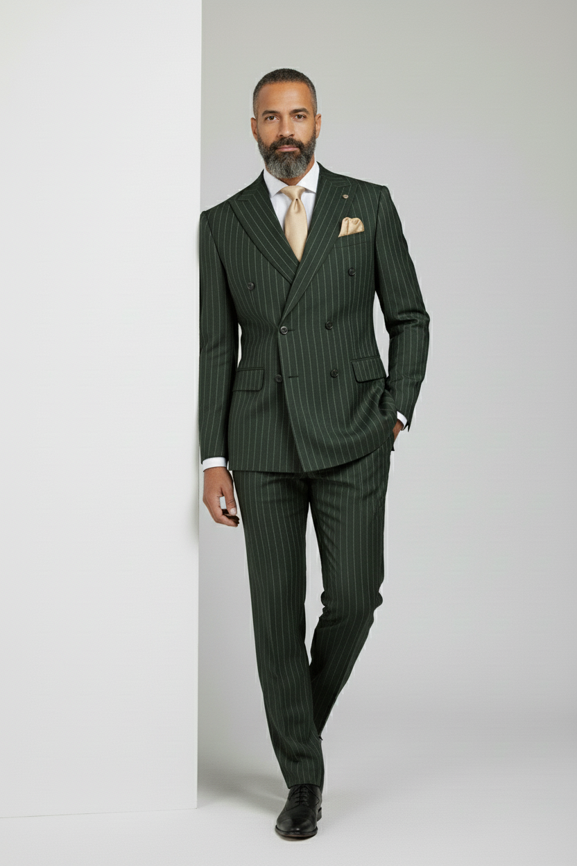 Exude timeless elegance with this Dark Green Pinstripe Double-Breasted Suit, a perfect choice for sophisticated occasions. Crafted with precision, it showcases a refined silhouette that commands attention.