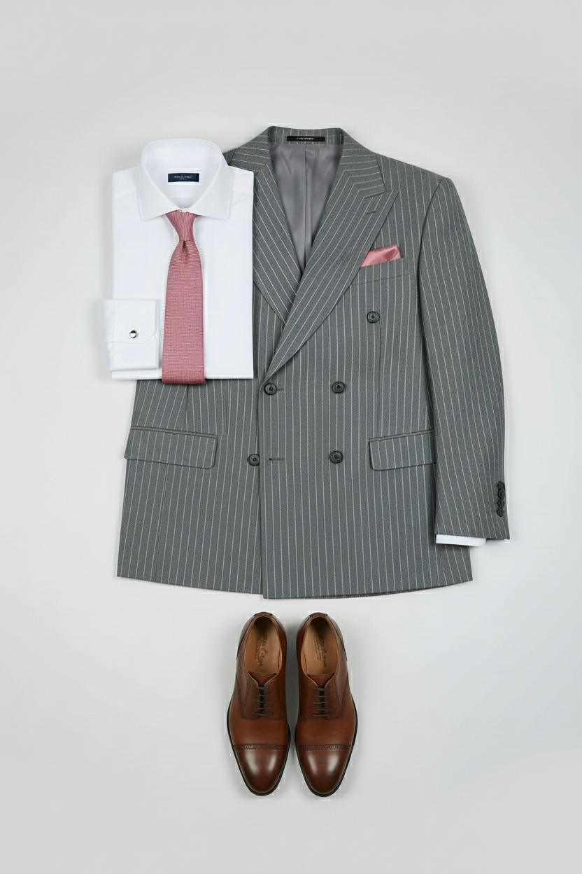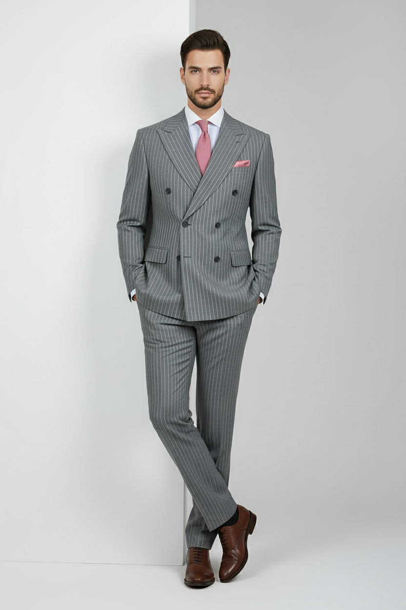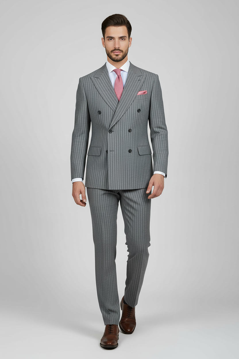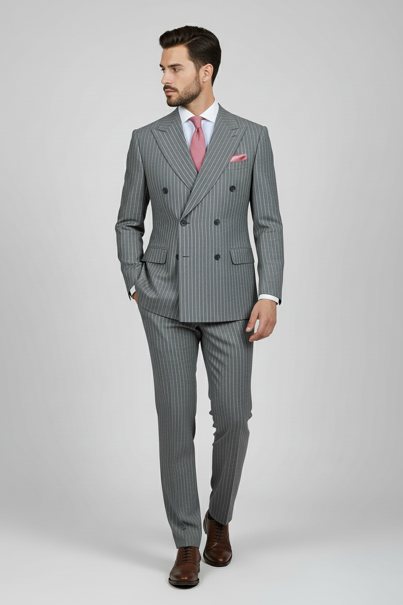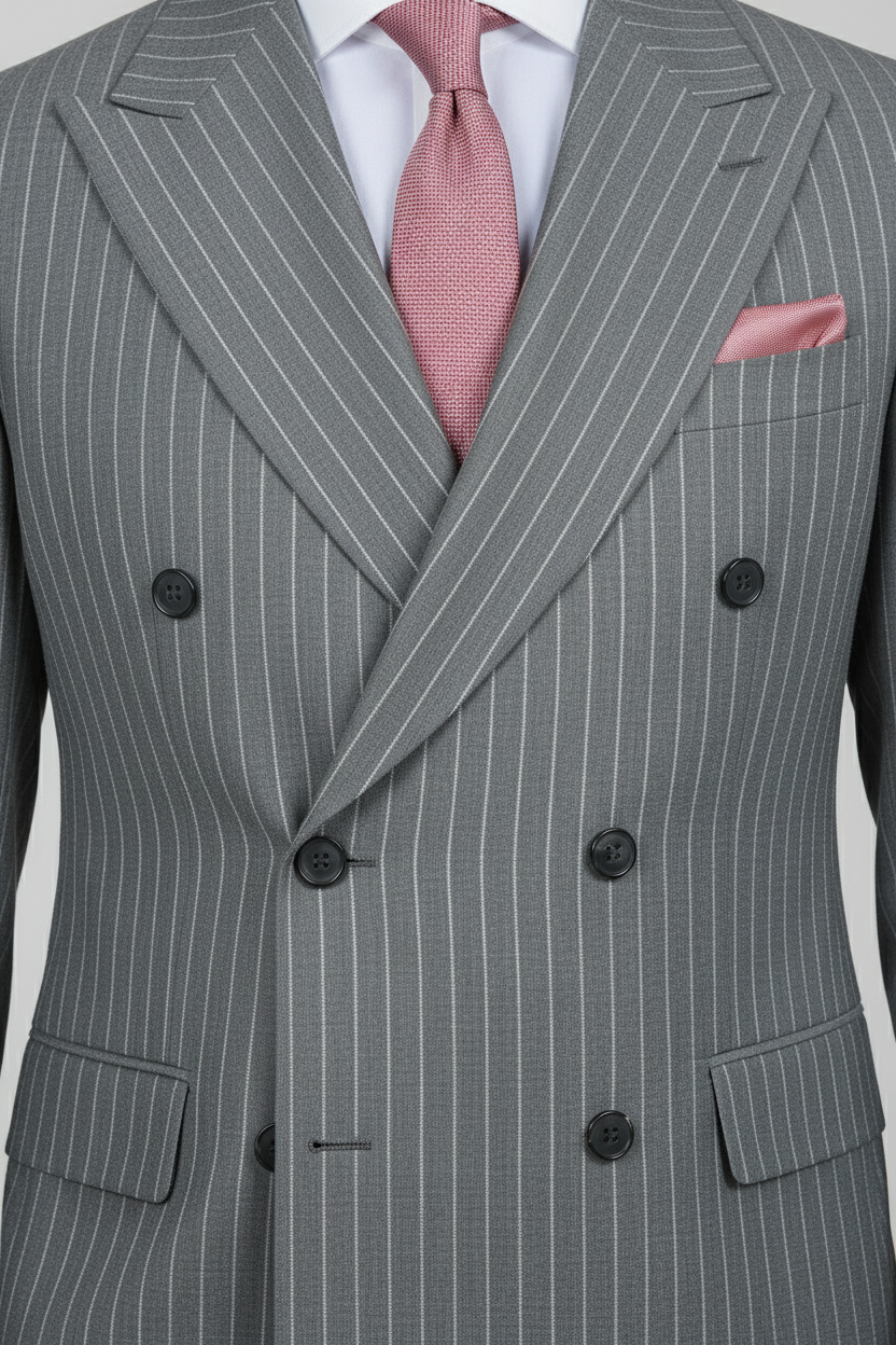 Command attention with this Gray Pinstripe Double-Breasted Suit, a perfect blend of classic charm and modern elegance. Tailored for sophistication, this suit is ideal for both professional and formal occasions.