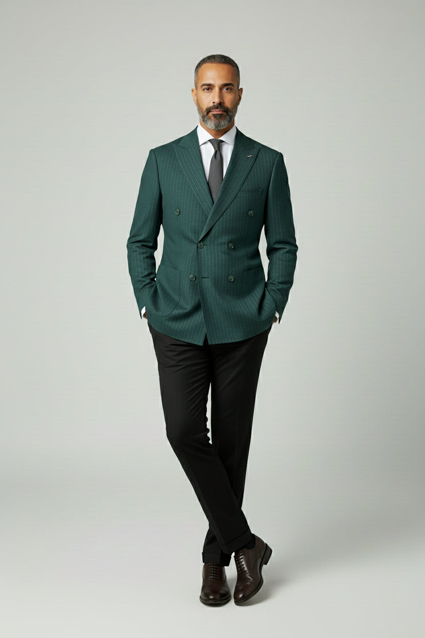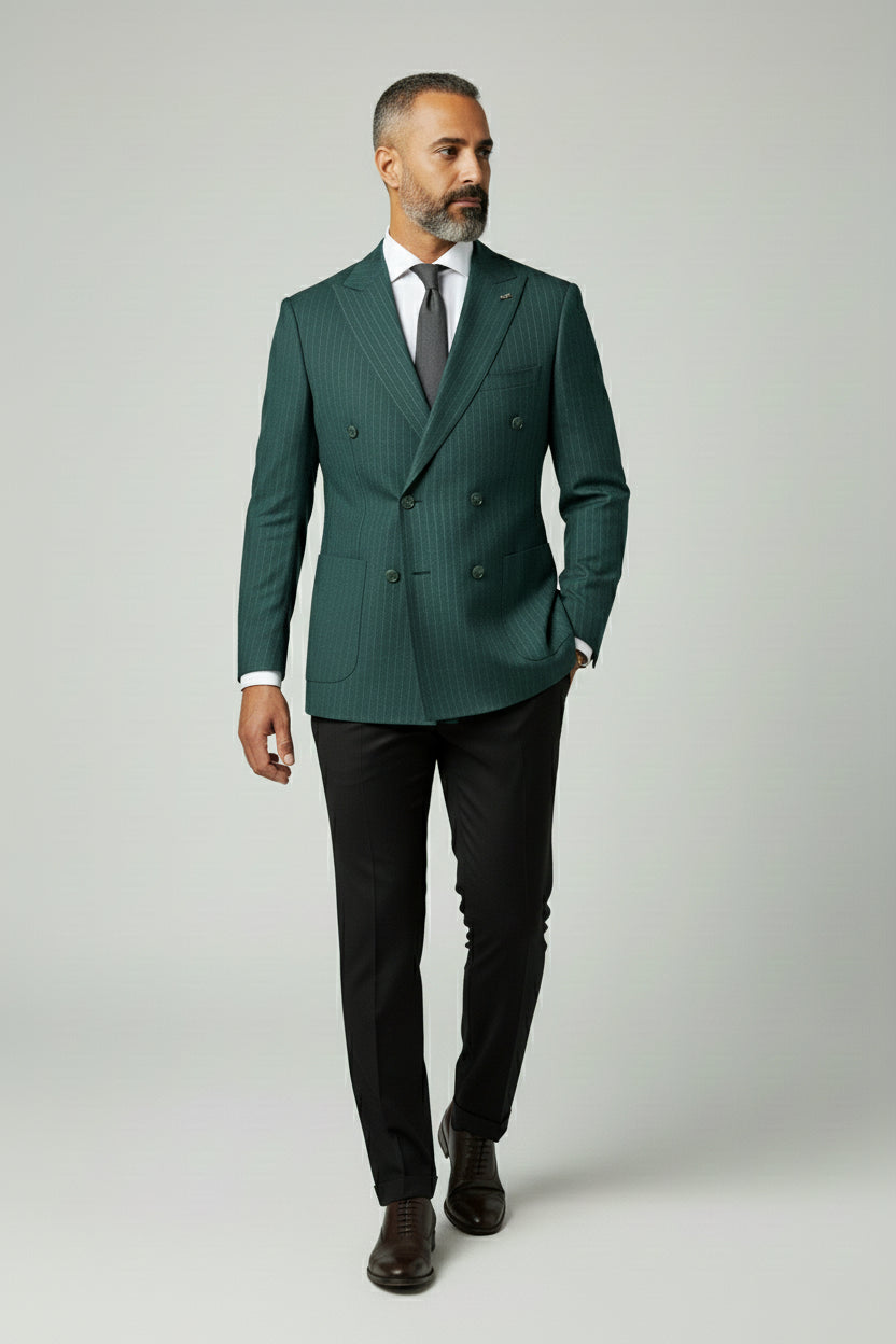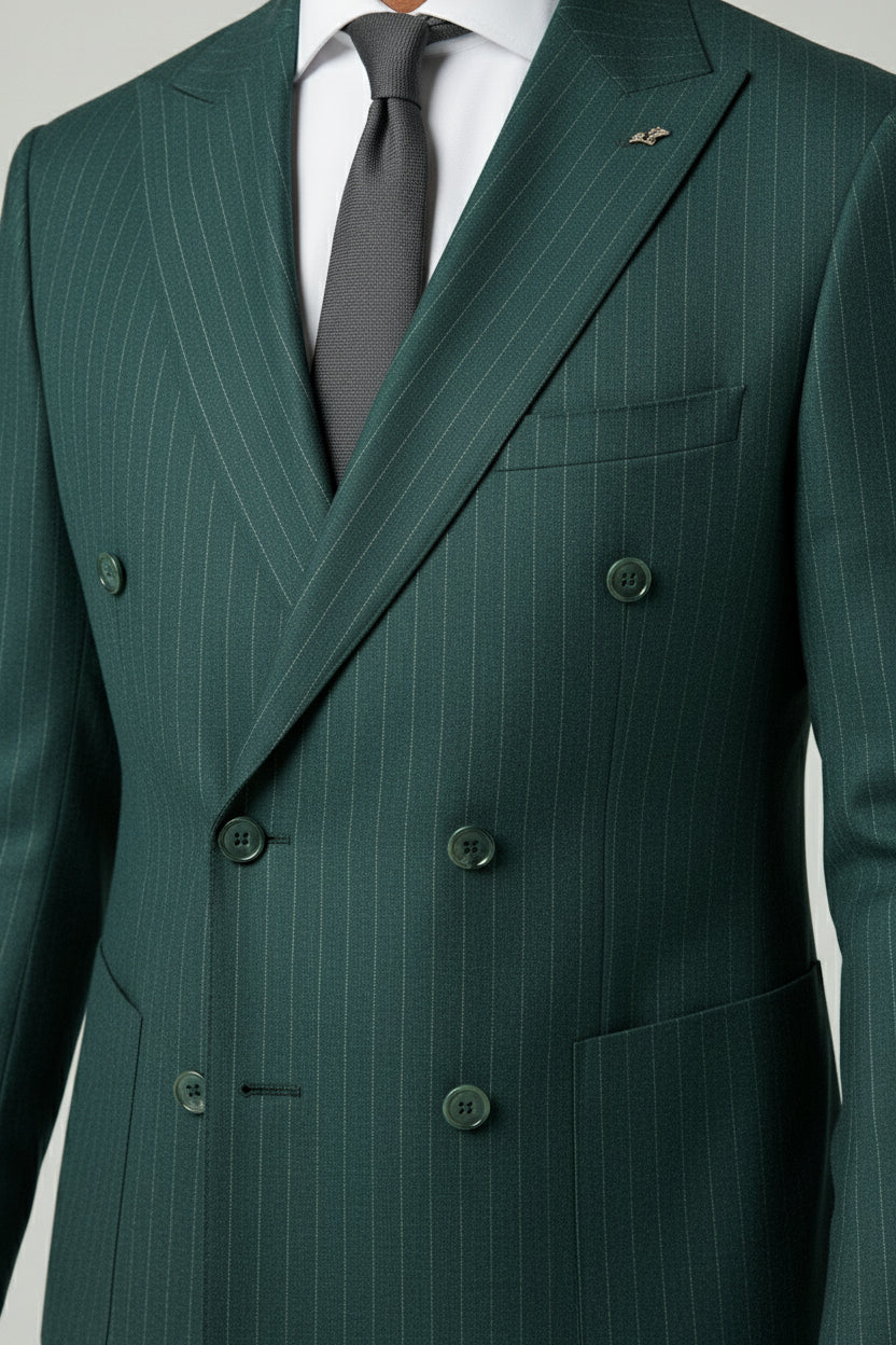 Green double-breasted striped suit with tailored jacket, white shirt, and dark trousers.