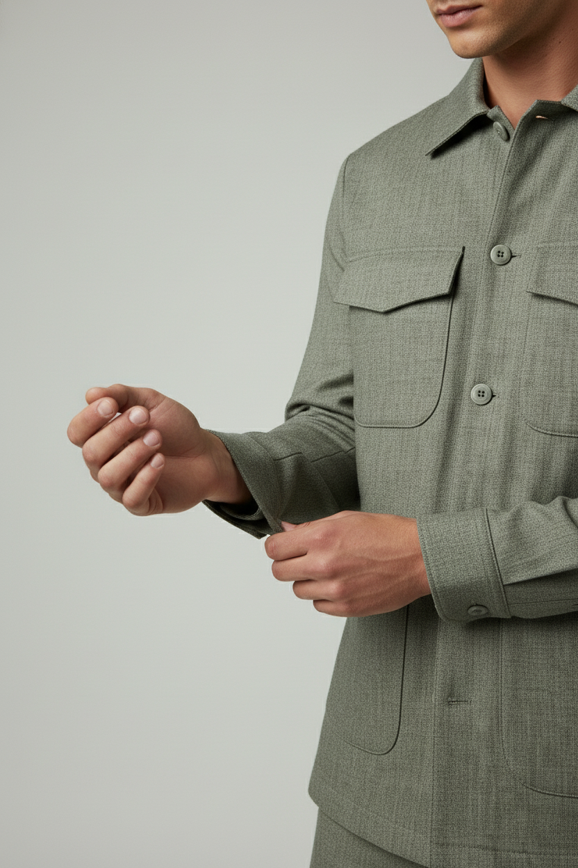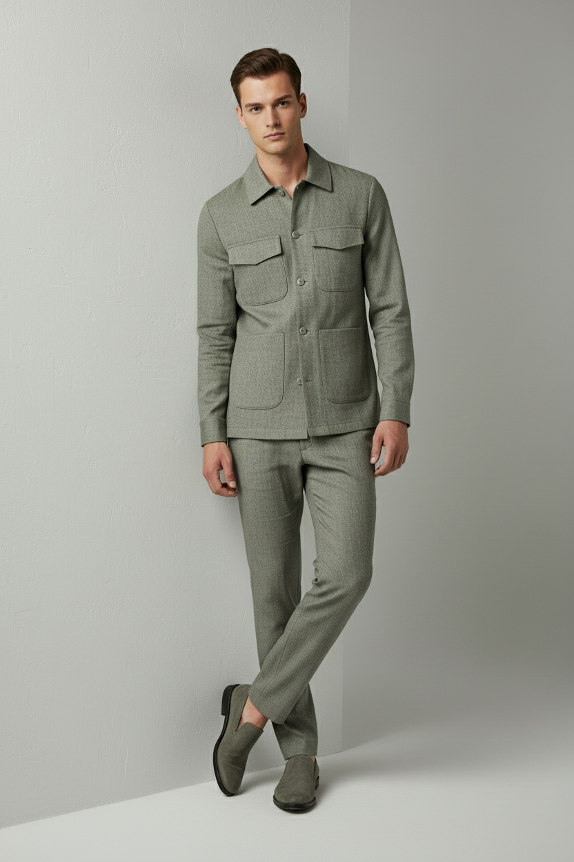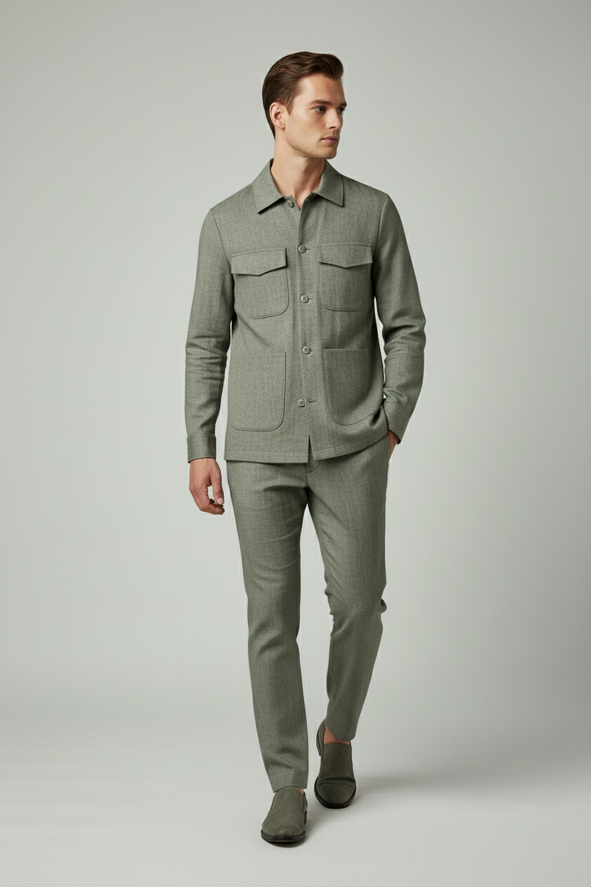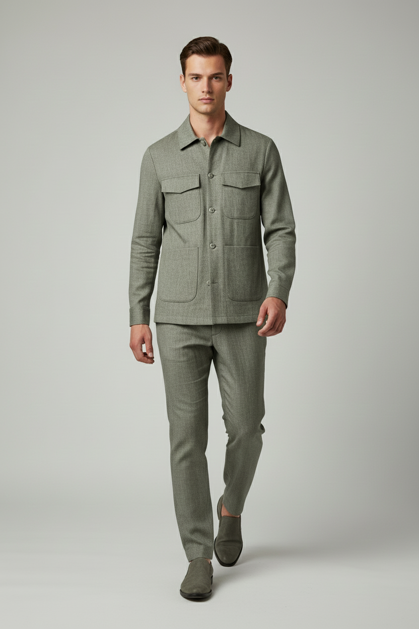 Featuring distinct safari-inspired details — including utility-style flap pockets, a notch lapel, and a belted waist option — this suit combines structure with comfort. The earthy green tone adds a modern touch while maintaining timeless versatility. Pair it with a white linen shirt or loafers for a confident summer ensemble.