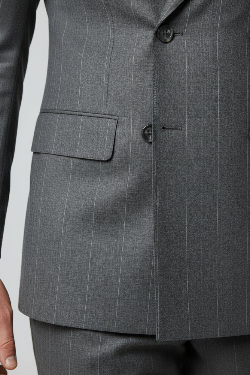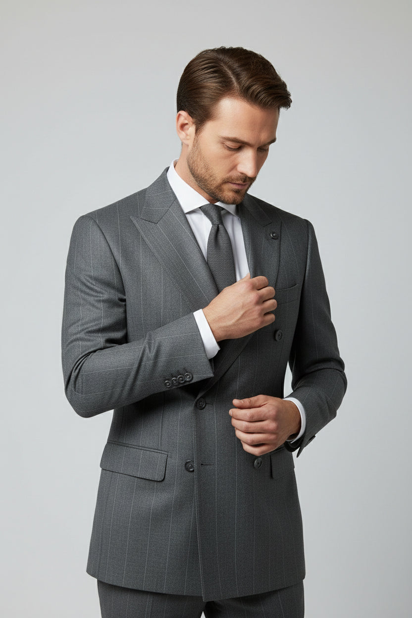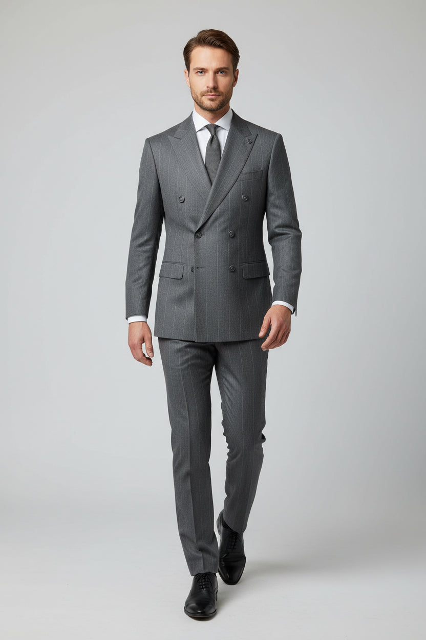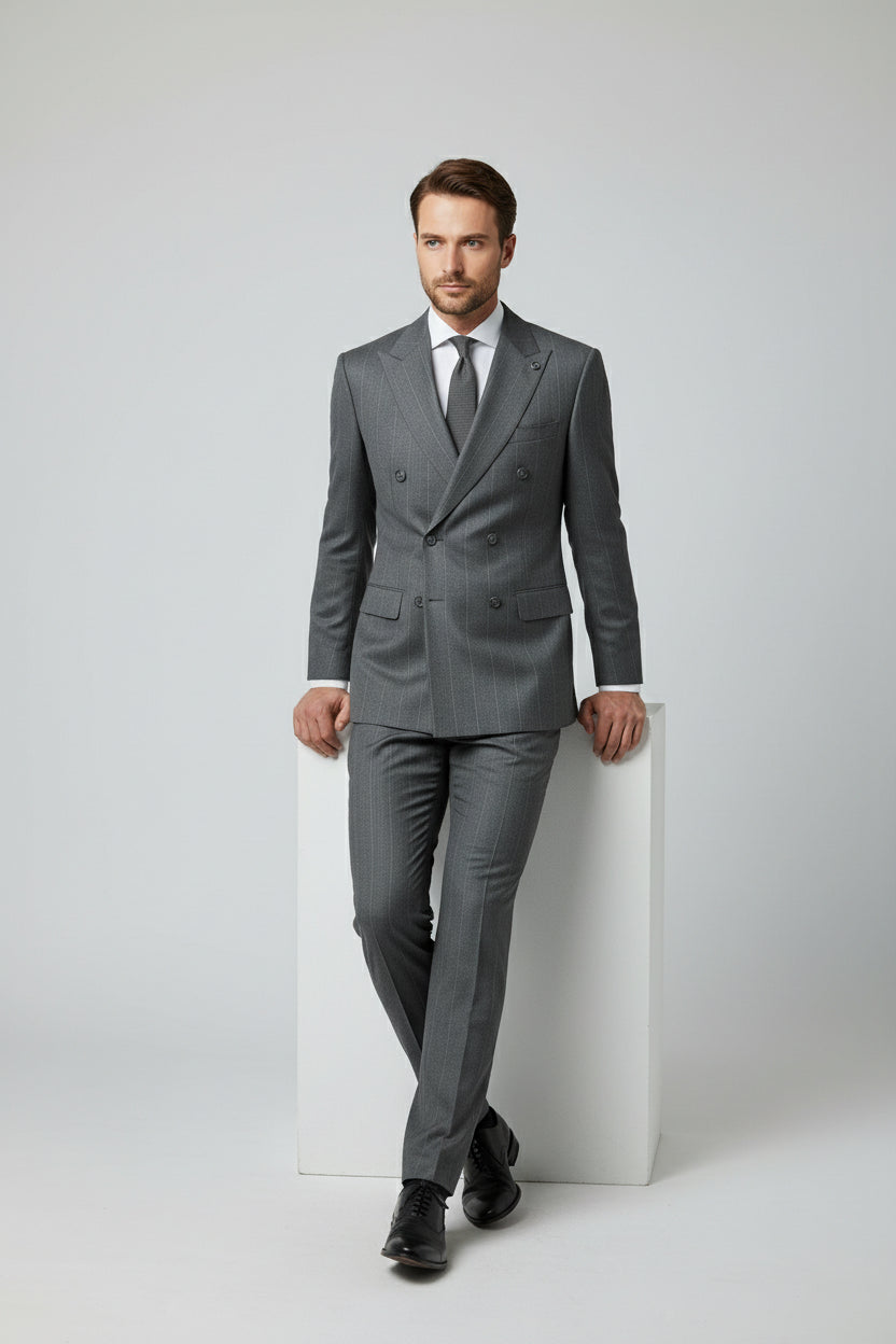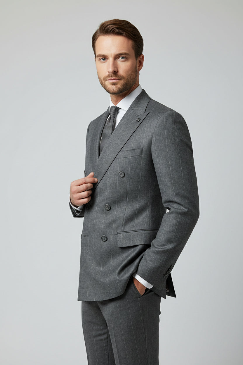 A refined grey double-breasted suit detailed with subtle pinstripes for a sharp, elongated silhouette. Designed with structured peak lapels and a classic six-button front, this suit delivers a confident, tailored presence without being overstated. The clean lines and precise cut make it ideal for business, formal occasions, and elevated professional settings. A timeless wardrobe essential that balances authority, elegance, and modern tailoring.