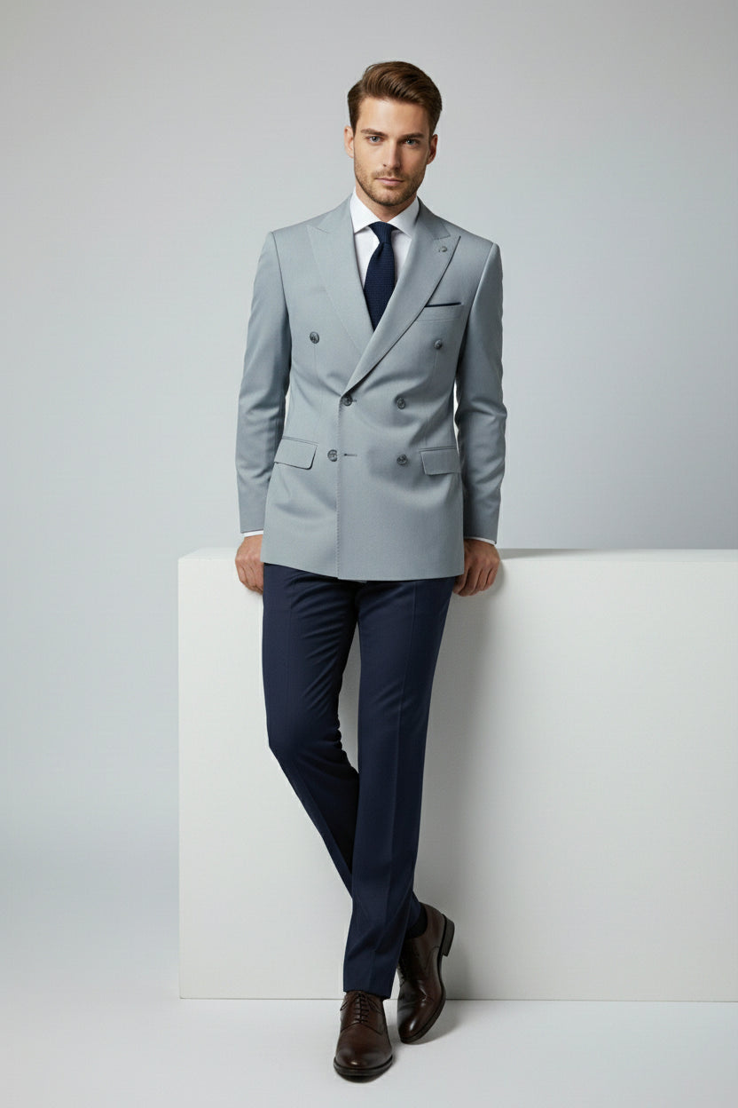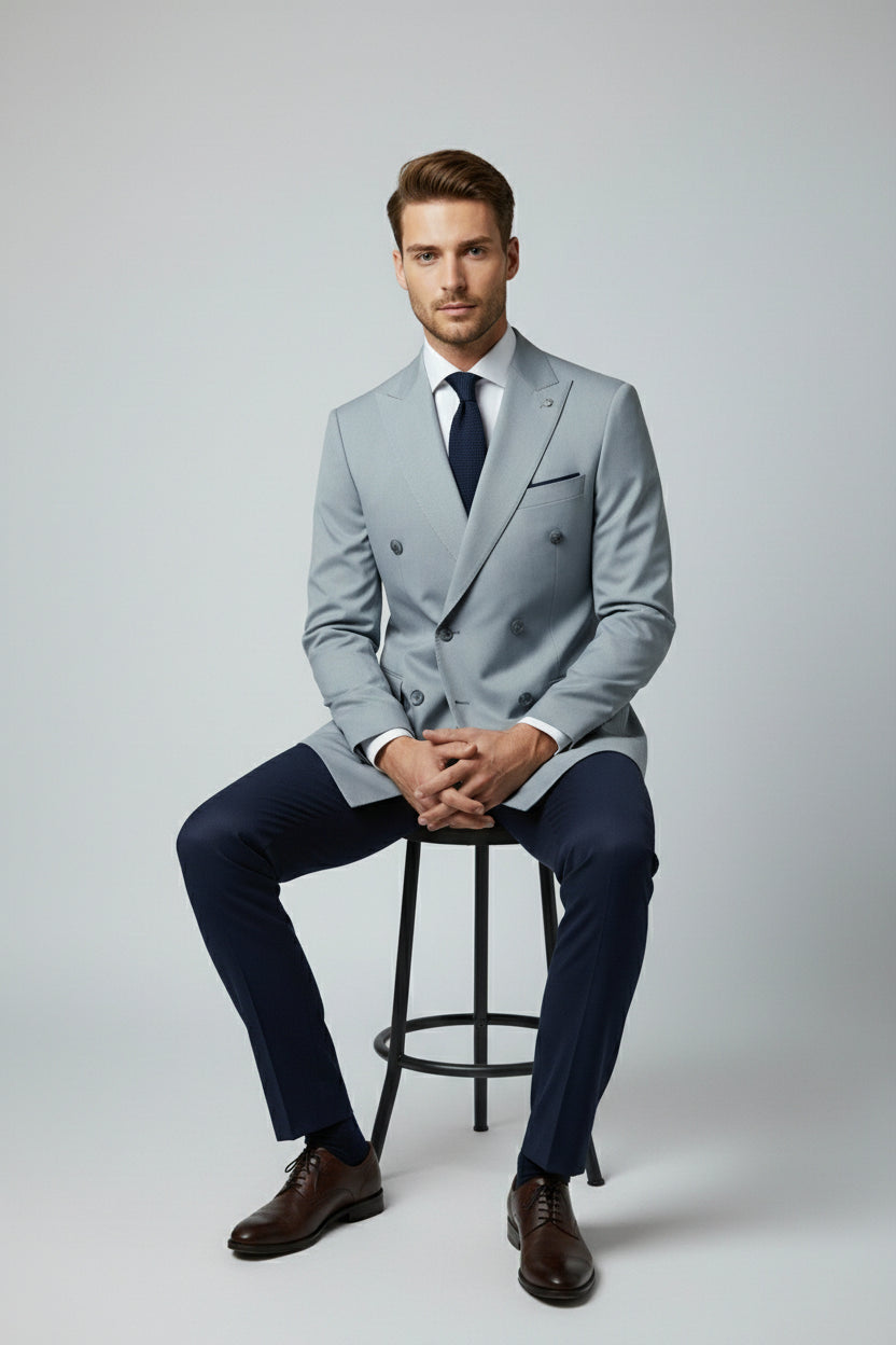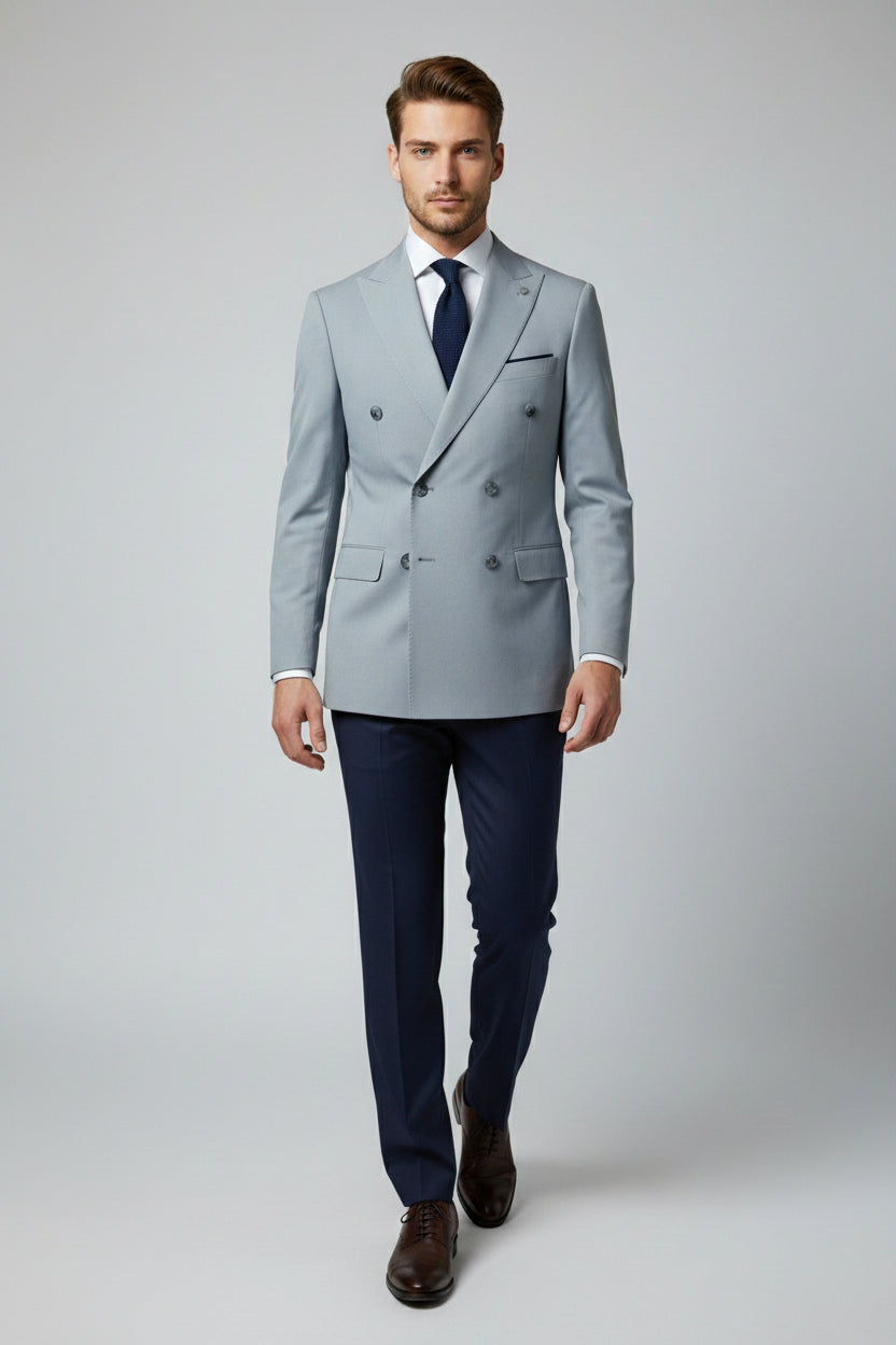 This light blue and navy combination double-breasted two-piece suit blends contemporary contrast with classic tailoring. The double-breasted jacket features structured peak lapels, a clean six-button closure, and flap pockets, delivering a confident and polished presence.