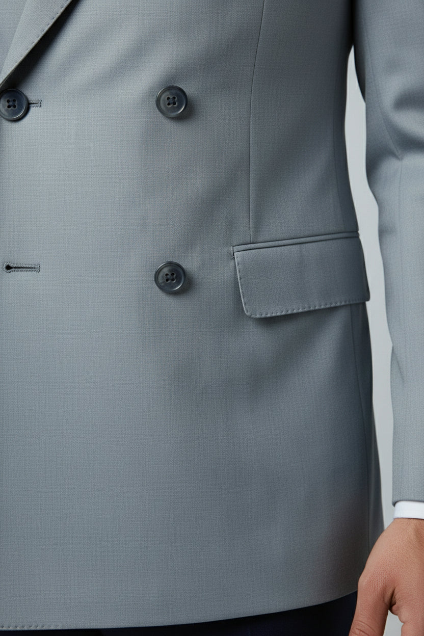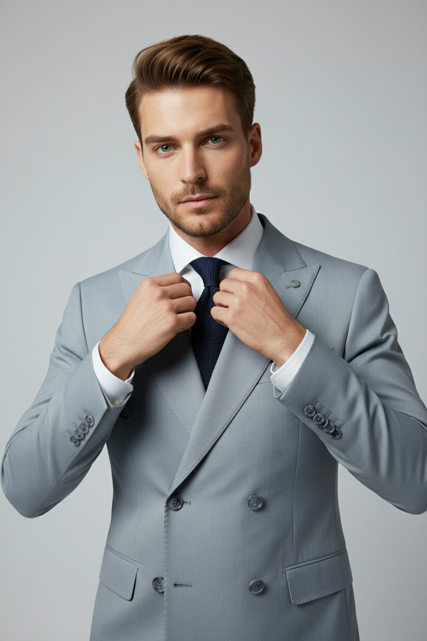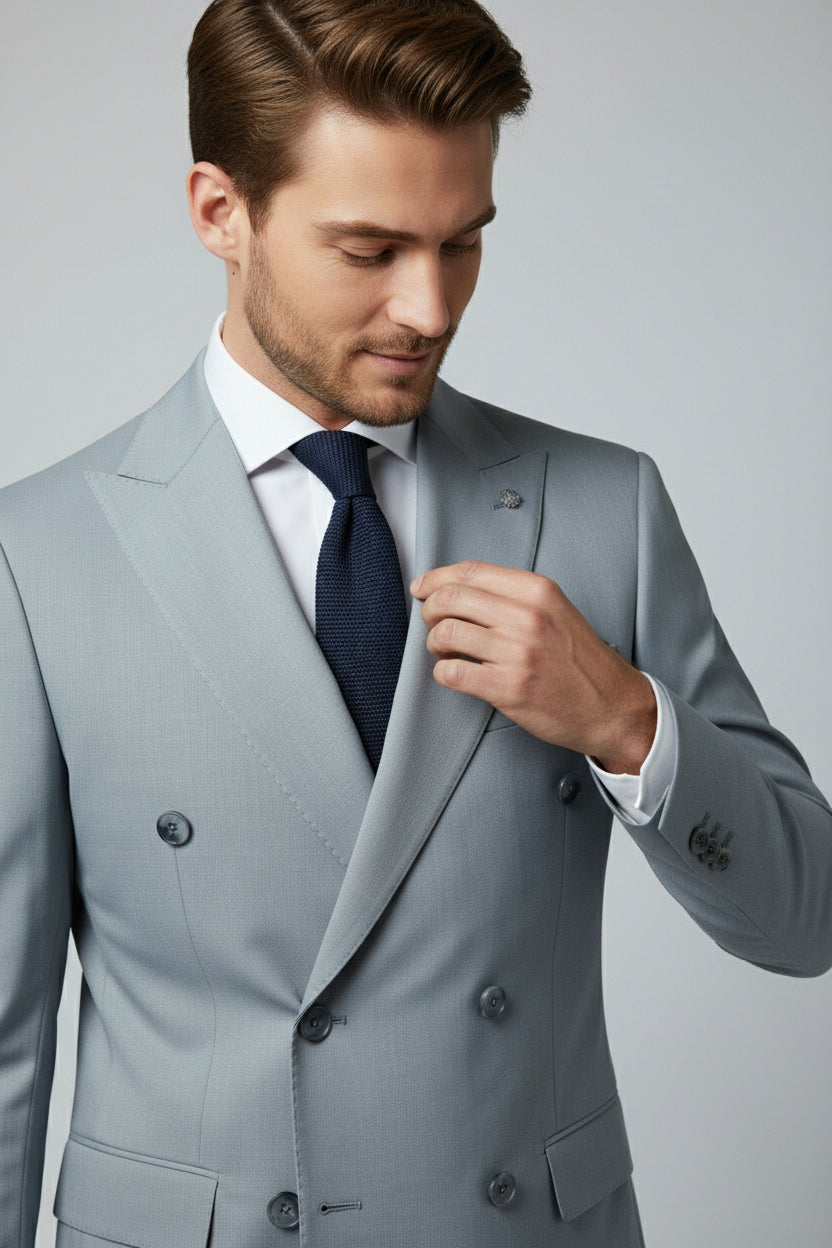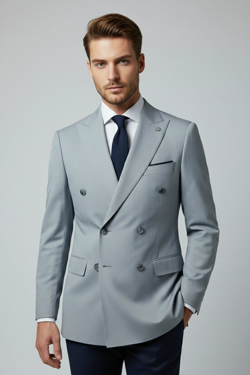 This light blue and navy combination double-breasted two-piece suit blends contemporary contrast with classic tailoring. The double-breasted jacket features structured peak lapels, a clean six-button closure, and flap pockets, delivering a confident and polished presence.