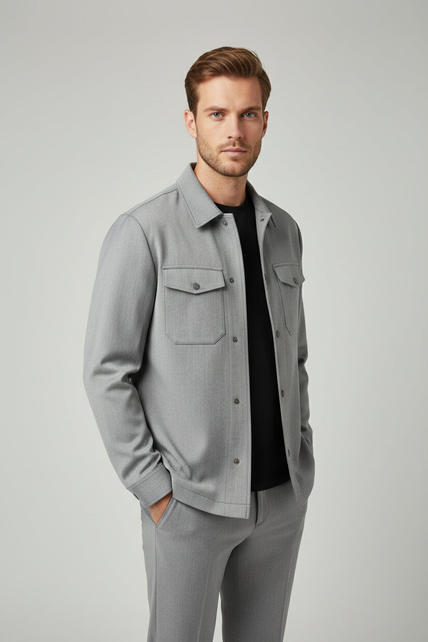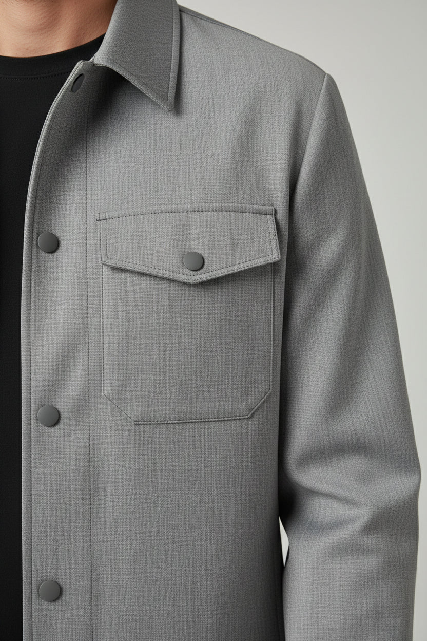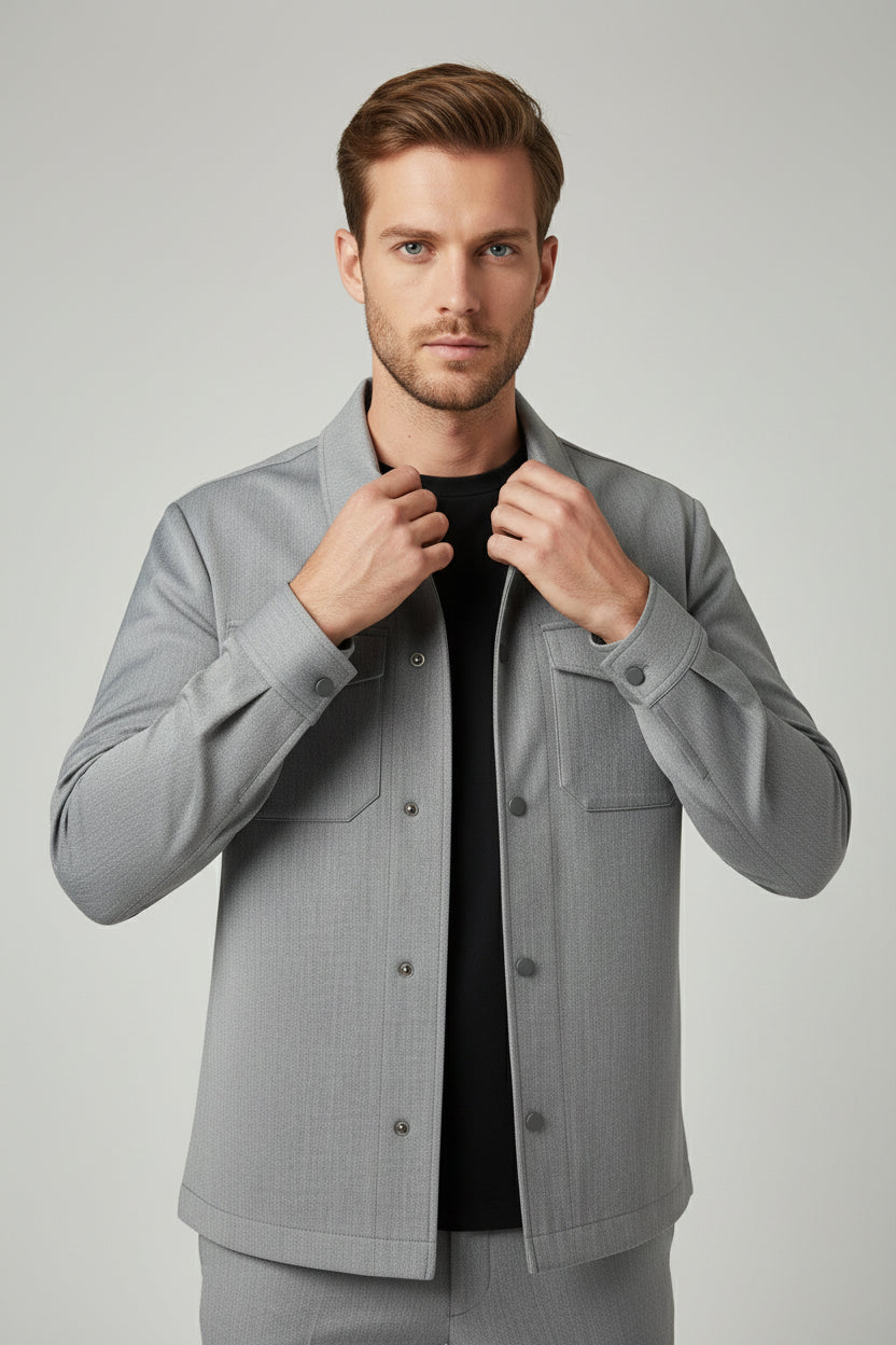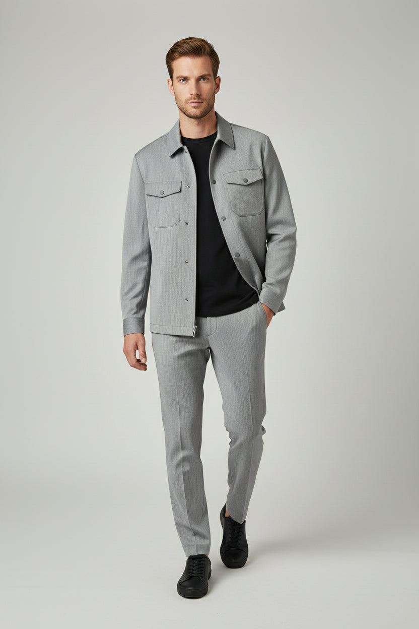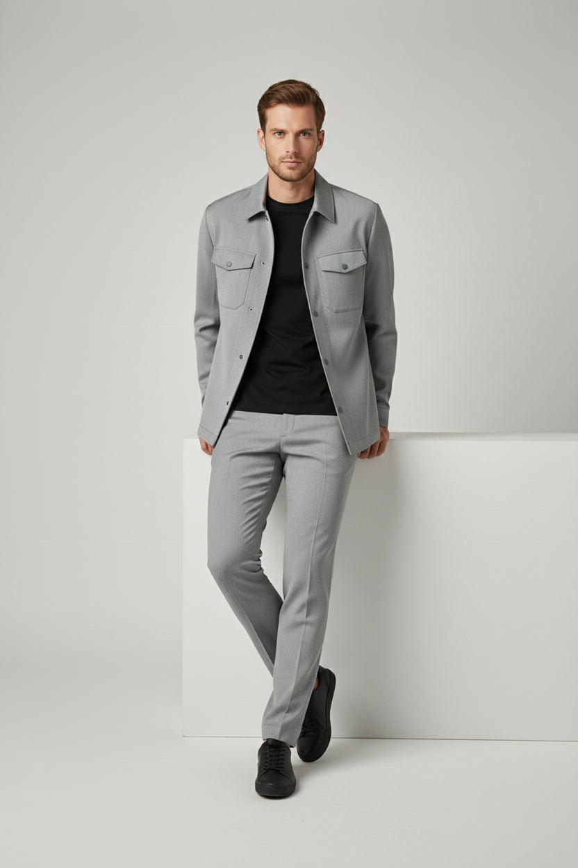 This Light Grey Structured Safari Suit delivers a clean and contemporary take on relaxed tailoring. Designed with a safari-style jacket, it features a sharp straight collar, structured silhouette, and functional flap chest pockets that enhance its modern appeal. The front button closure maintains a streamlined profile, while the tailored trousers complete the look with balanced proportions and a polished finish. Crafted from premium fabric, this suit is ideal for smart casual settings, daytime occasions, and elevated everyday dressing with a refined edge.