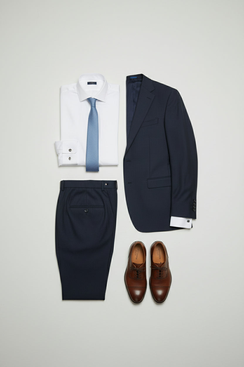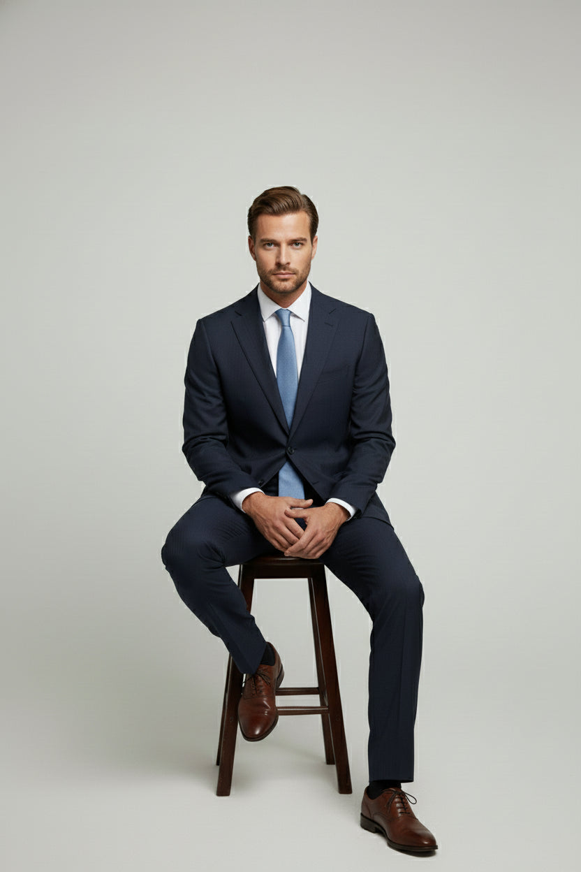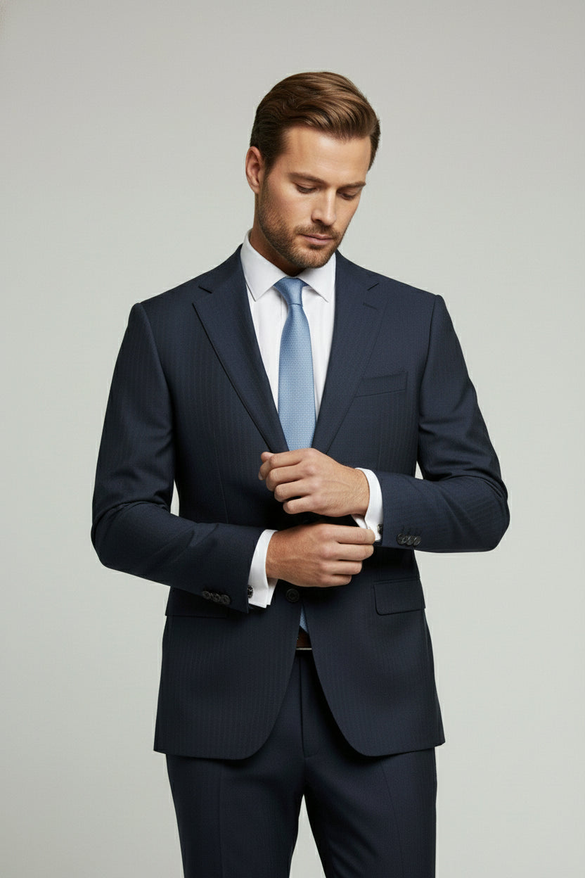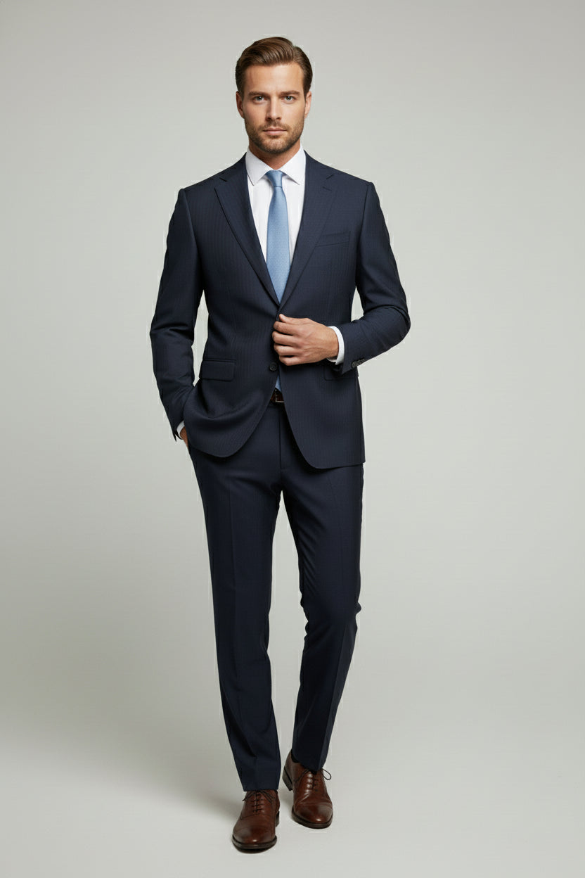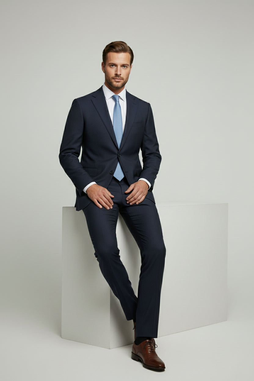 The Navy Blue Pinstripe Two-Piece Suit combines timeless tailoring with contemporary finesse — designed for the man who values understated luxury. Rendered in a deep navy tone with subtle vertical pinstripes, this suit elongates the silhouette, exuding confidence and refinement.