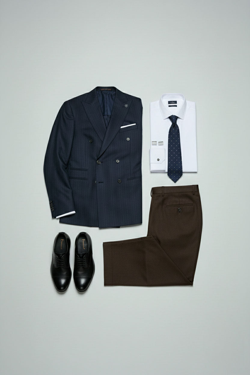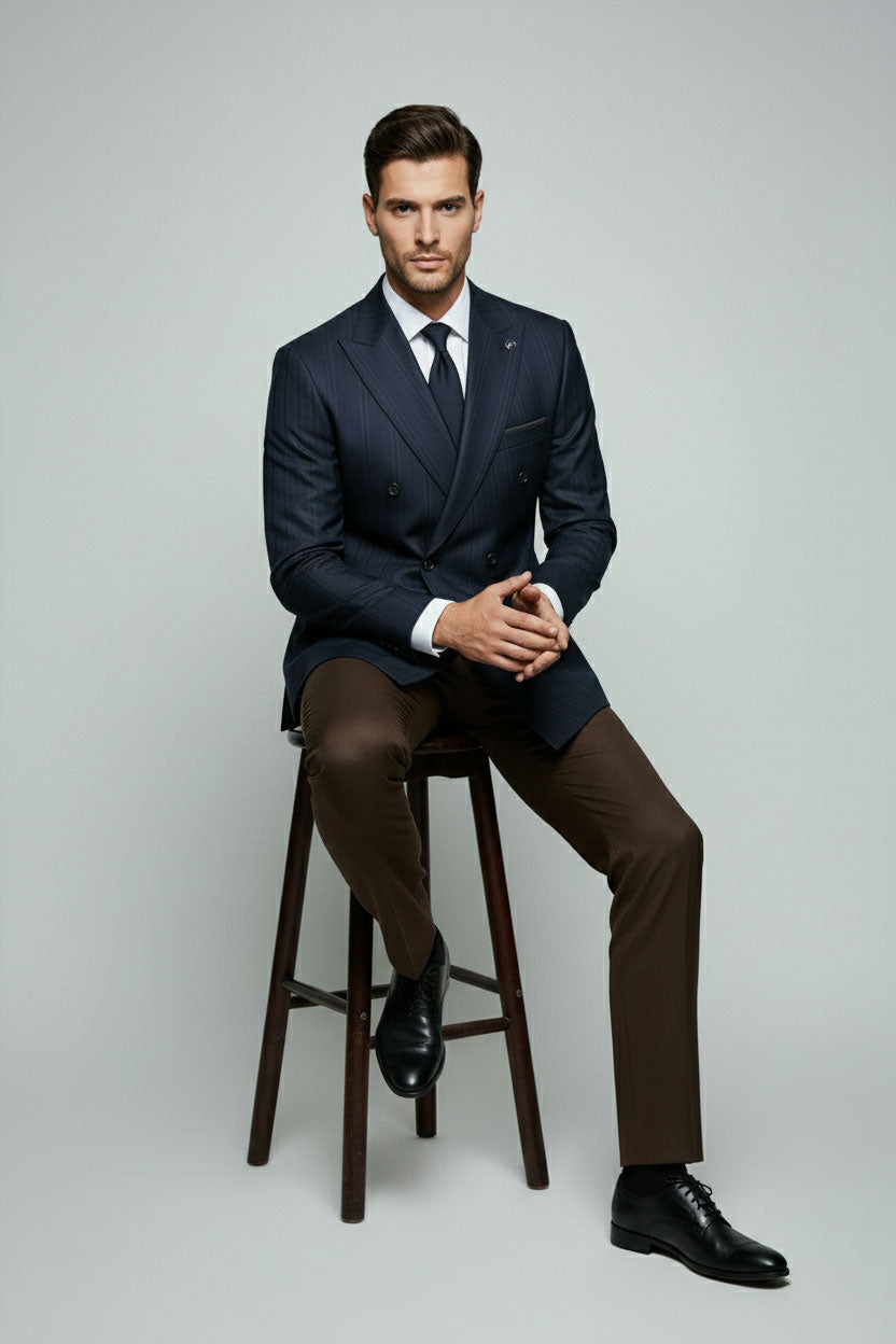 The Navy & Brown Combination Double-Breasted Suit is the embodiment of elevated sartorial craftsmanship and distinctive modern styling. This refined ensemble pairs a navy herringbone-patterned jacket with rich brown tailored trousers, creating a striking contrast that exudes confidence and class.