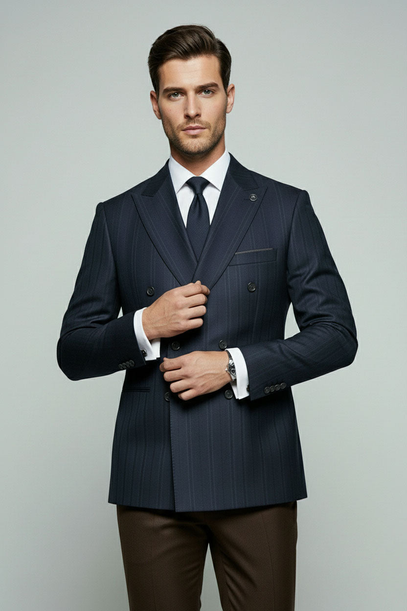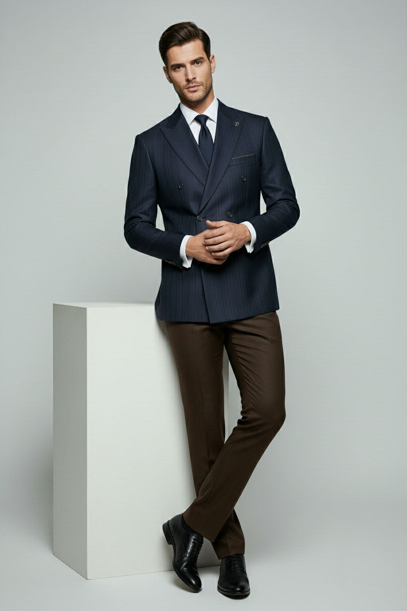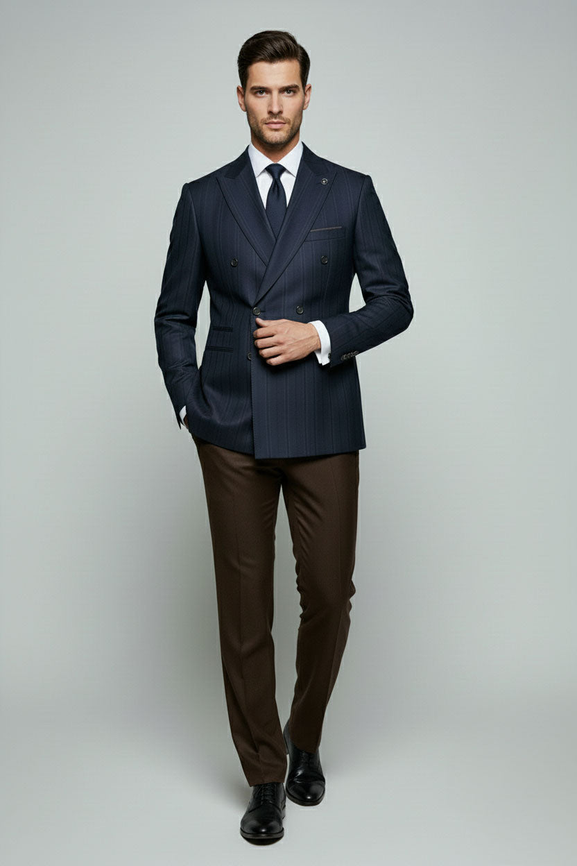 The jacket features a six-button double-breasted front, peak lapels, and discreet woven detailing along the pocket trims — hallmarks of meticulous tailoring. The herringbone weave subtly plays with light, adding depth and dimension to the deep navy tone. The trousers, cut from premium brown suiting fabric, complete the look with warmth and sophistication, making this set ideal for men who appreciate refined, statement dressing.