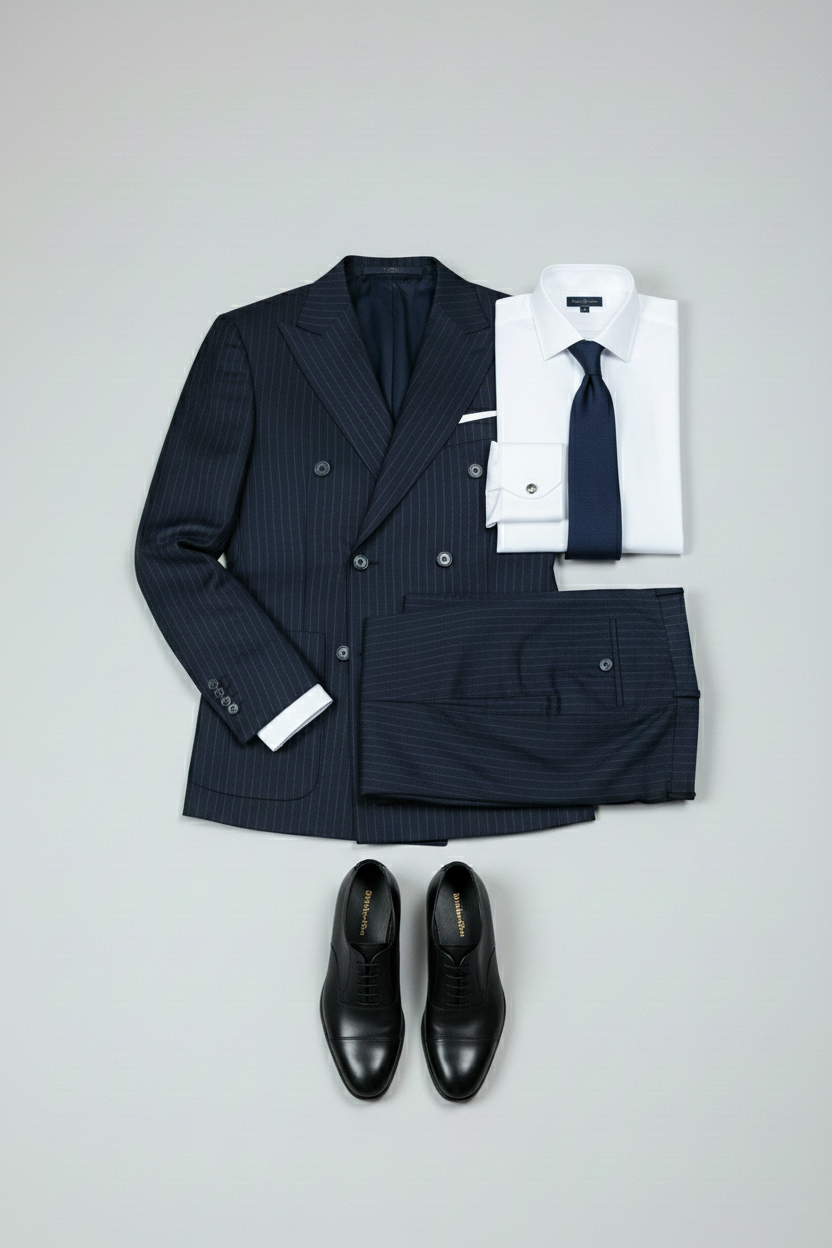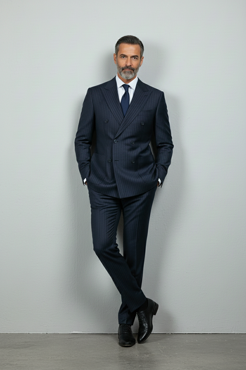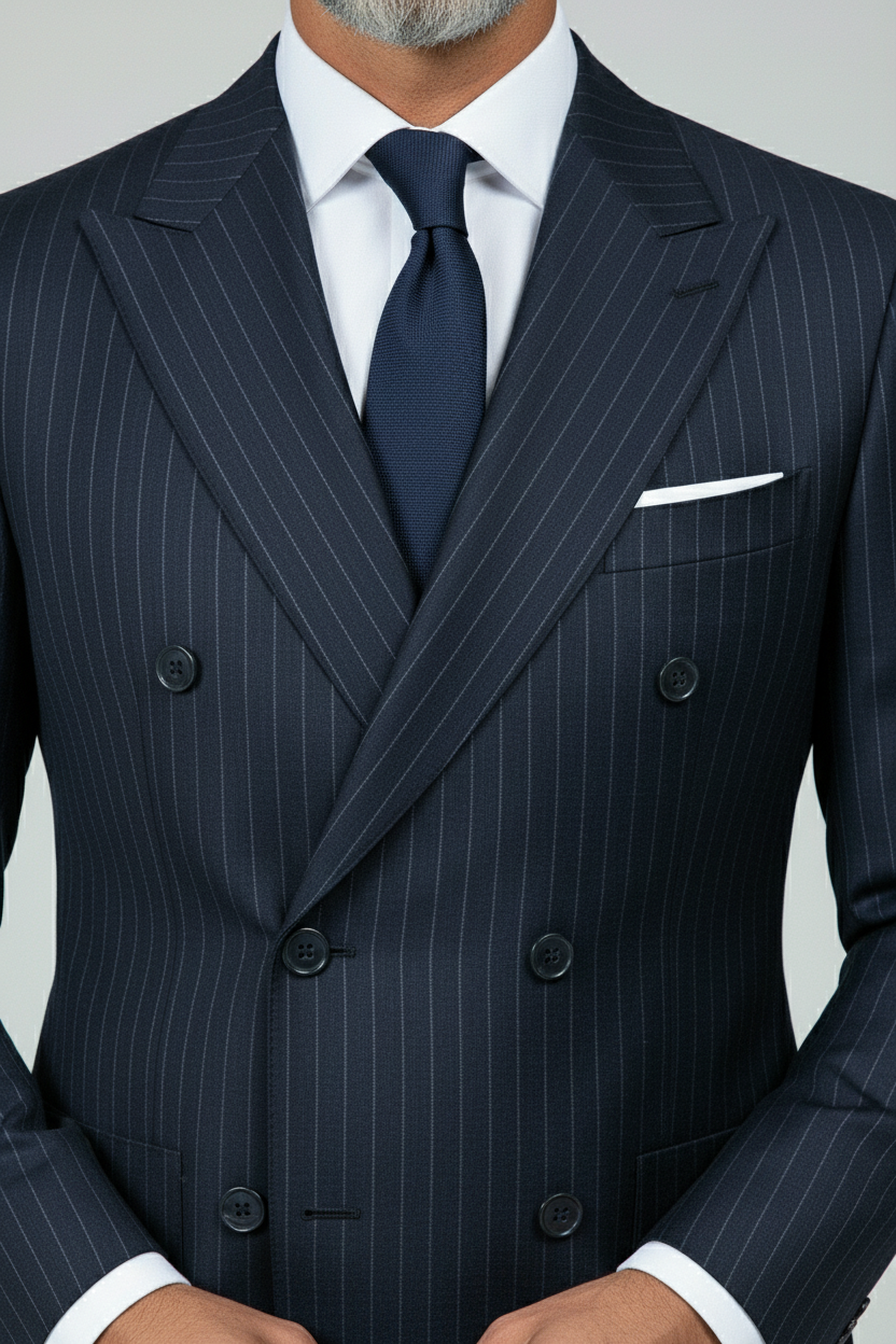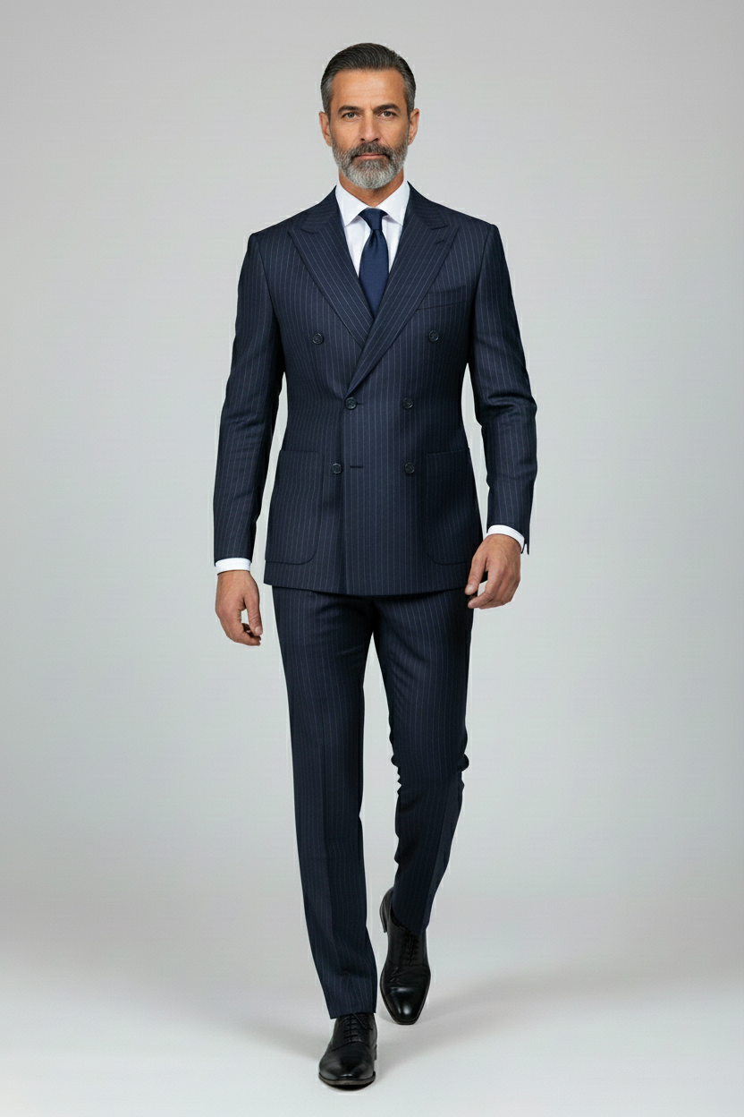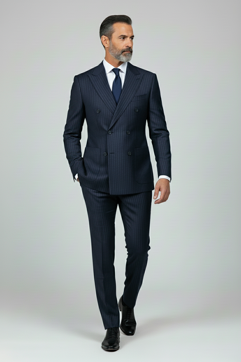 Command attention with our Navy Pinstripe Double-Breasted Suit, a hallmark of sophistication ideal for formal events. The exquisite pinstripe pattern adds a touch of timeless elegance.