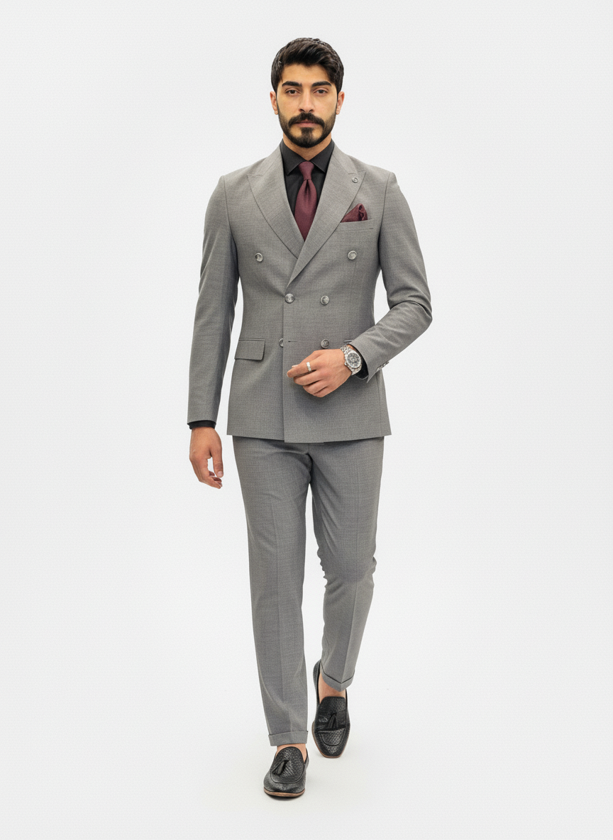 Sharp, refined, and timeless — this grey double-breasted slim-fit suit is tailored for the modern gentleman. Featuring peak lapels, a structured double-breasted front, and a clean slim silhouette, it offers a perfect balance of classic tailoring and contemporary style.