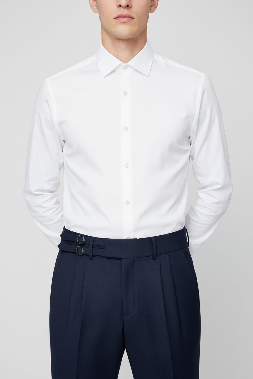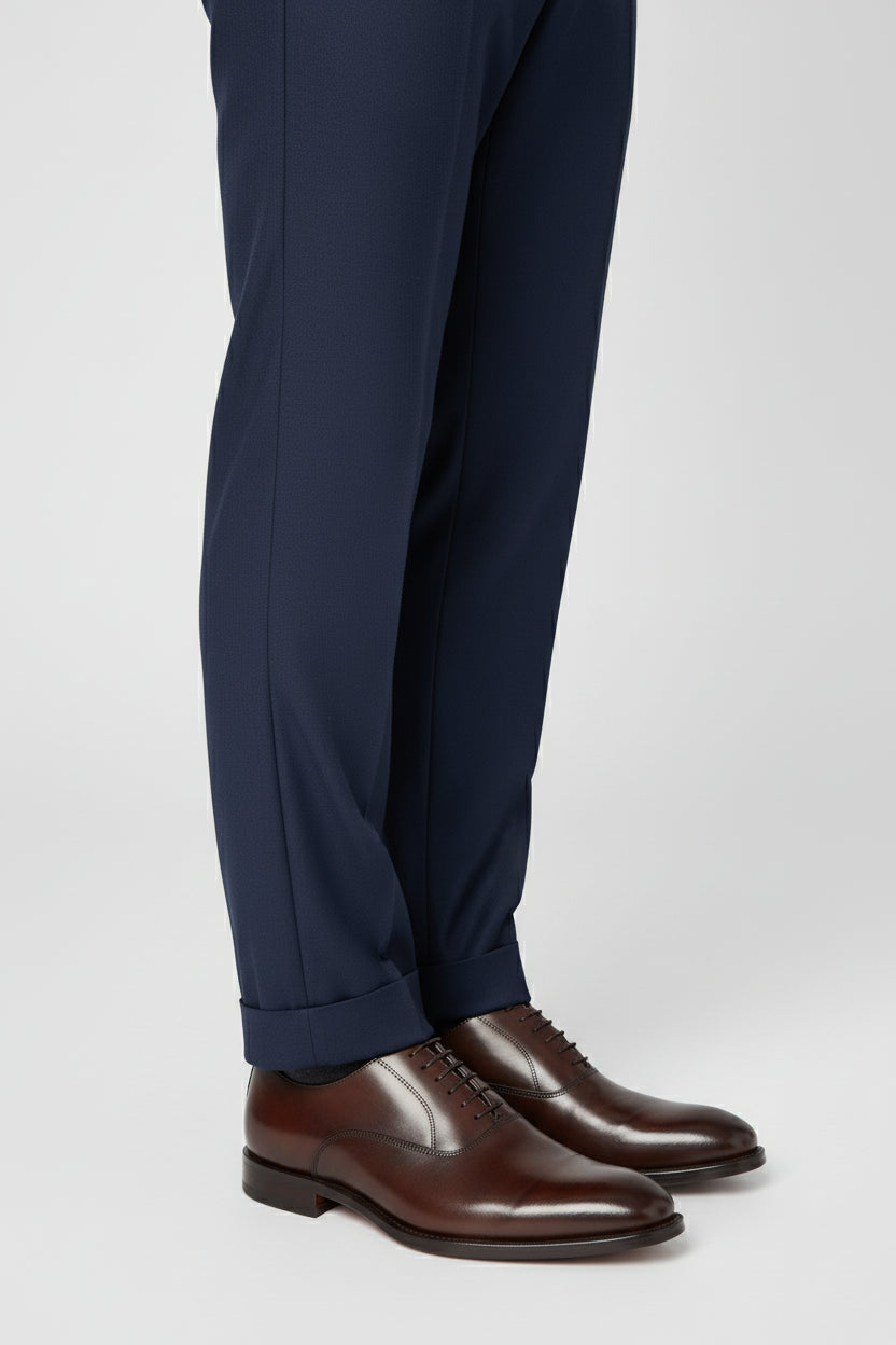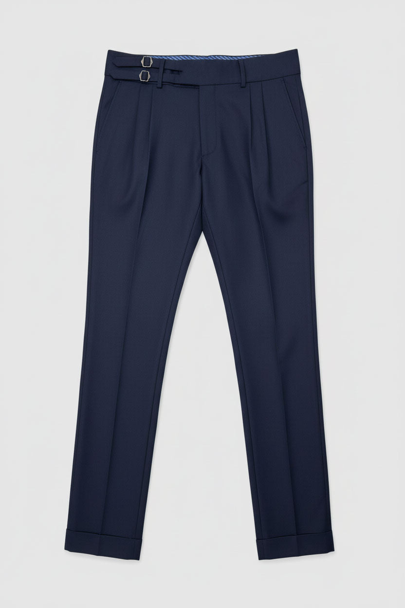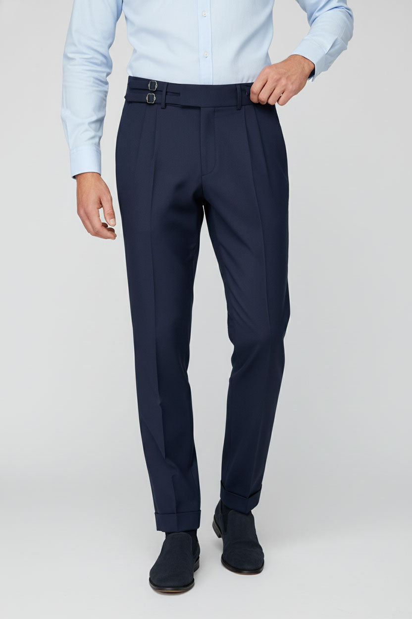Crafted from a premium polyester-viscose blend, they provide a refined drape with subtle sheen and smooth touch. The dual side adjuster buckles offer a slightly adjustable waist, allowing for precision fit without the need for a belt — keeping your profile clean and tailored.