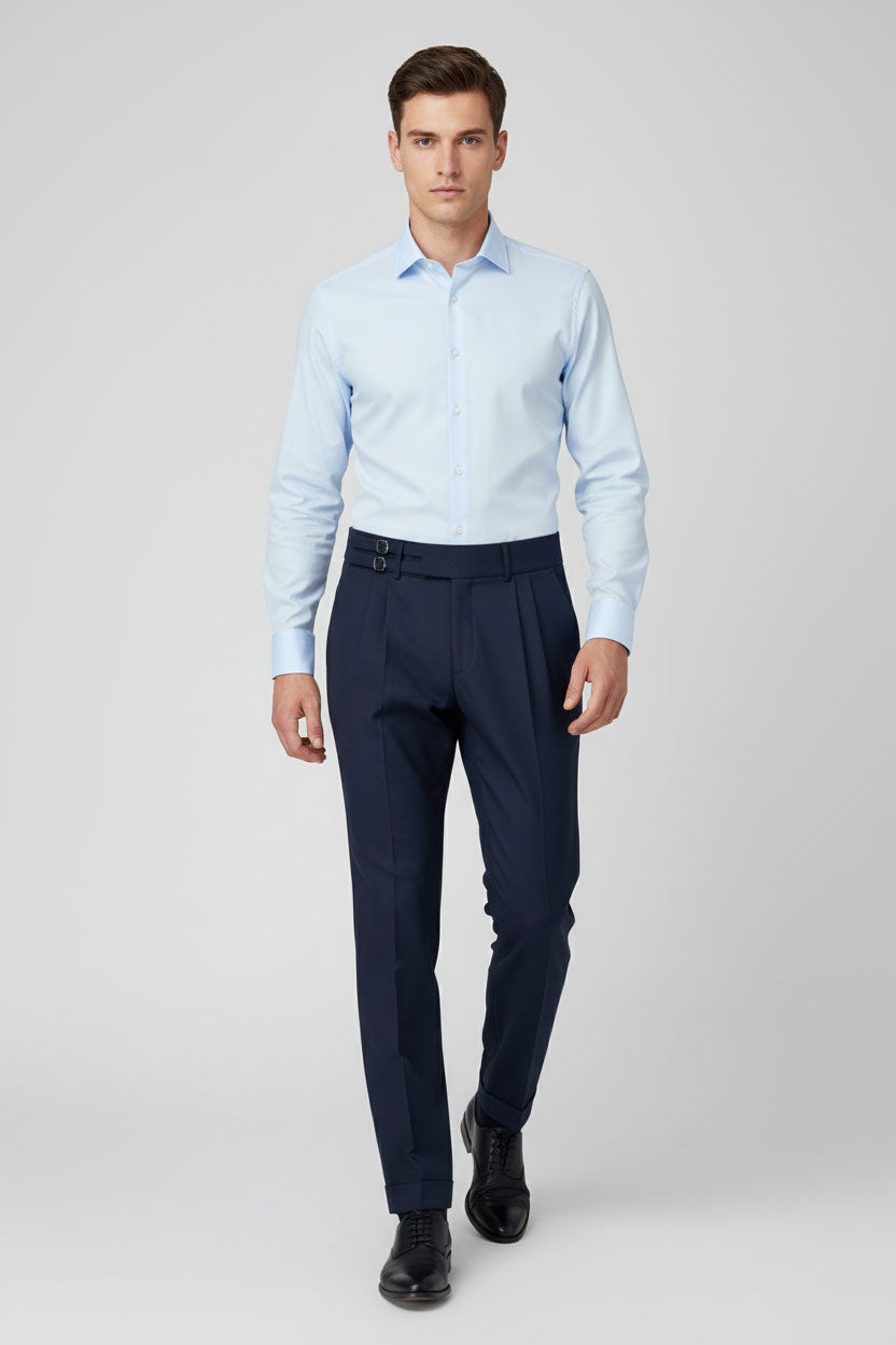 Navy High-Waisted Pants with Double Buckles