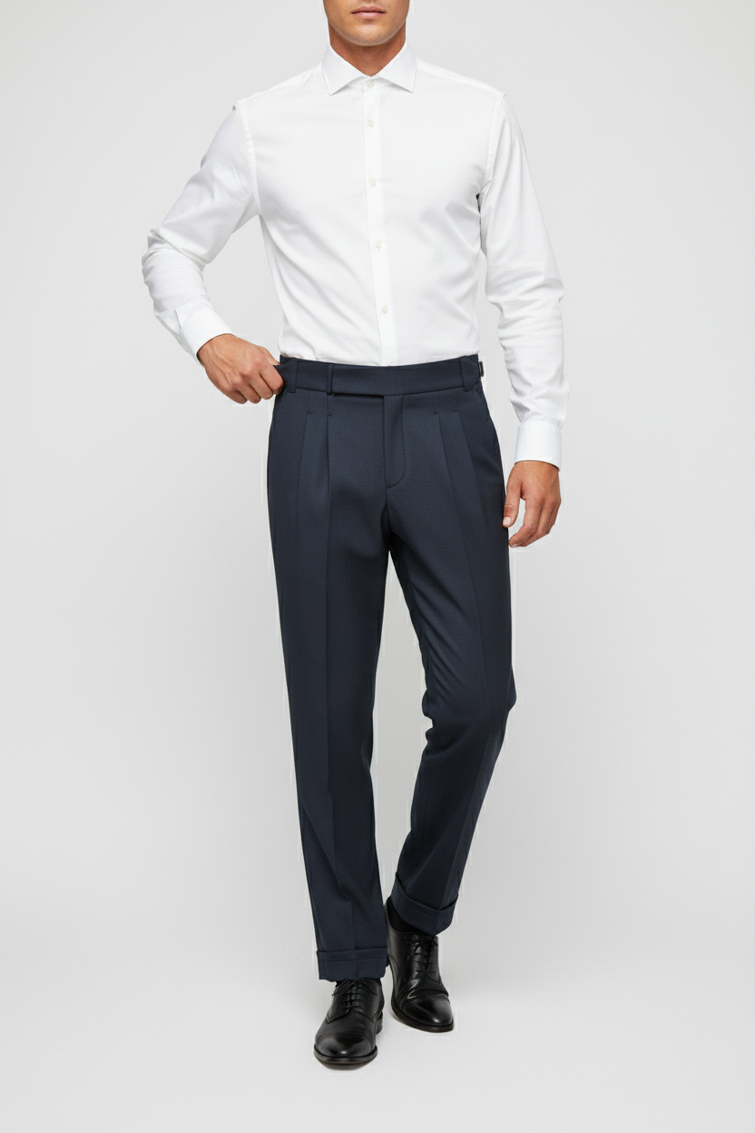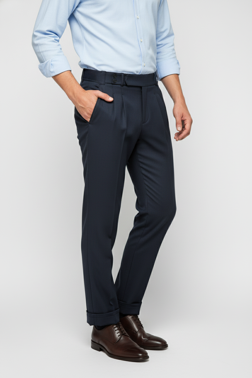 Crafted from a smooth poly-viscose blend, they provide a polished drape and lightweight comfort, ideal for both formal and smart-casual wear. The design is enhanced with side adjusters, front pleats, and cuffed hems, ensuring a clean yet comfortable fit that transitions effortlessly from business to evening occasions.