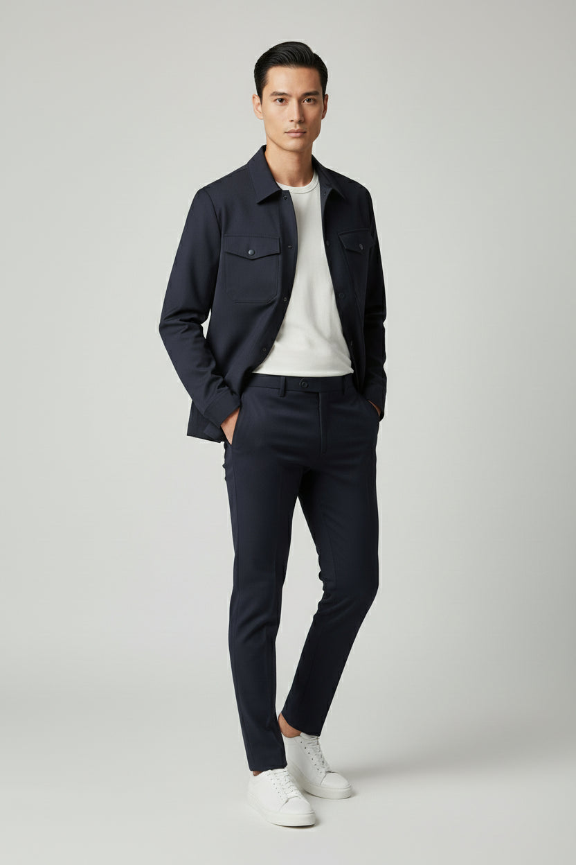 This Navy Modern Safari Suit delivers a refined interpretation of relaxed tailoring. Designed with a safari-style jacket, it features a straight collar, clean silhouette, and functional flap chest pockets that enhance its contemporary character. The front button closure maintains a streamlined profile, while the tailored trousers complete the look with balanced proportions and a polished finish. Crafted from premium fabric, this suit is ideal for business-casual environments, daytime events, and confident off-duty styling with a refined edge.