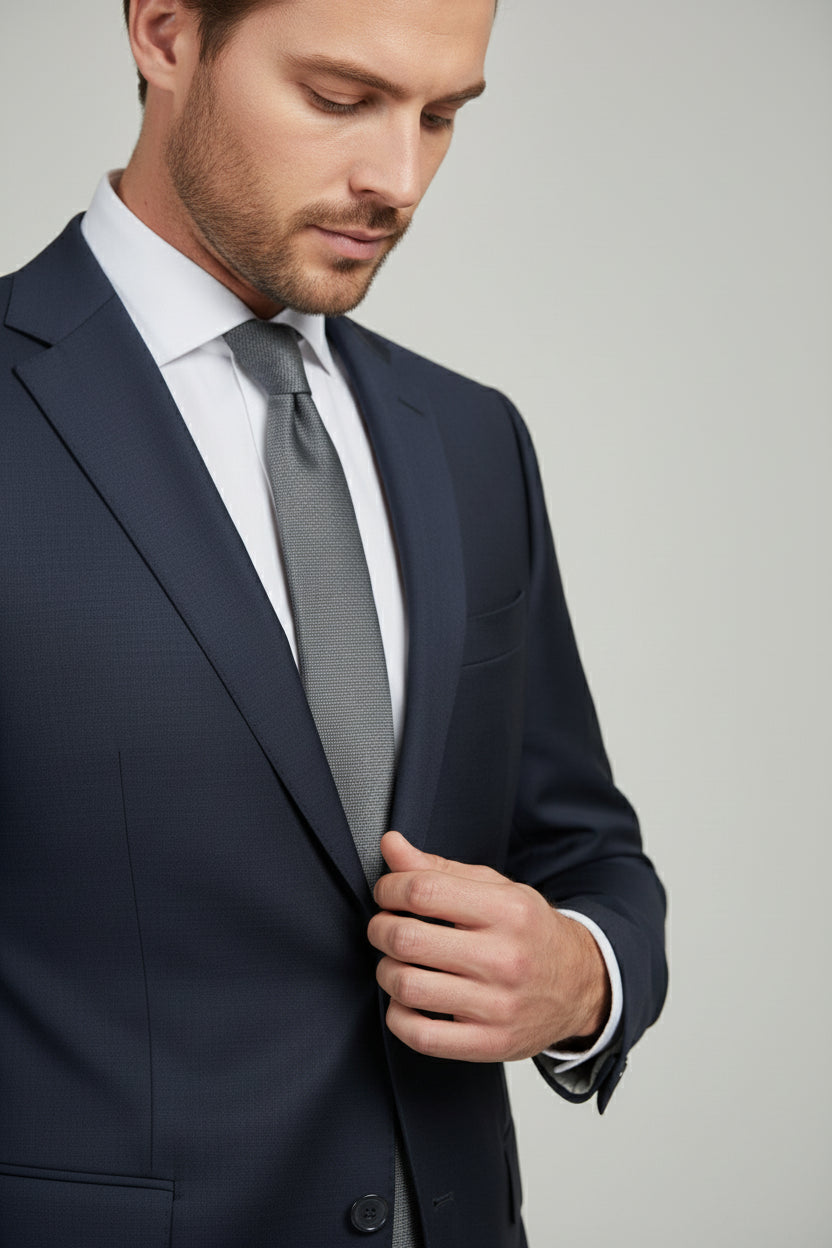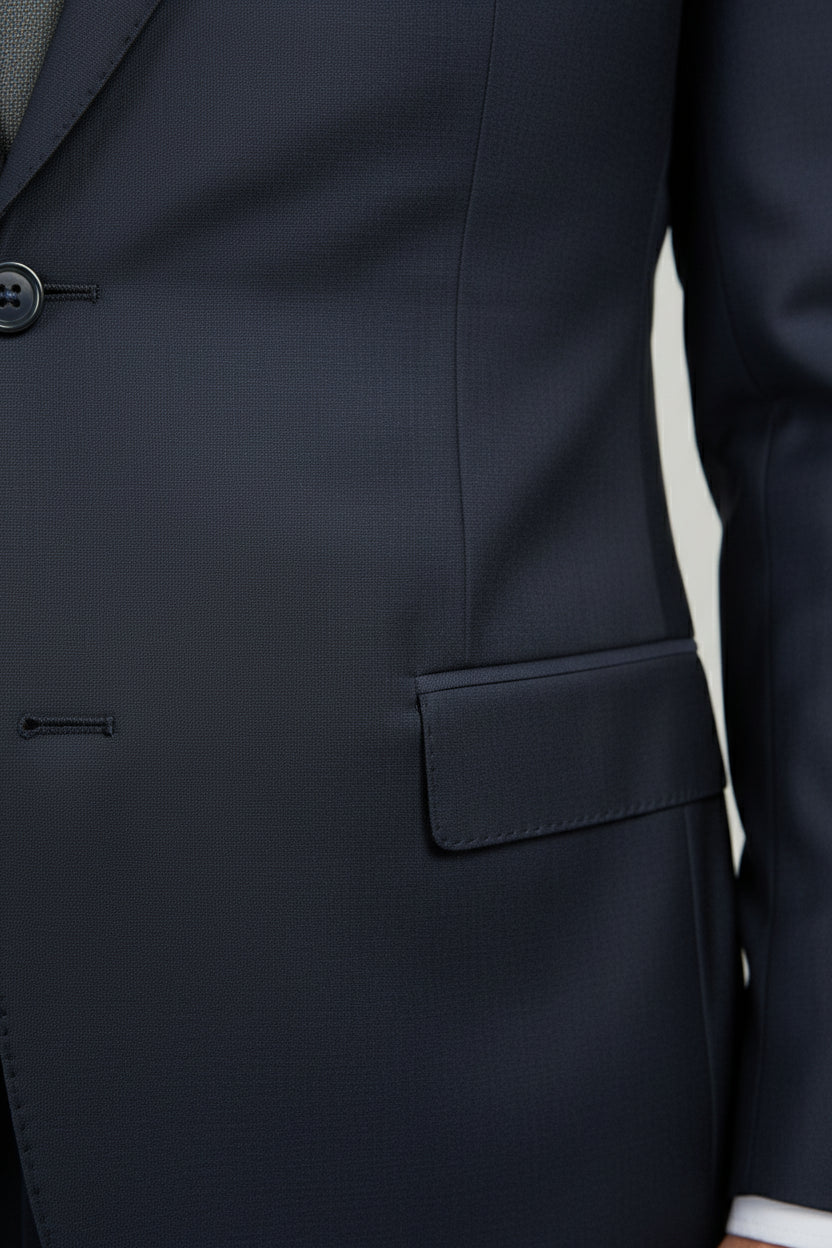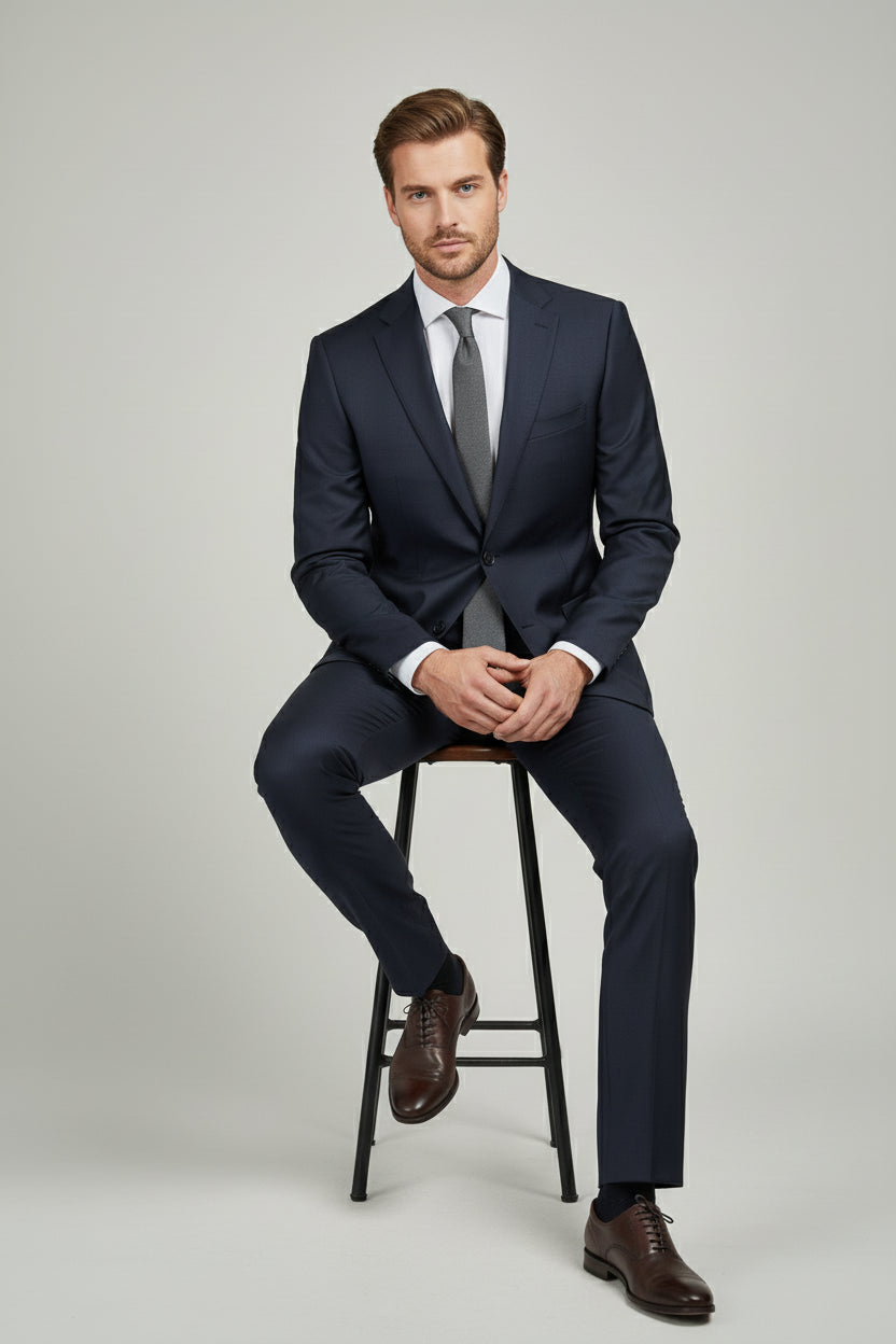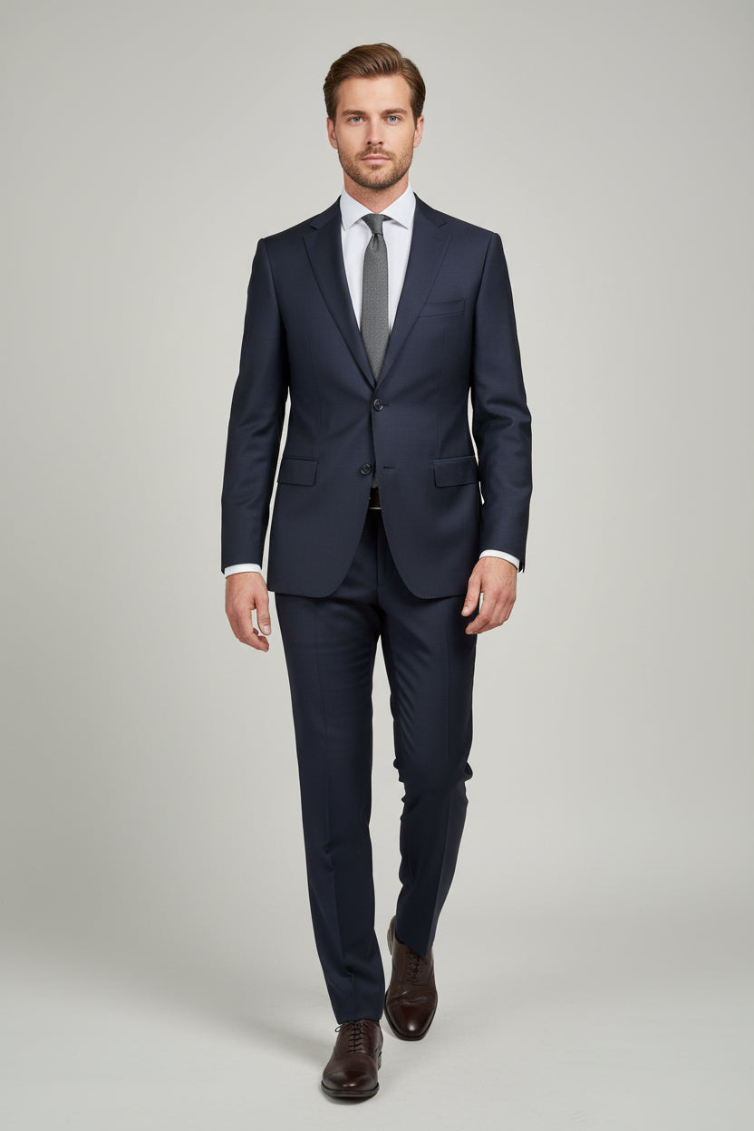 This Navy Two-Piece Suit delivers timeless tailoring with a refined, modern silhouette. Designed with a classic notch lapel and single-breasted closure, it offers clean lines and balanced proportions suitable for versatile formal dressing. The structured shoulders and sharp waist shaping enhance the overall profile, creating a polished and confident look. Crafted from a premium wool blend (86% wool, 10% PA, 4% lycra), it combines natural structure with subtle flexibility for comfort throughout the day. An ideal choice for business settings, formal occasions, and elevated professional wear.
