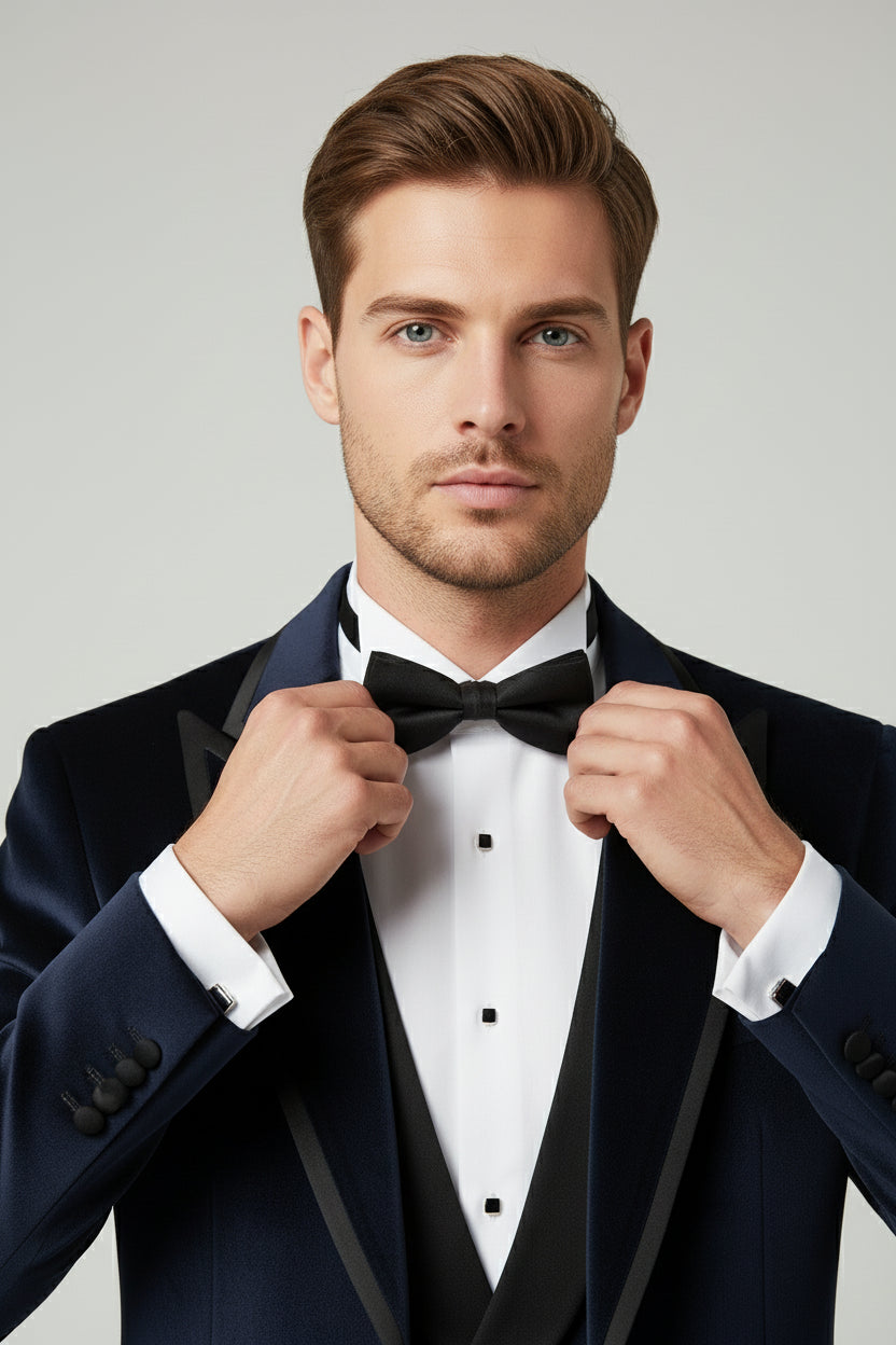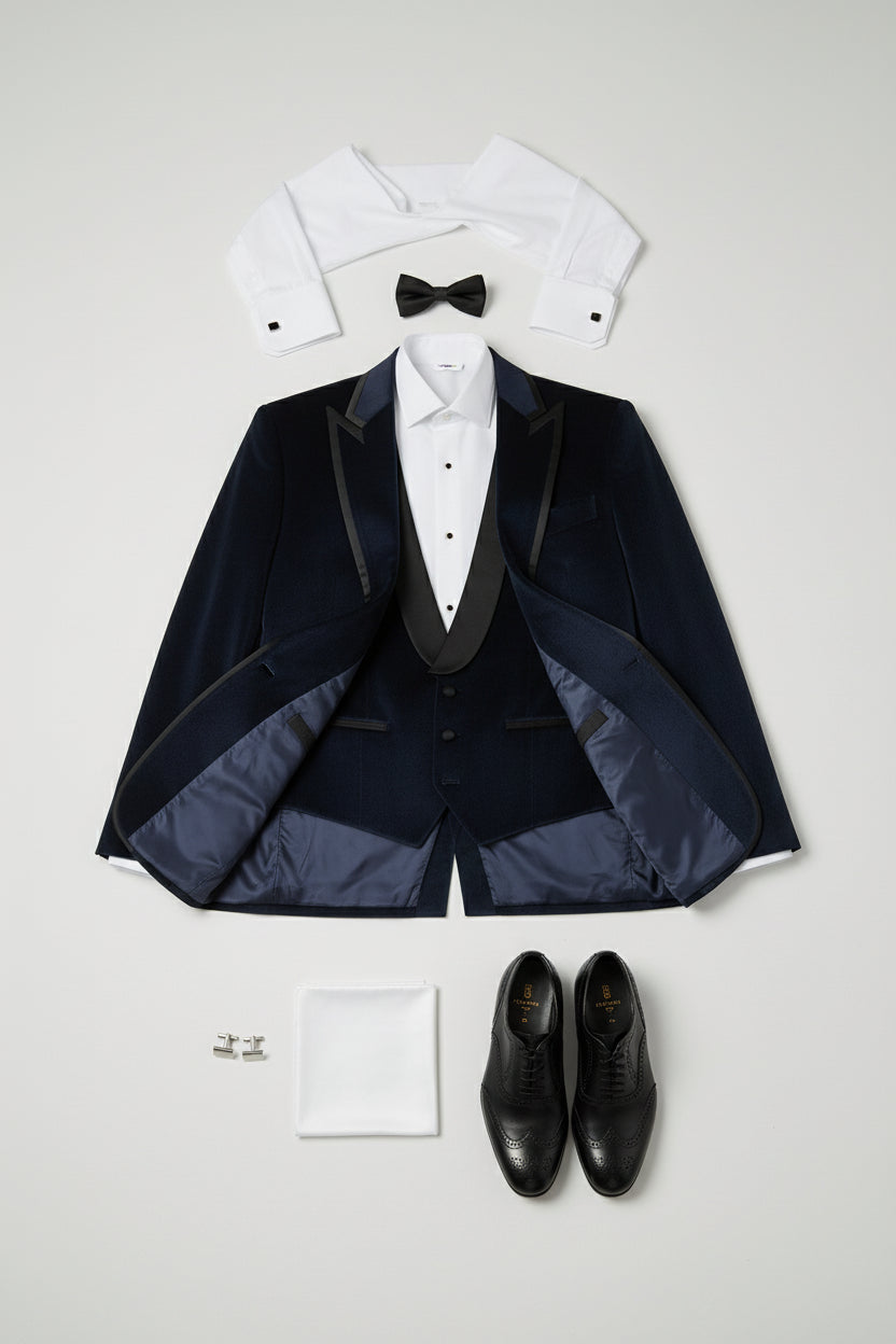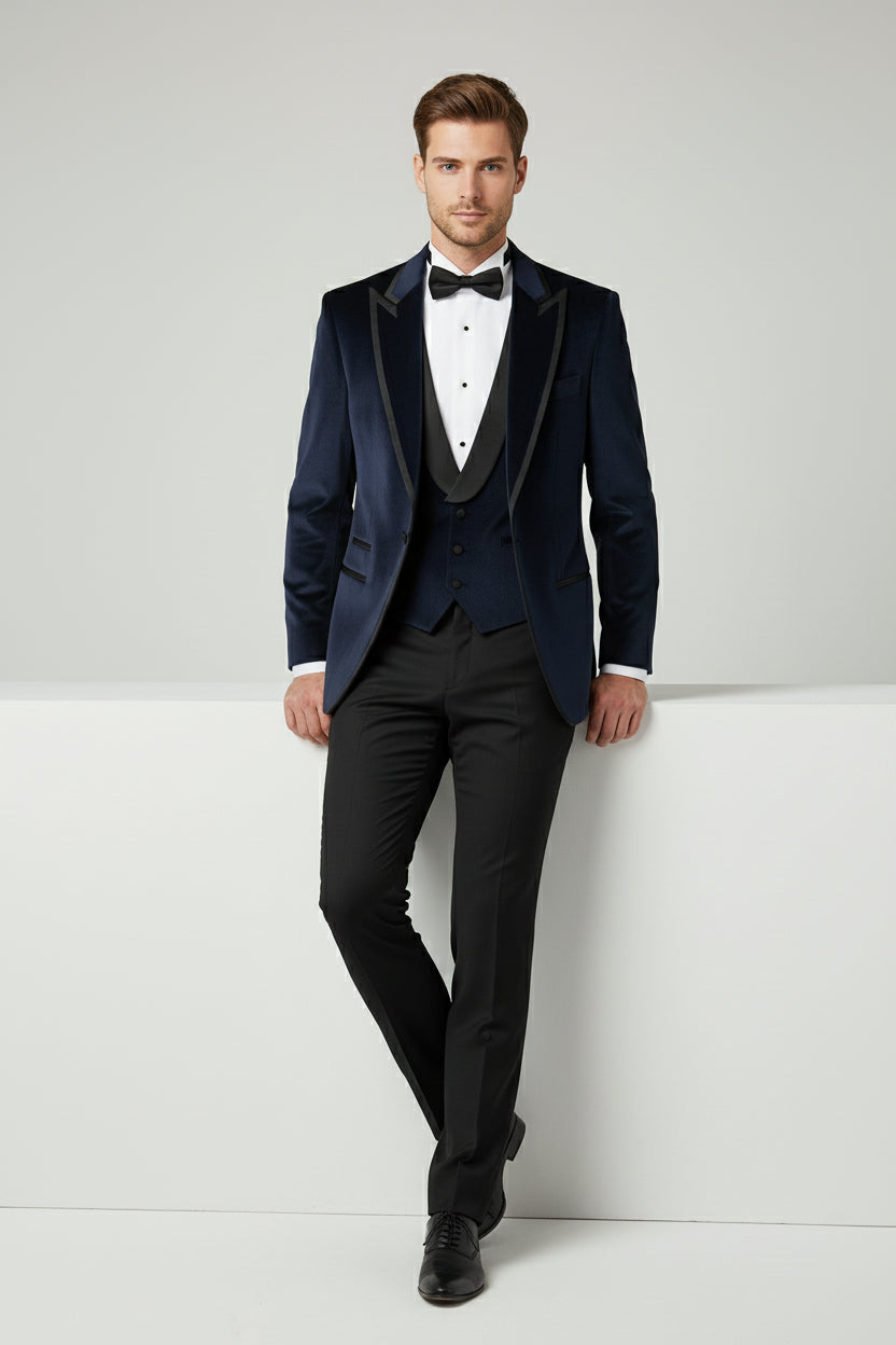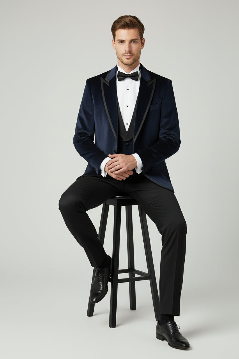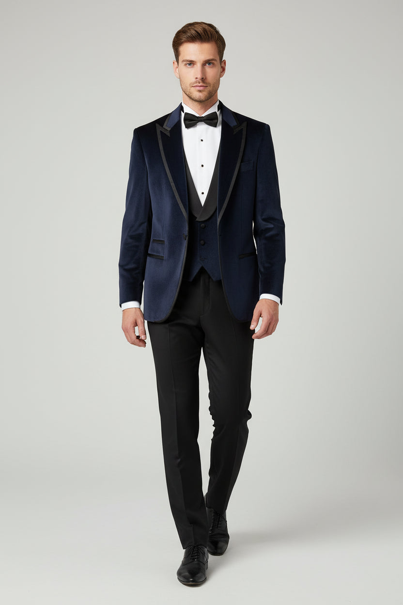 A statement three-piece tuxedo crafted for refined evening elegance. The navy blue velvet jacket delivers a rich, lustrous finish with a soft, tactile depth that elevates the silhouette. Tailored with structured shoulders, sharp peak lapels, and a clean front, it creates a commanding yet sophisticated presence. Subtle velvet detailing continues across the matching vest, adding cohesion and texture without overpowering the look. Paired with classic plain black tailored trousers, the contrast sharpens the ensemble and grounds it in timeless tuxedo tradition. Ideal for black-tie events, formal evenings, and occasions where distinction is essential.