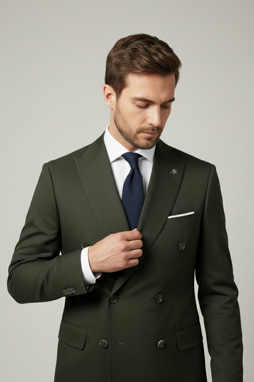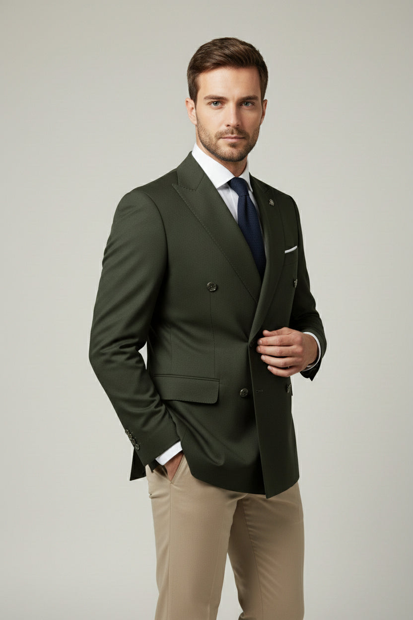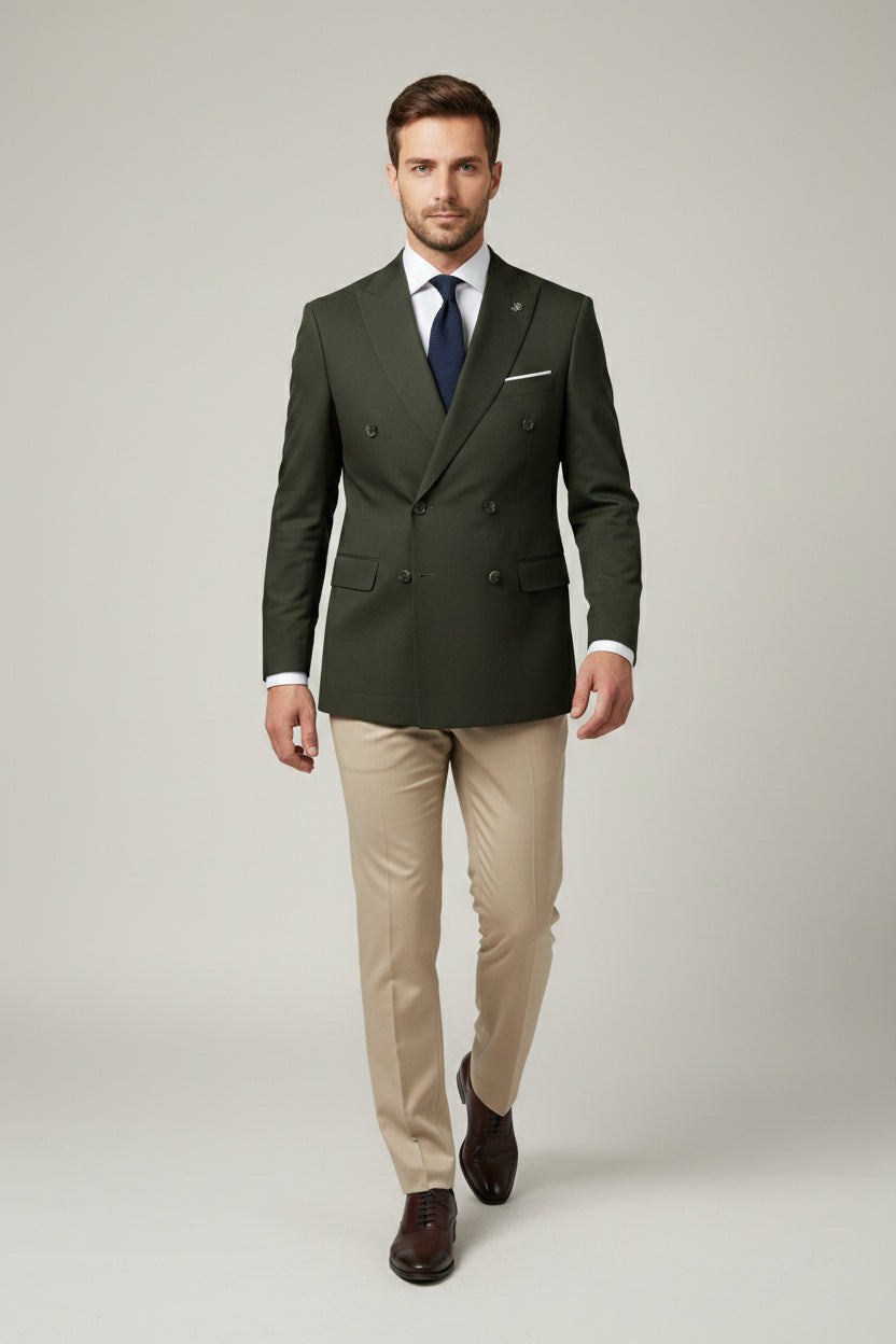 This olive green and beige combination double-breasted two-piece suit offers a sophisticated balance between classic tailoring and contemporary color contrast. The olive green double-breasted jacket is designed with structured peak lapels, a six-button front, and clean flap pockets for a sharp, confident profile.