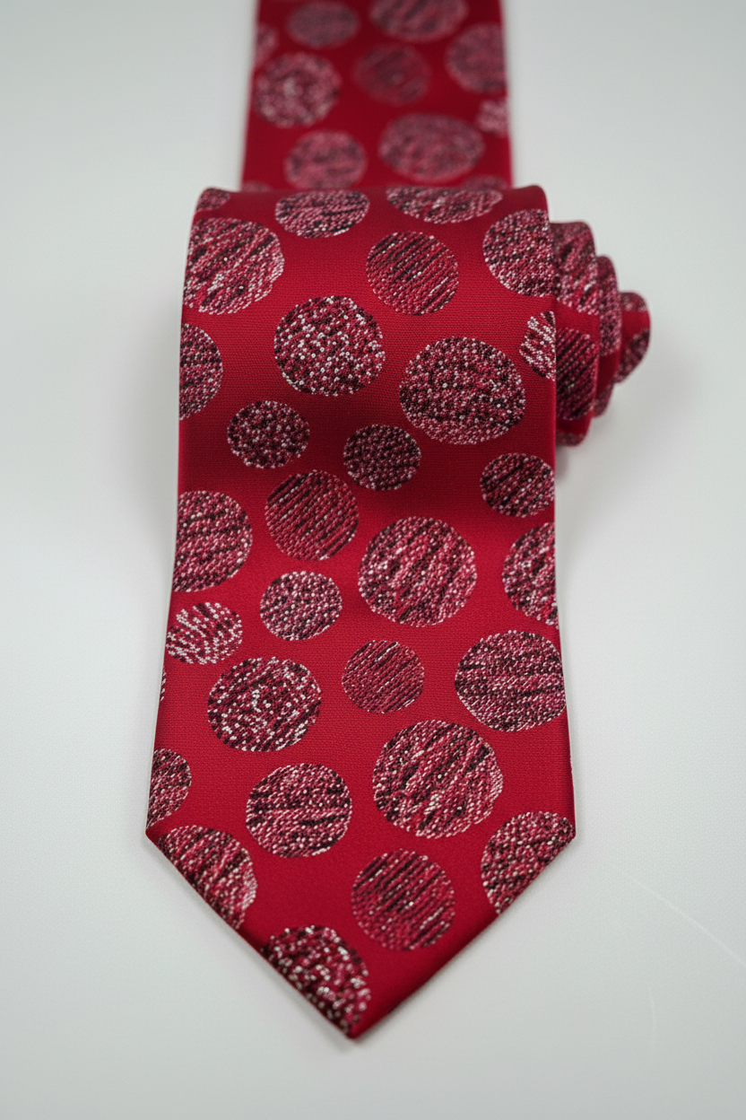 Elevate your ensemble with this striking red silk tie, adorned with textured polka dots. Perfect for making a bold statement at any formal occasion.
