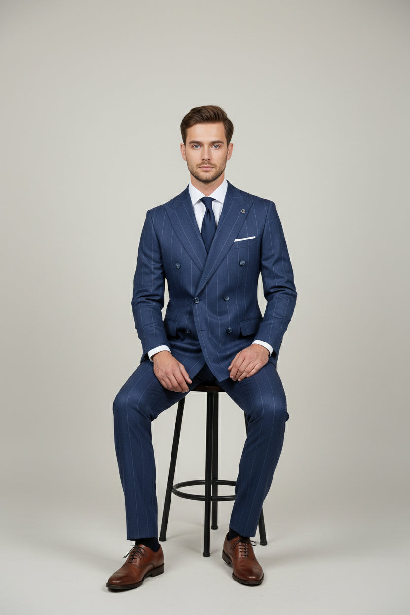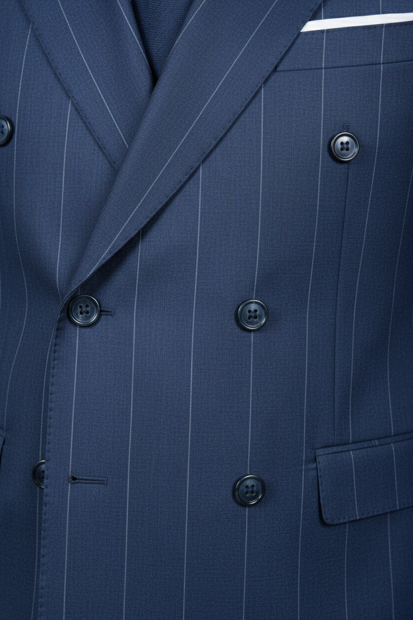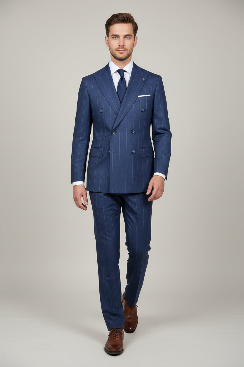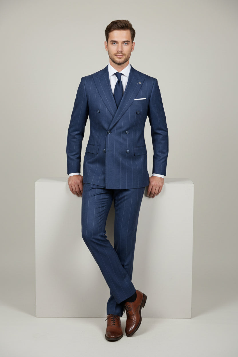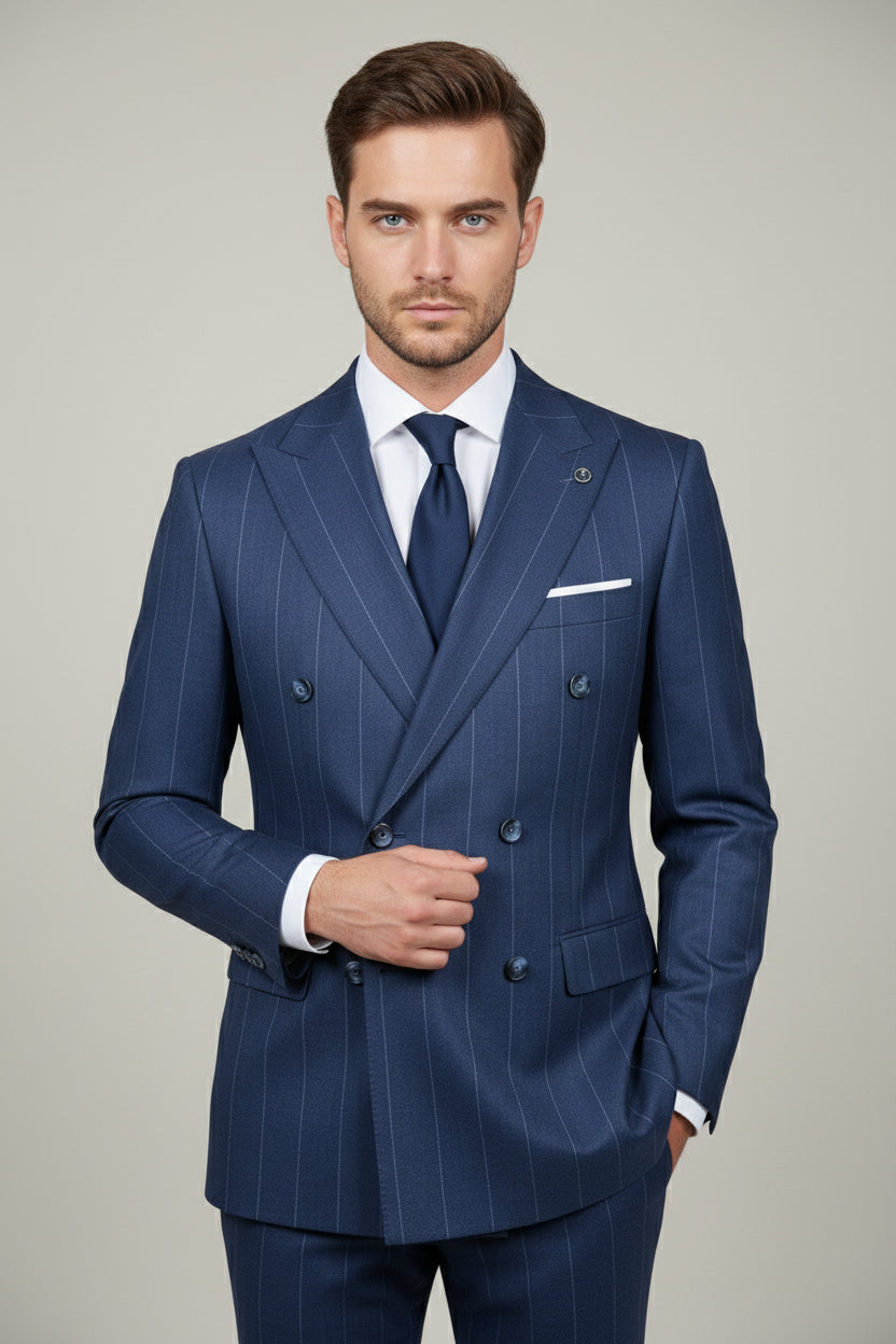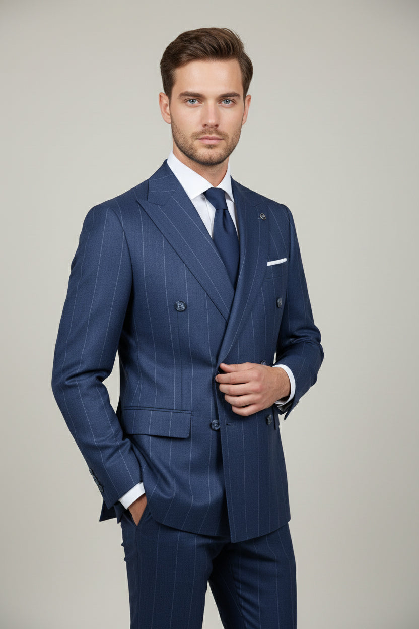 A refined royal blue double-breasted suit accented with clean vertical pinstripes for a sharp, commanding presence. Designed with structured peak lapels and a classic six-button closure, this suit delivers a strong silhouette while maintaining elegance and balance. The tailored fit enhances the shoulders and waist, making it ideal for business, formal occasions, and statement professional wear. A timeless piece with a modern, confident edge.