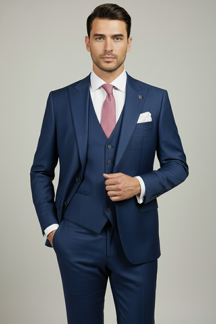The jacket features sharp peak lapels, a structured shoulder, and a two-button front, highlighting a clean, masculine silhouette. The matching waistcoat adds depth and luxury, offering versatile styling — wear it under the jacket for formal impact or alone for a modern twist. The trousers are tailored with a streamlined cut, ensuring comfort without compromising on sharpness.