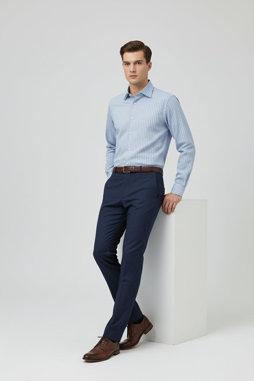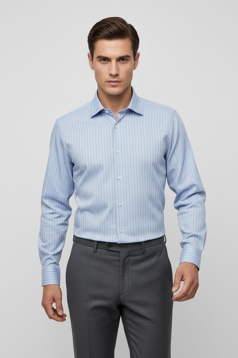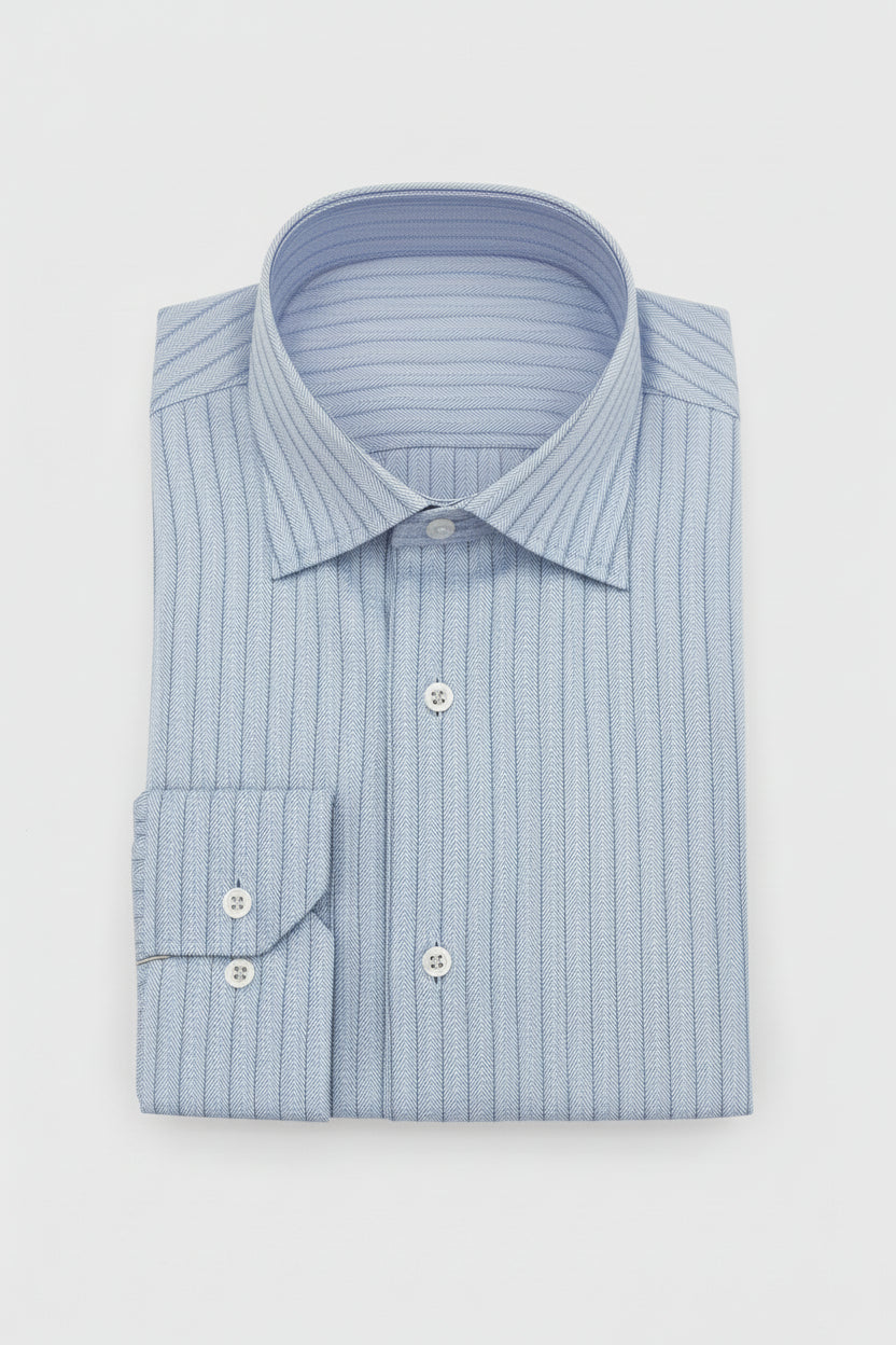This Sky Blue Herringbone Striped Shirt offers a refined balance between texture and pattern. Designed with a classic pointed collar and clean front button closure, it features a subtle herringbone weave layered with vertical stripes for added depth and dimension. The structured yet comfortable silhouette maintains a sharp profile suitable for both tailored and business environments. Crafted from premium fabric, this shirt is ideal for professional settings, formal occasions, and elevated everyday wear where understated detail makes the difference.