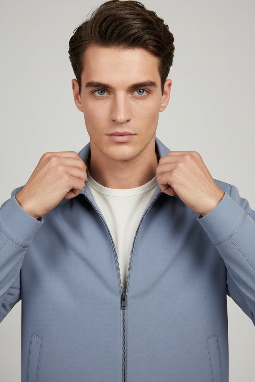 This Sky Blue Zip-Up Safari Suit offers a clean and modern approach to relaxed tailoring. Designed with a minimalist safari-style jacket, it features a straight collar and sleek front zip closure that create a streamlined, contemporary silhouette. The balanced proportions deliver ease while maintaining a sharp profile. Tailored trousers complete the look with a refined, tapered finish. Crafted from polyamid fabric, this suit is lightweight, flexible, and ideal for smart casual environments, travel, and elevated daytime dressing with a fresh, confident edge.