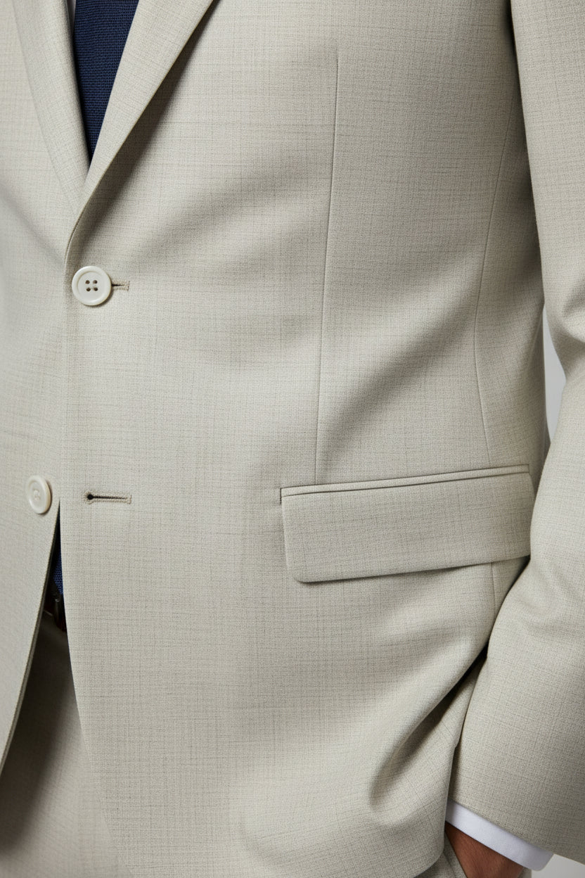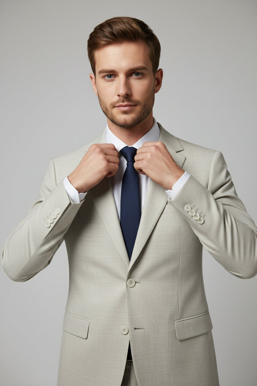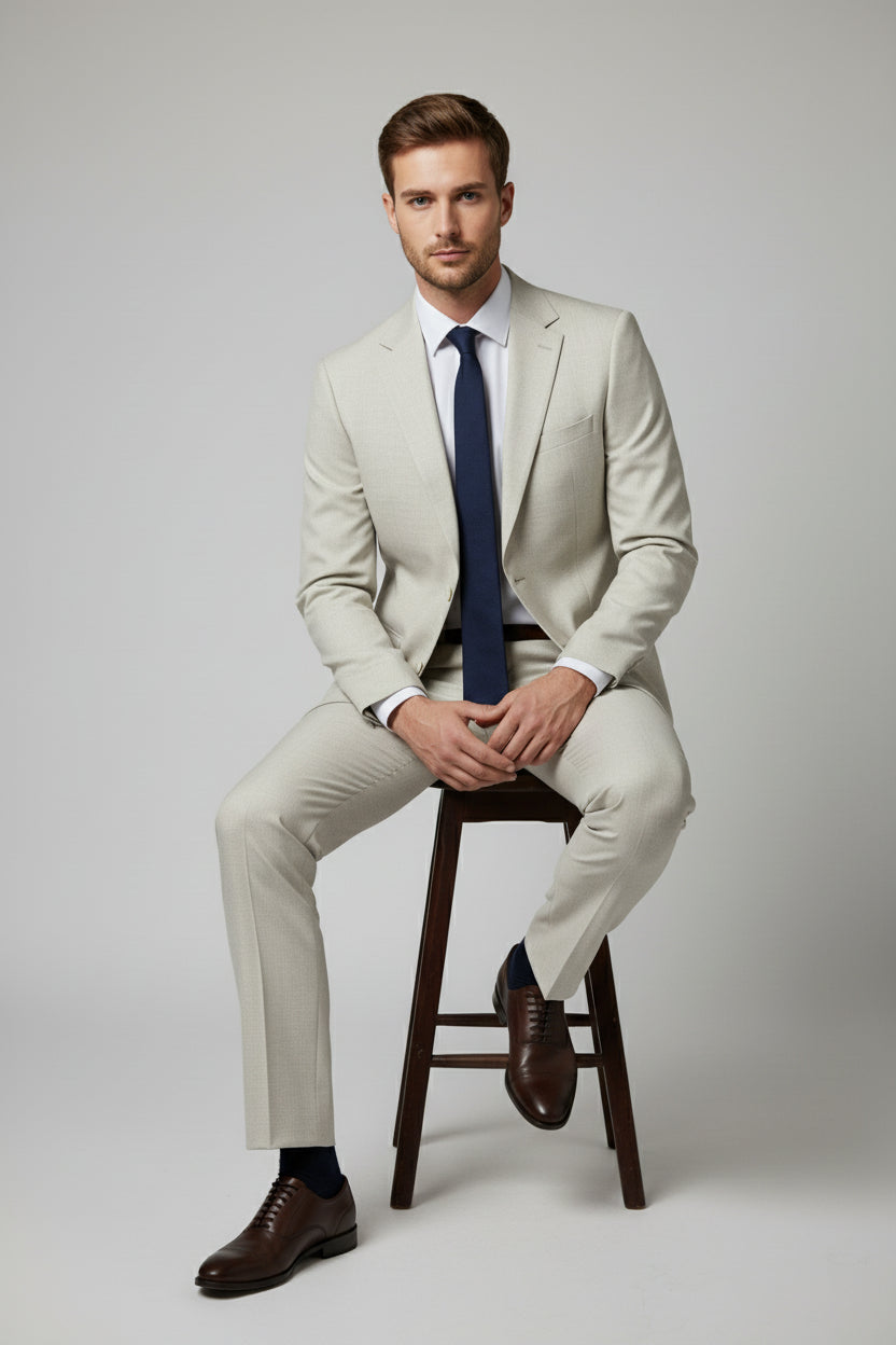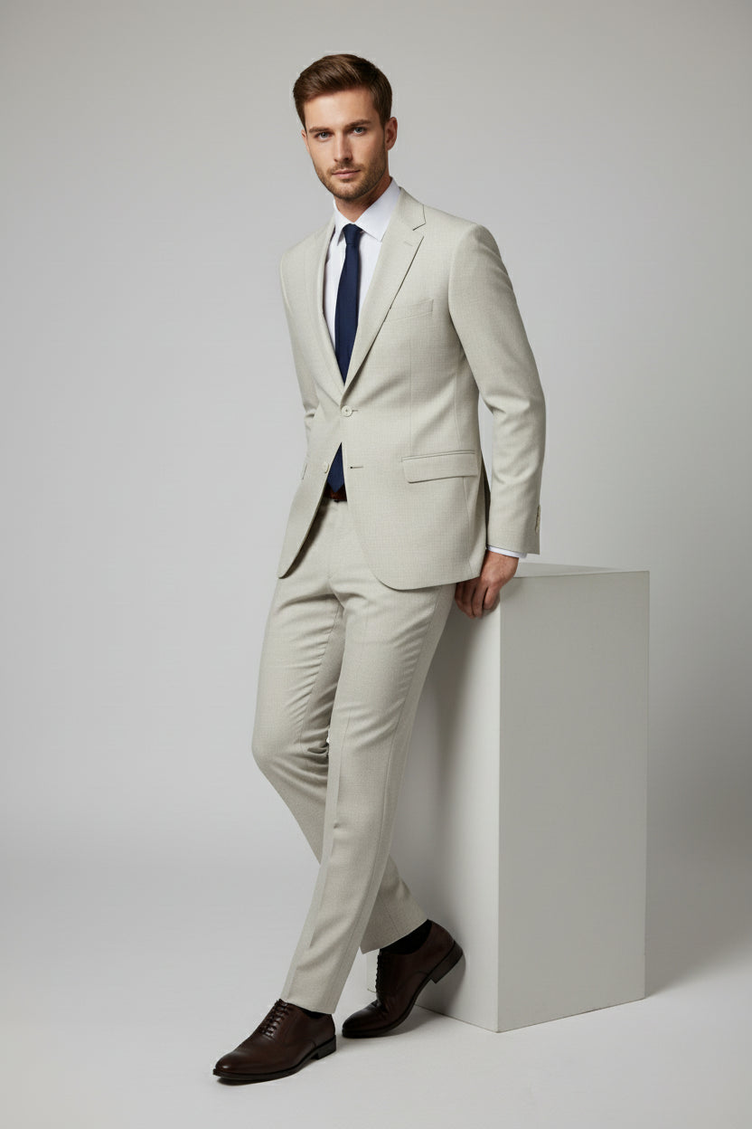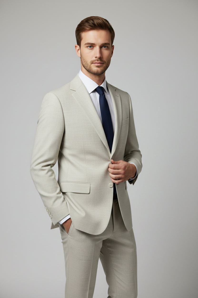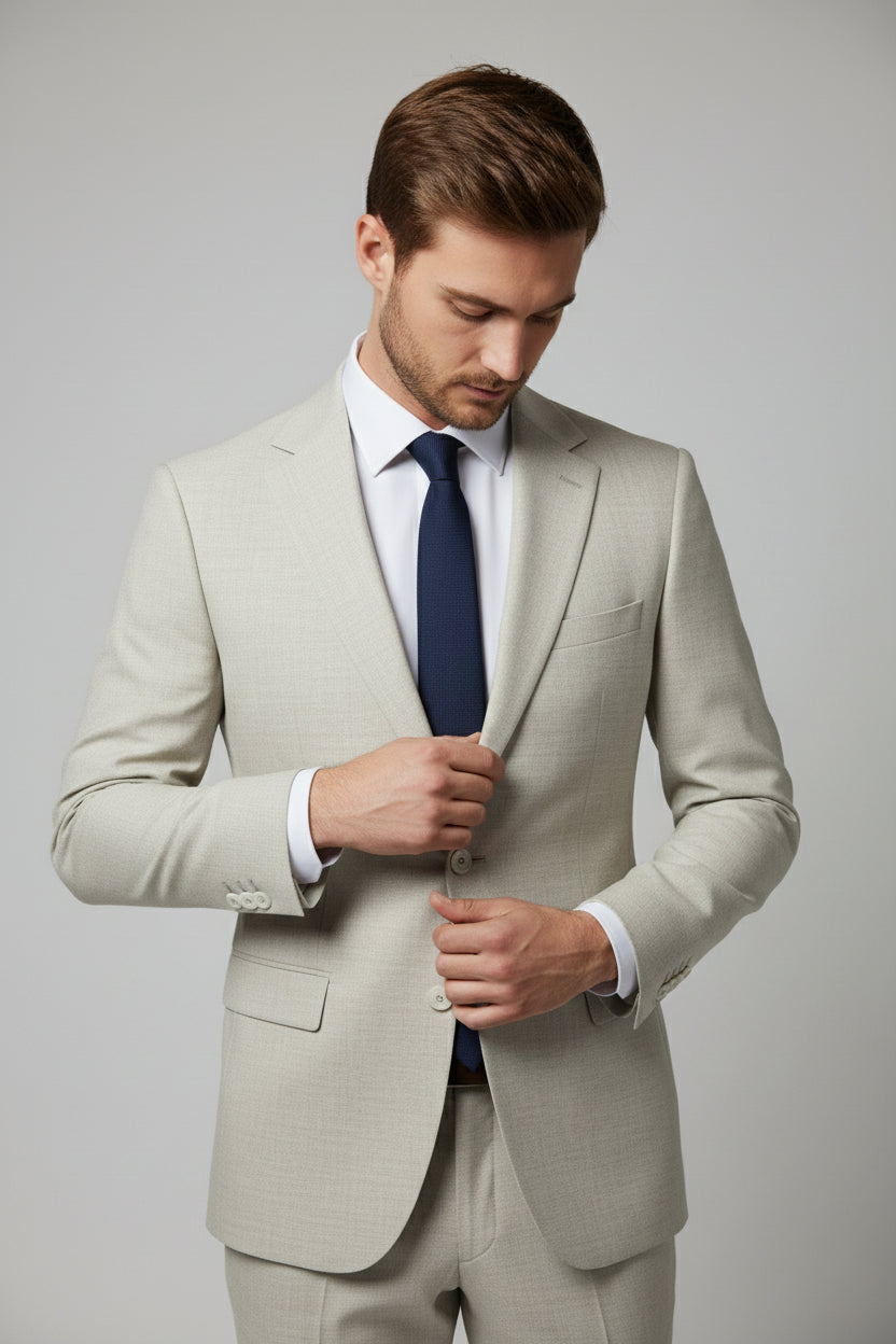 A refined stone beige two-piece suit designed for understated elegance and modern versatility. Tailored with a clean single-breasted silhouette, the blazer features structured shoulders, sharp notch lapels, and a smooth, balanced drape that enhances the profile. The matching tailored trousers complete the look with a precise taper and polished finish. Sophisticated yet effortless, this suit is ideal for business wear, formal daytime occasions, and elevated warm-weather styling.