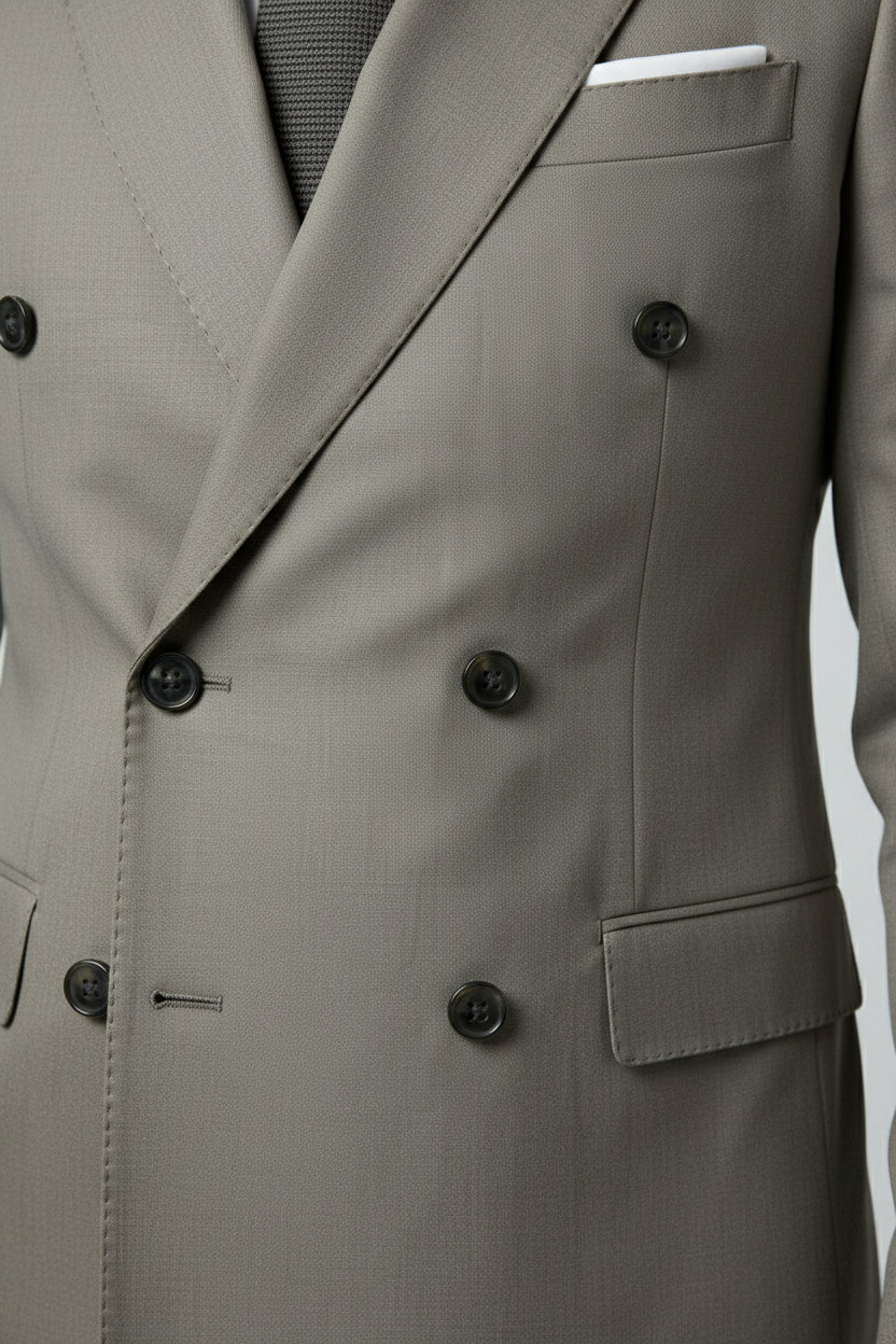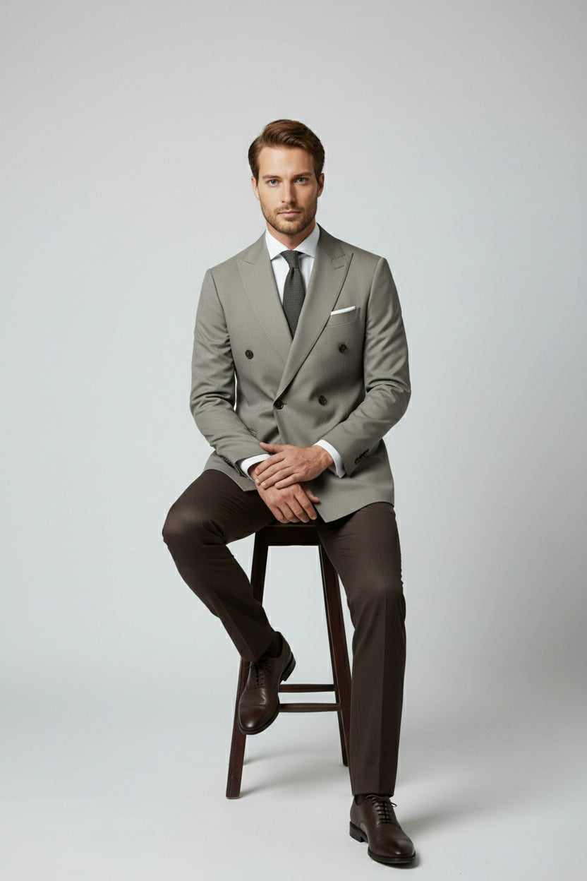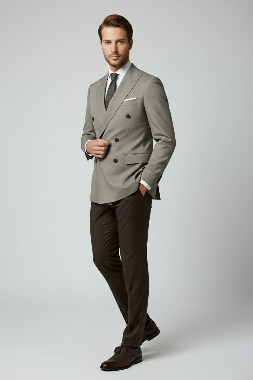 This taupe and brown combination double-breasted two-piece suit delivers a sophisticated blend of modern color contrast and timeless tailoring. The taupe double-breasted jacket features structured peak lapels, a six-button front, and a sharp tailored silhouette that elevates the overall presence.