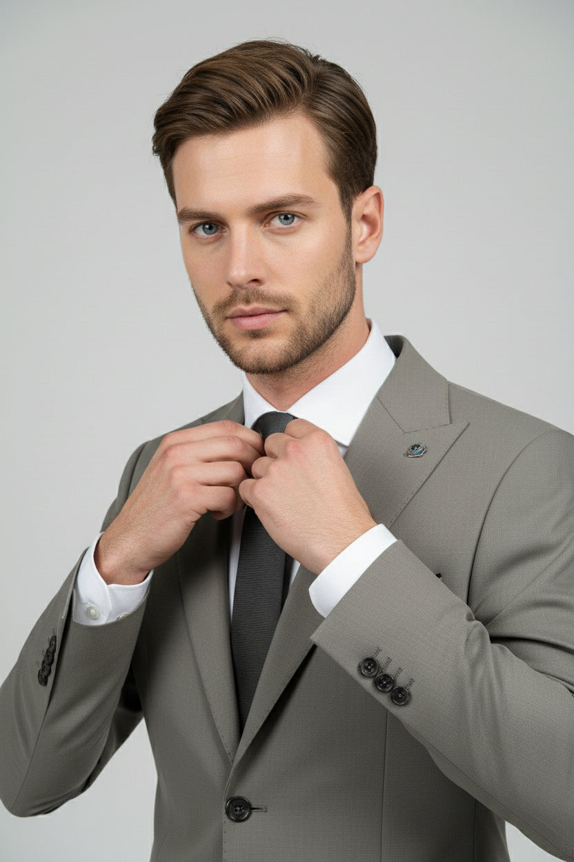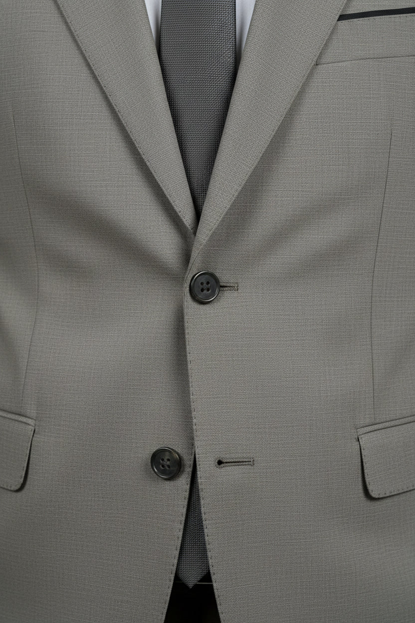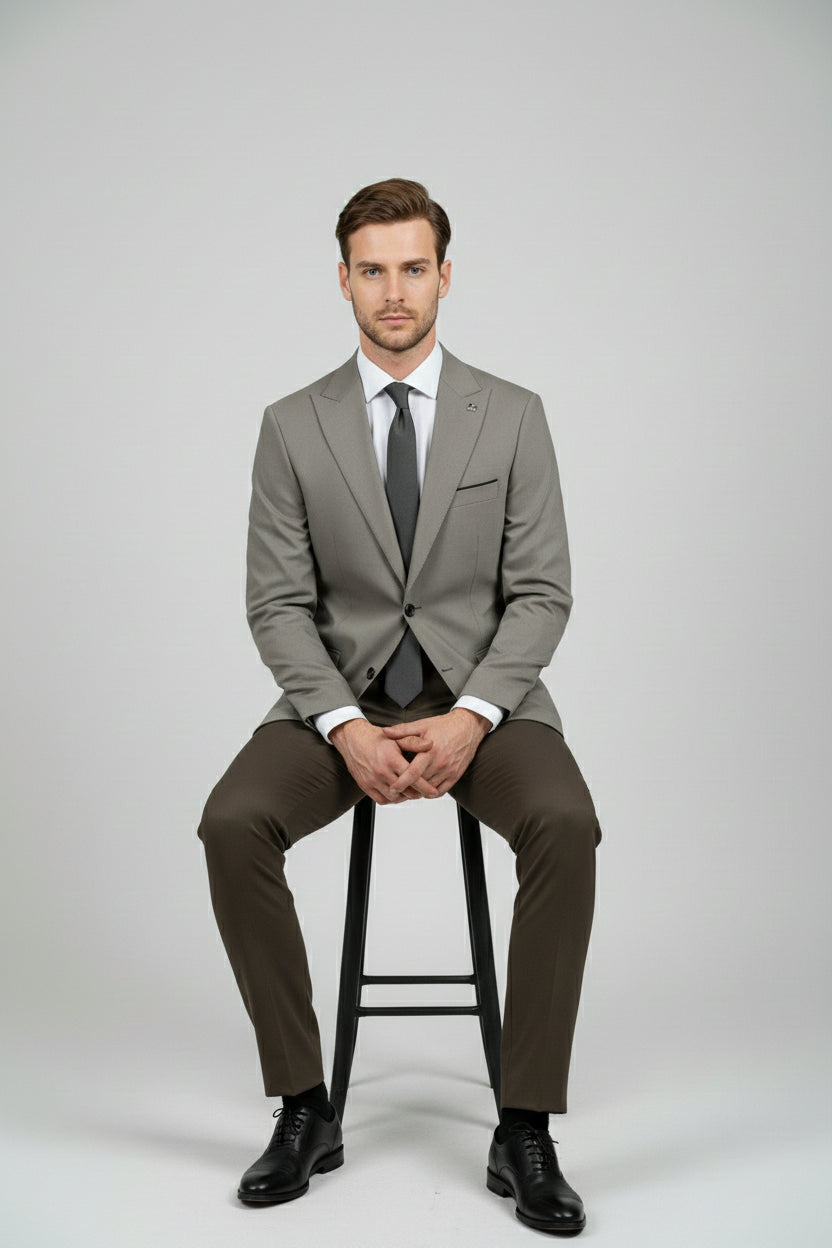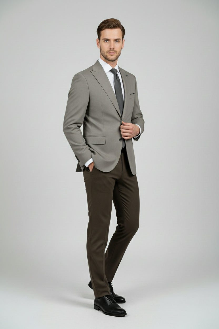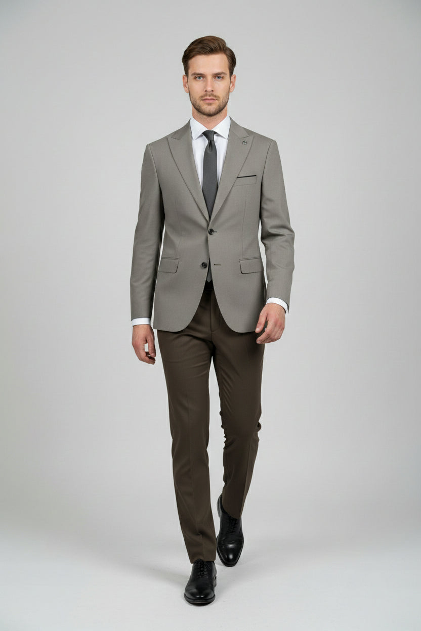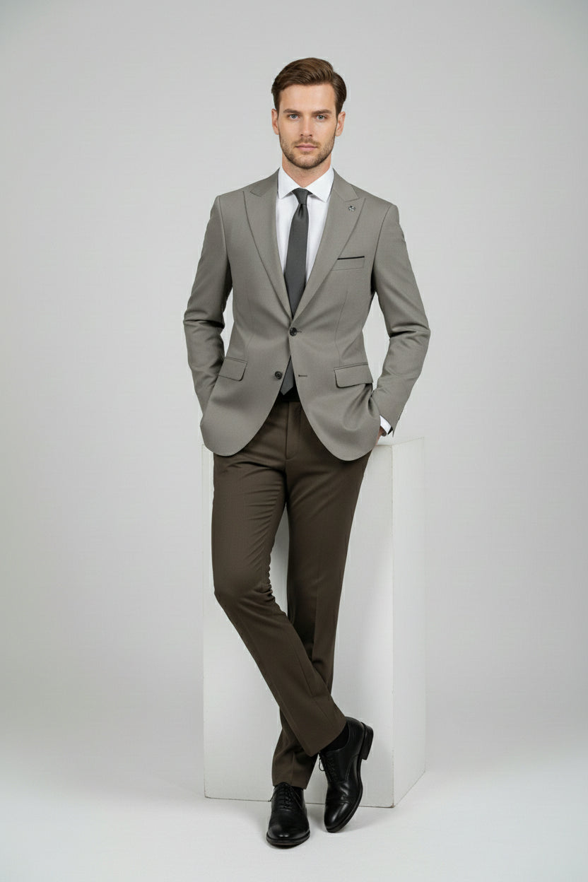 This taupe and brown combination two-piece suit offers a sophisticated balance between modern style and classic tailoring. The tailored single-breasted jacket features clean notch lapels, a structured profile, and refined pocket detailing, delivering a sharp yet understated look.